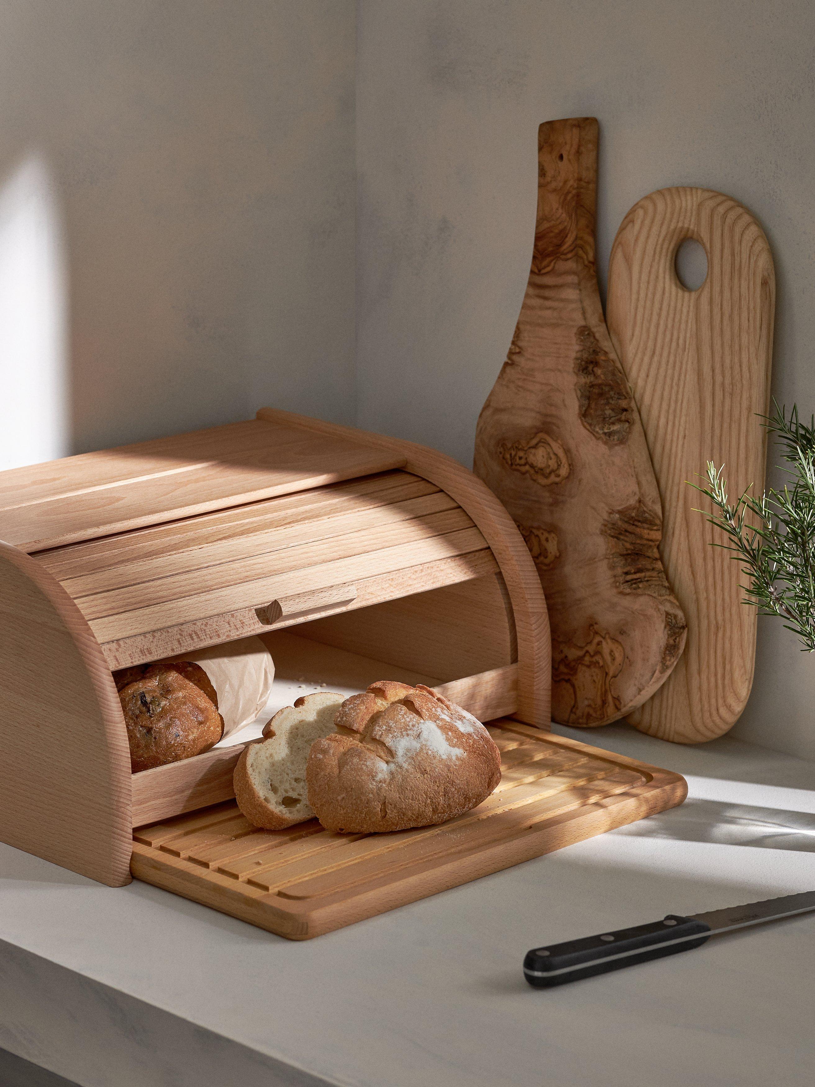 Solid beech wood bread bin with an easy-access roll-top front and a pull-out bread board for cutting loaves. The roll top opens smoothly and the flat top makes a handy shelf for extra kitchen storage. A classic-style bread bin with a design difference. The beech wood has been sourced from sustainably managed European forests.