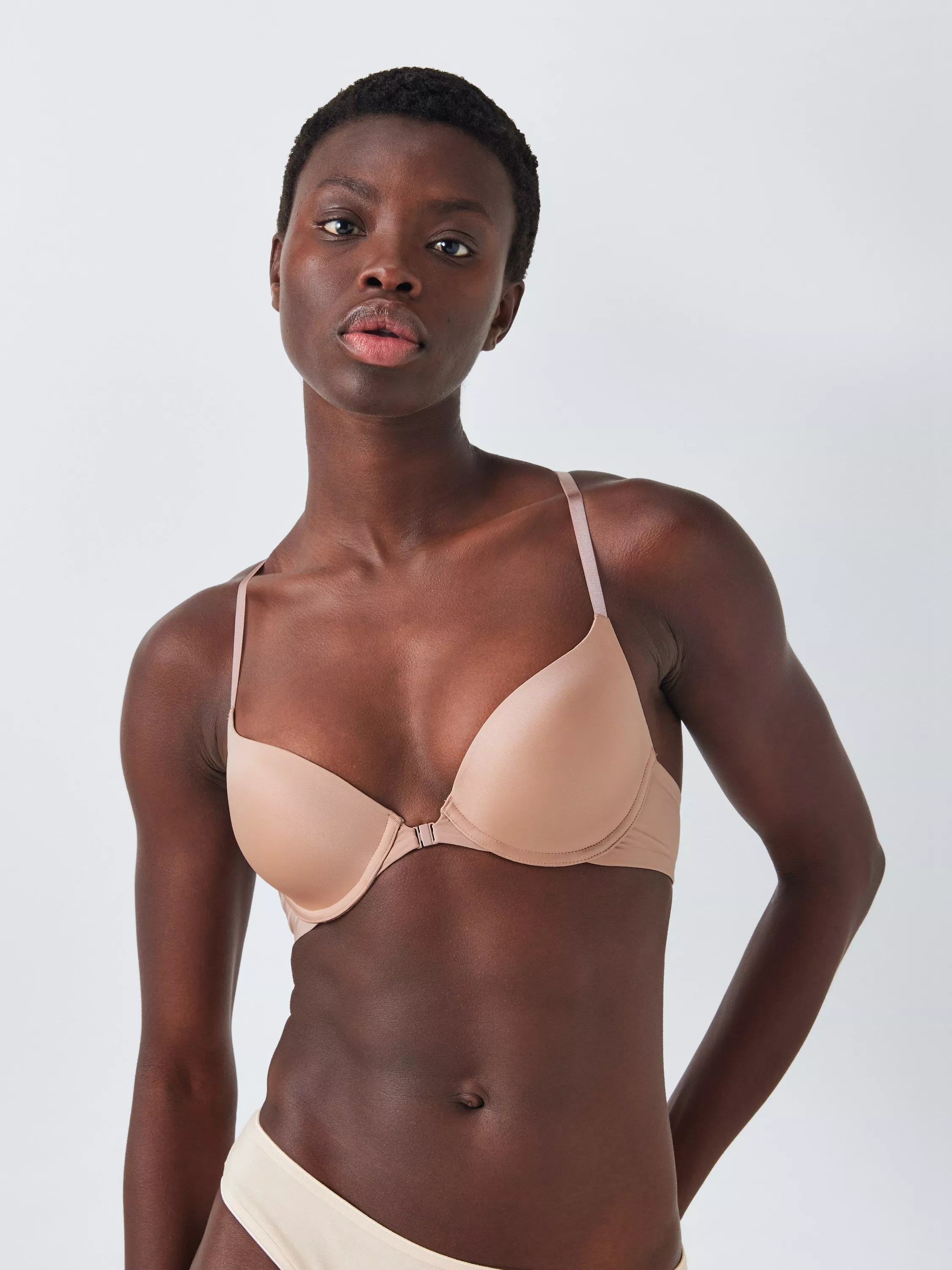 Romy is a front-fastening bra with smooth flat cups for invisibility under your clothes. Underwired for support and with push-up for shape, there's also a racer back hook for versatility in how you wear it. The straps split into a trio at the back for added appeal.