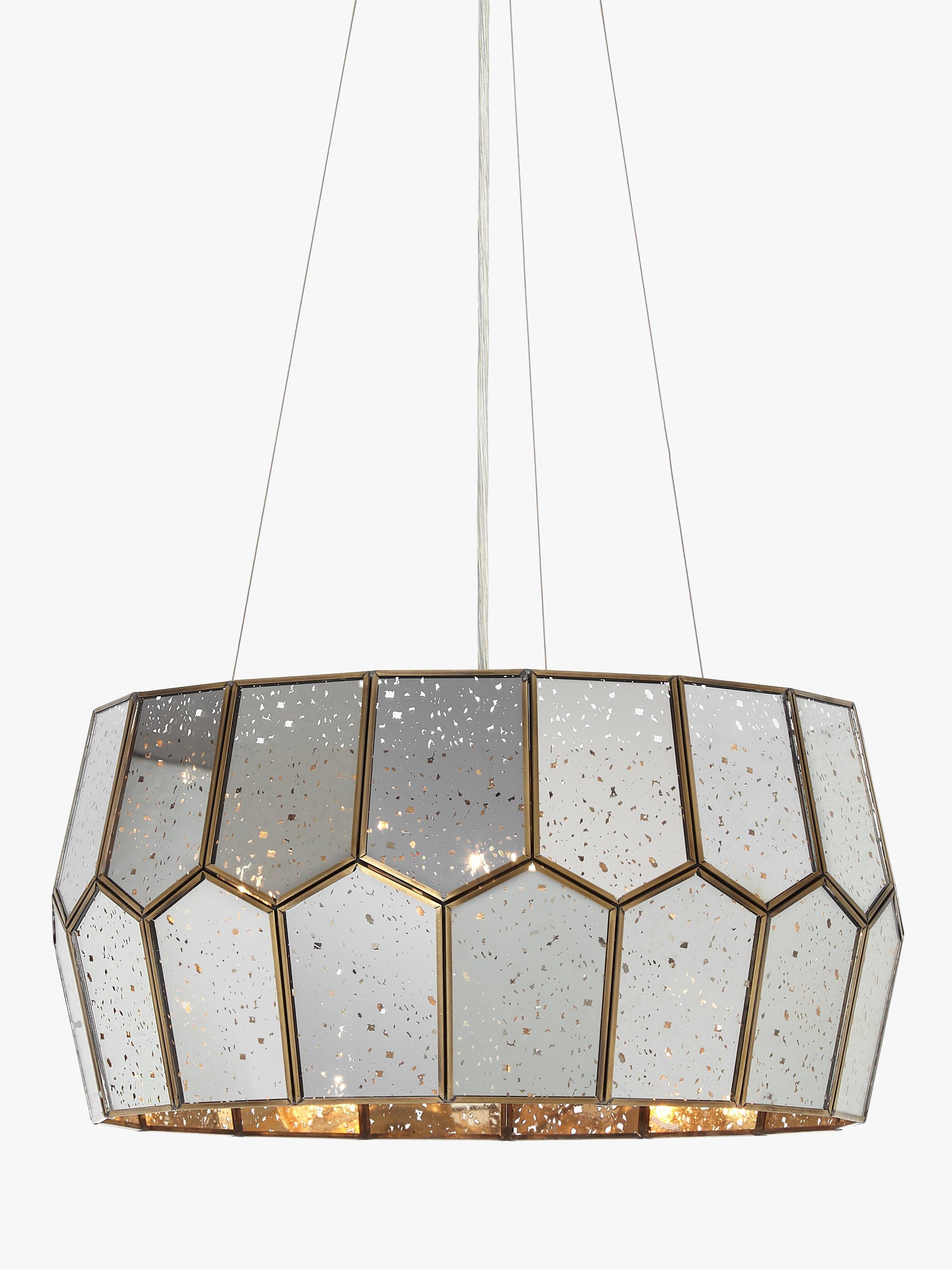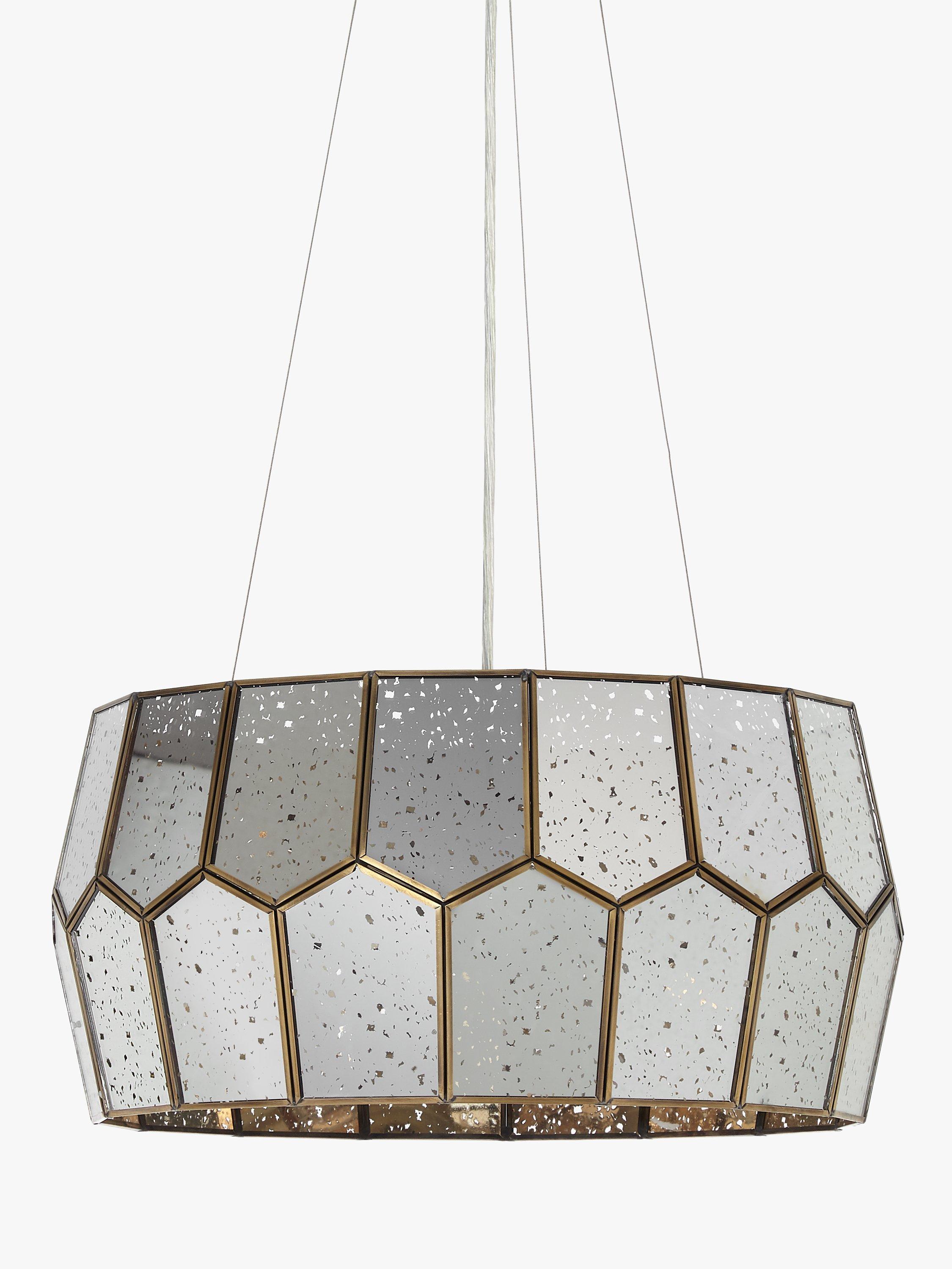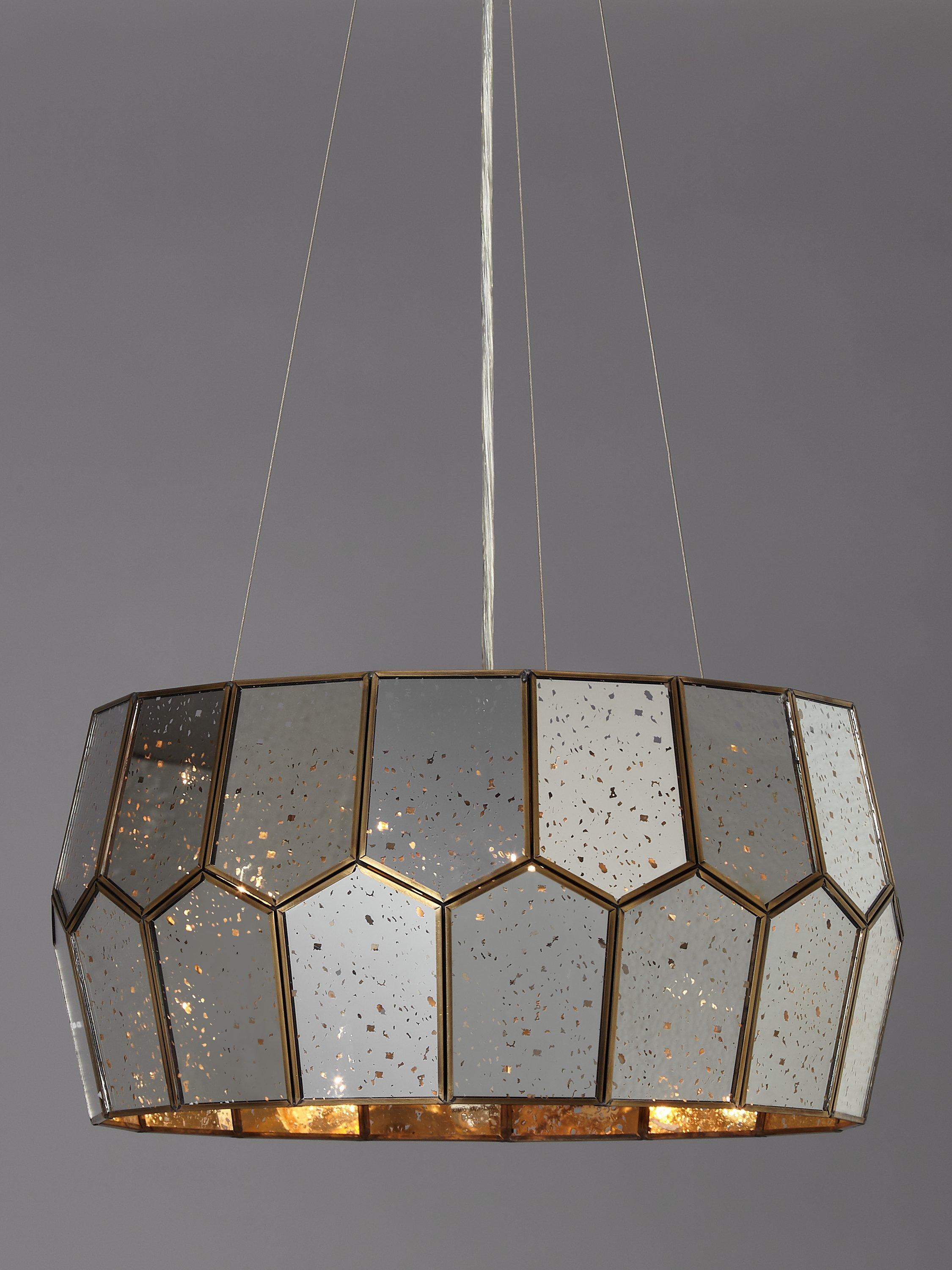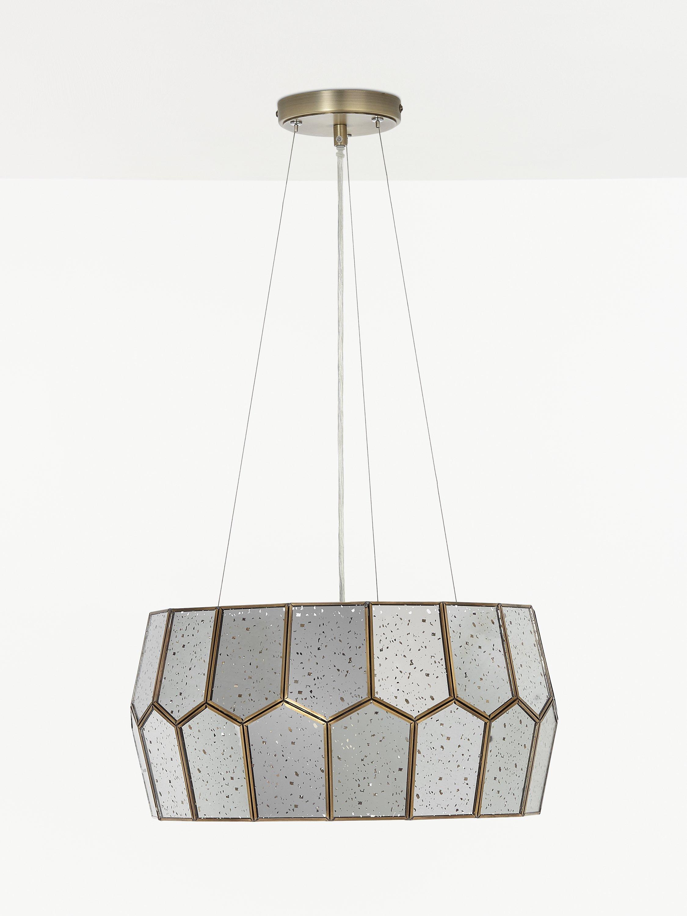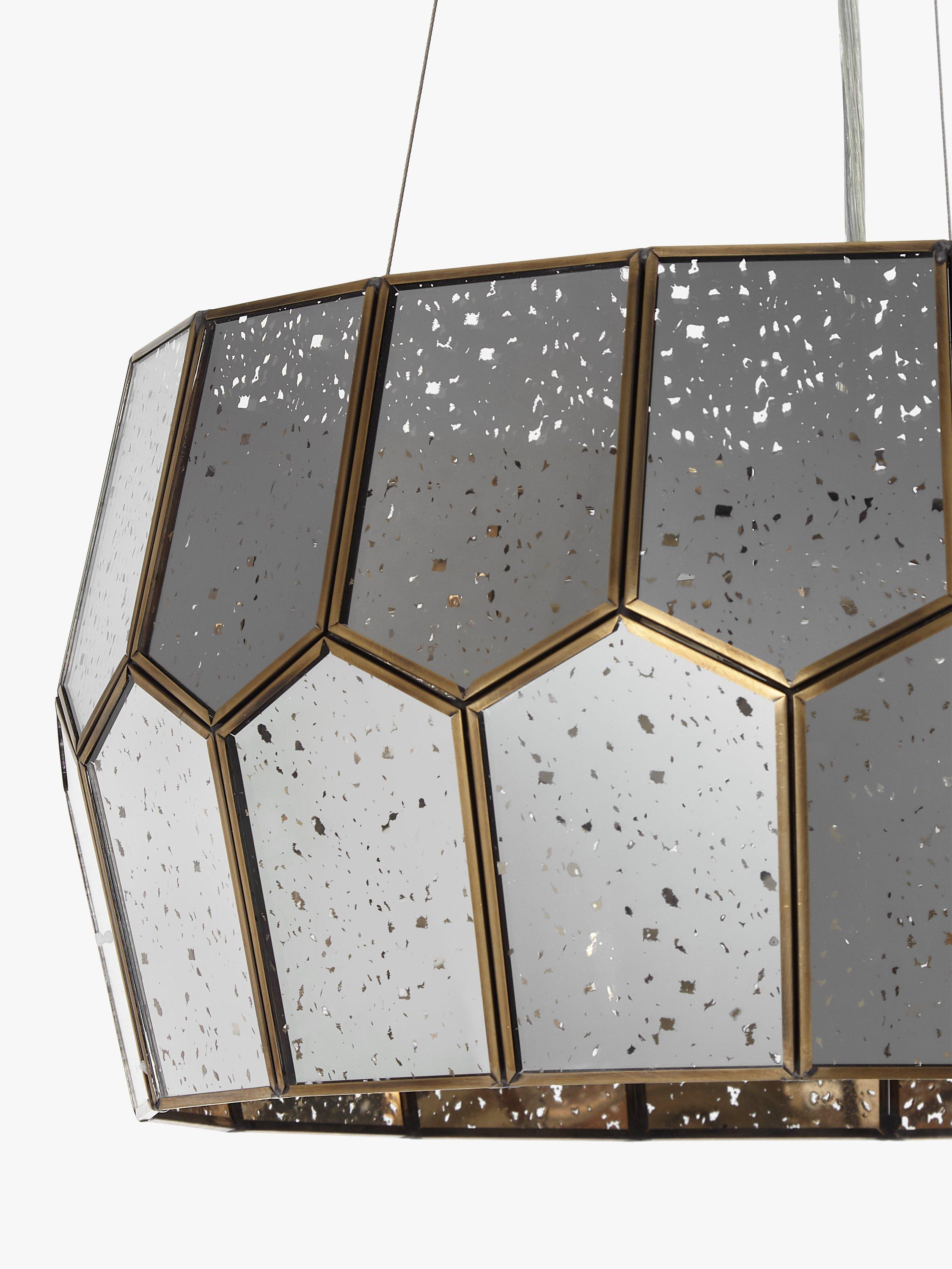 Made from mirrored glass, the pentagon shape of our Romy ceiling light has a striking modern style. Light shines through the distressed accents in the glass to create a warm, glowing effect when switched on, and it appears as a multi-faceted mirror when switched off, creating two different styles for your room. Available with an antique brass or stainless steel frame.