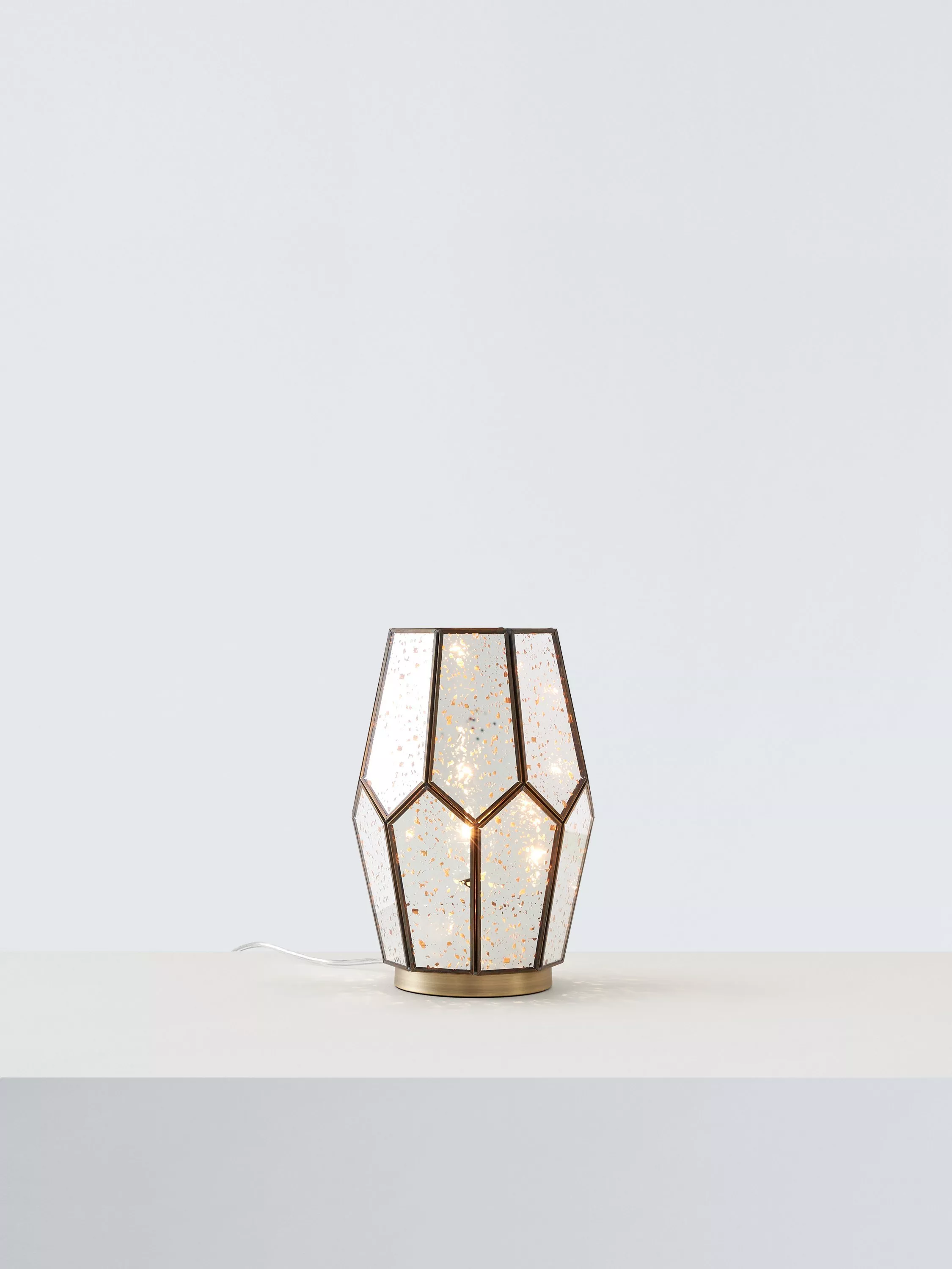 Made from mirrored glass, the geometric shape of the Romy table lamp has a striking modern style. Light shines through the distressed accents in the glass to create a warm, glowing effect when switched on, and it appears as a multi-faceted mirror when switched off, providing two different styles for your tabletop.