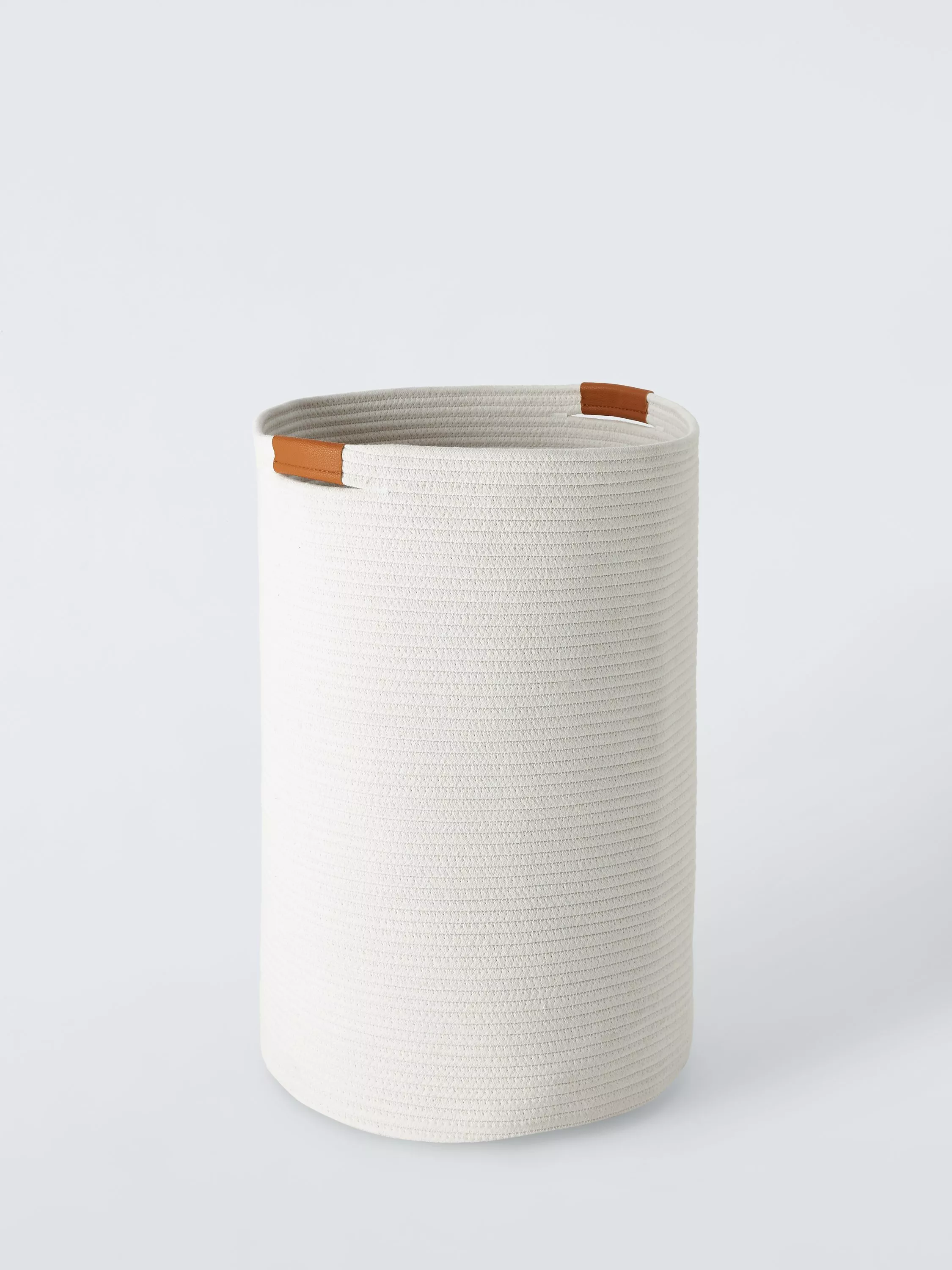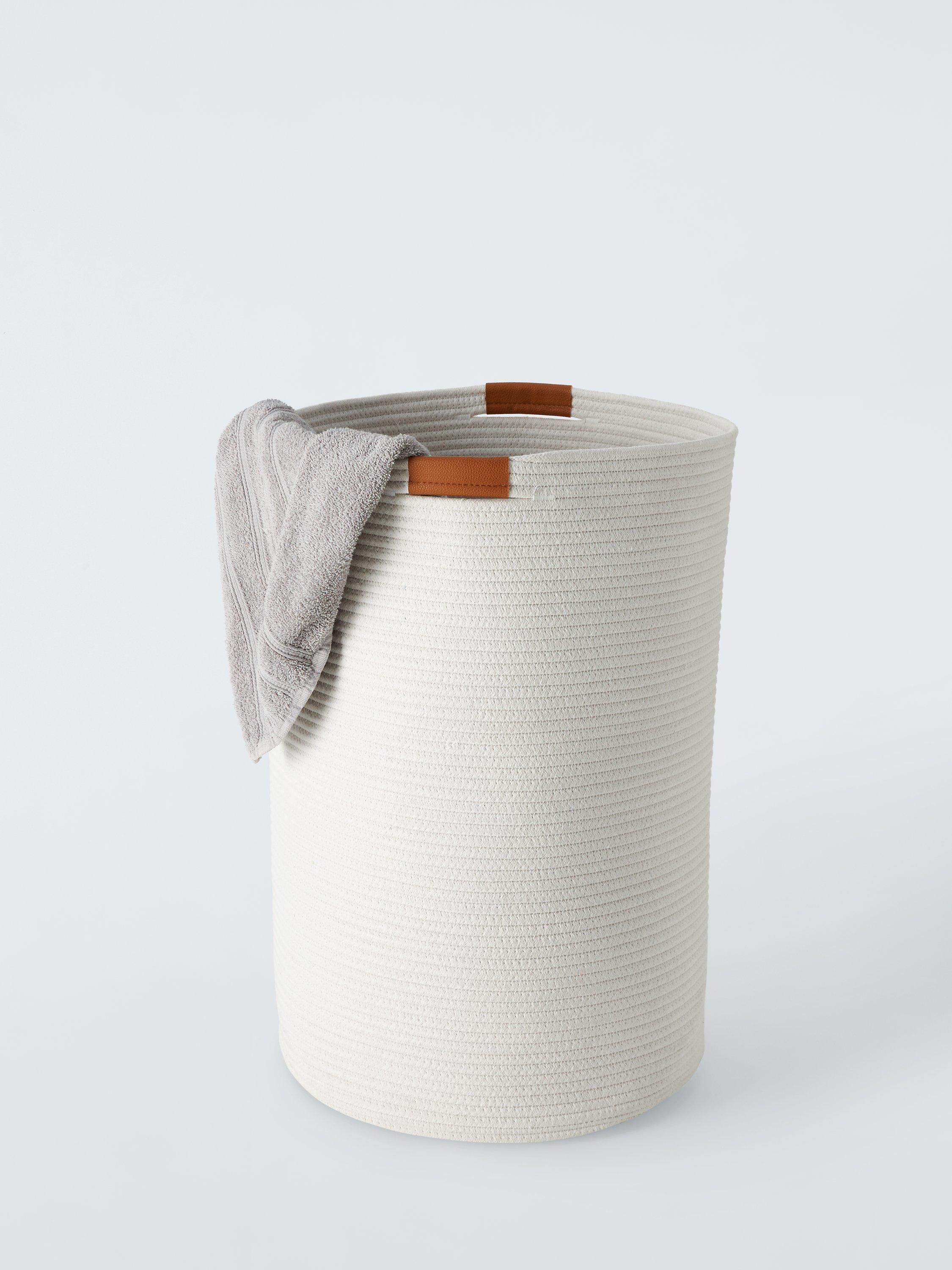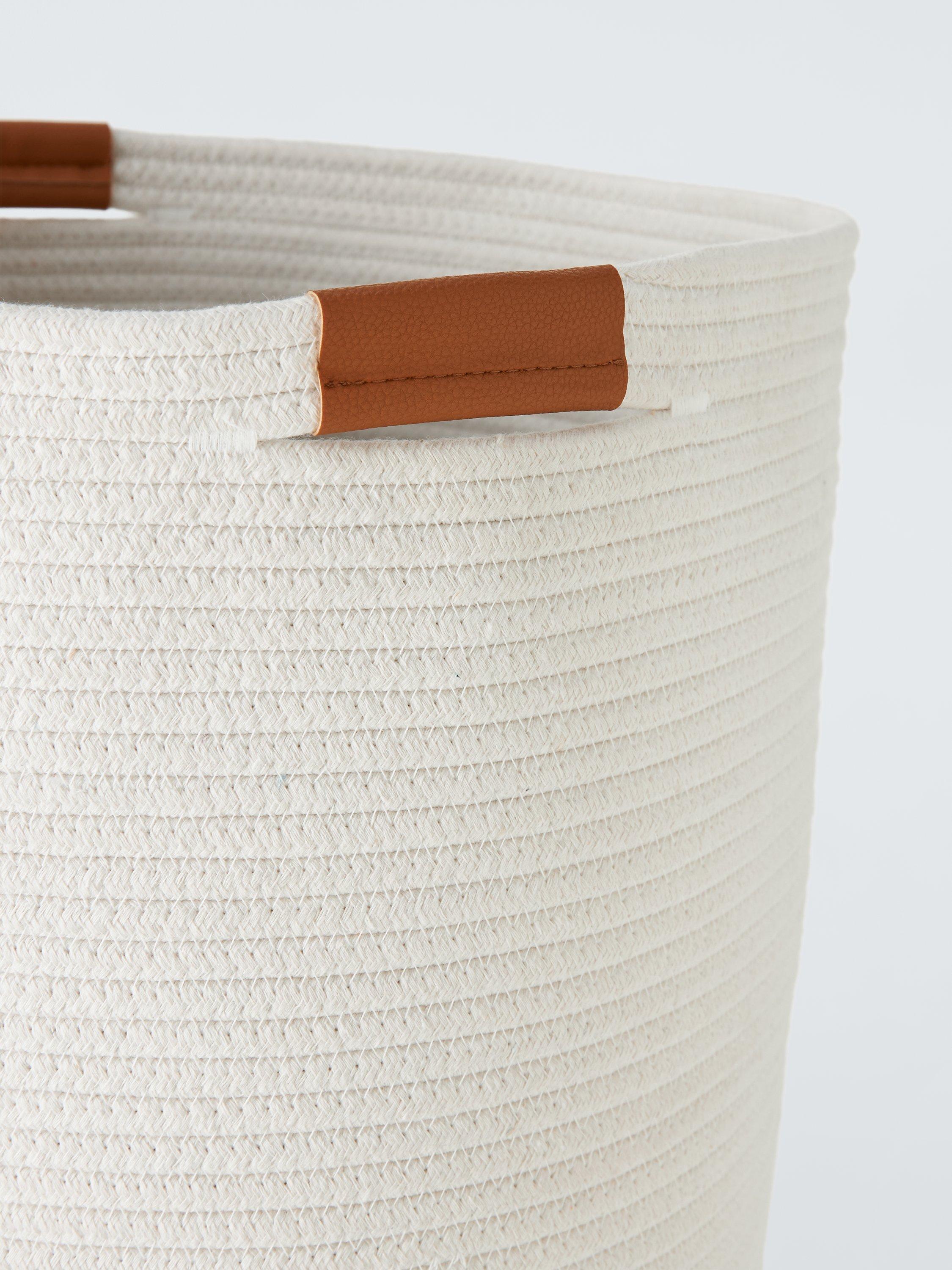 Rope laundry basket with a woven stripe-like texture and smart faux-leather handles.