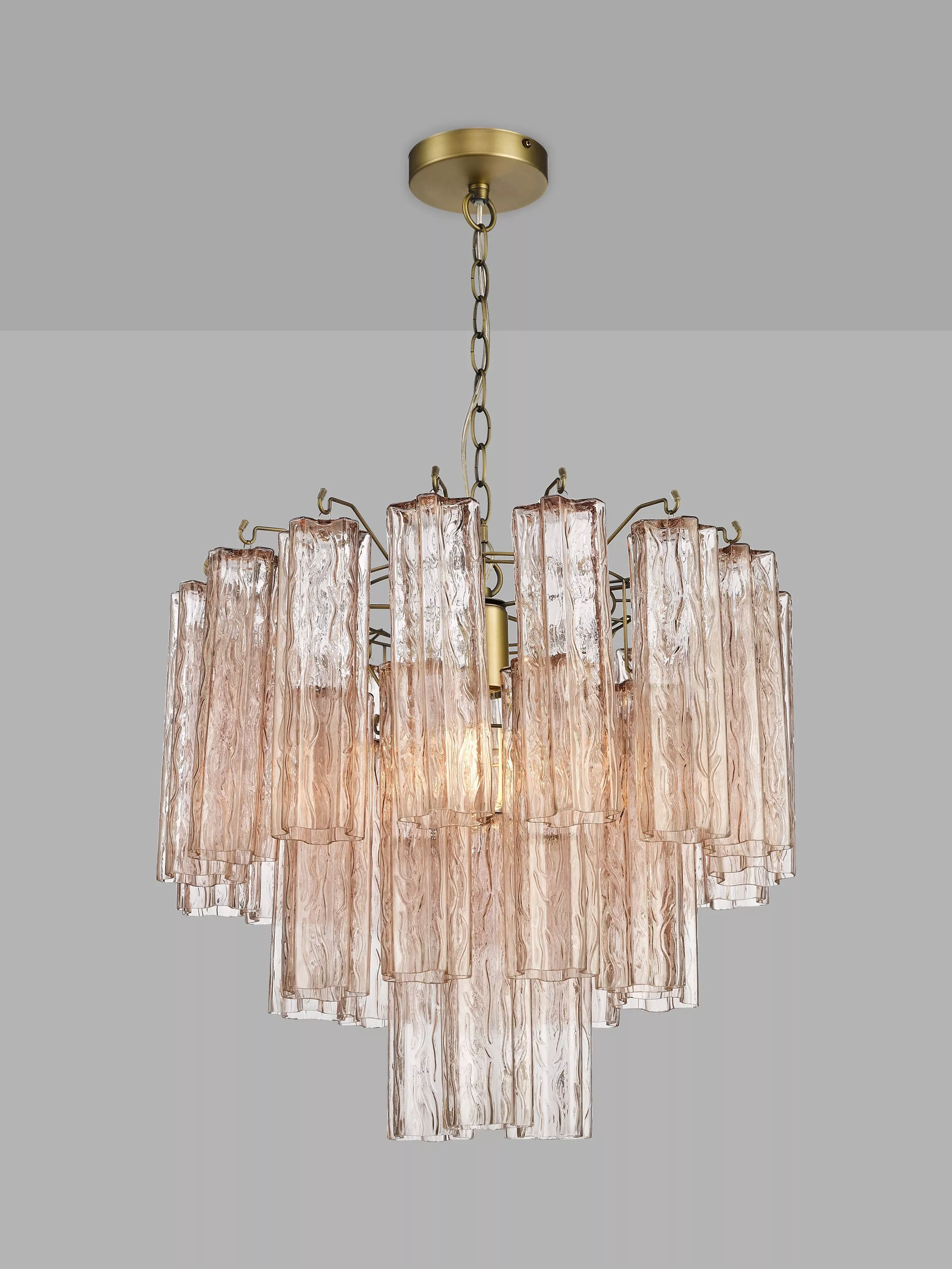 This beautiful ceiling light will steal attention in your home. We've made it from fluted cylinders of blush pink-tinted textured glass which has a subtle ombre effect. The glass droplets cascade in a waterfall effect that's soft and delicate in style. Plus, antique-brass finished metal nods to a vintage look. It's a brilliant way to introduce colour and texture into your space, while drawing your decor together.