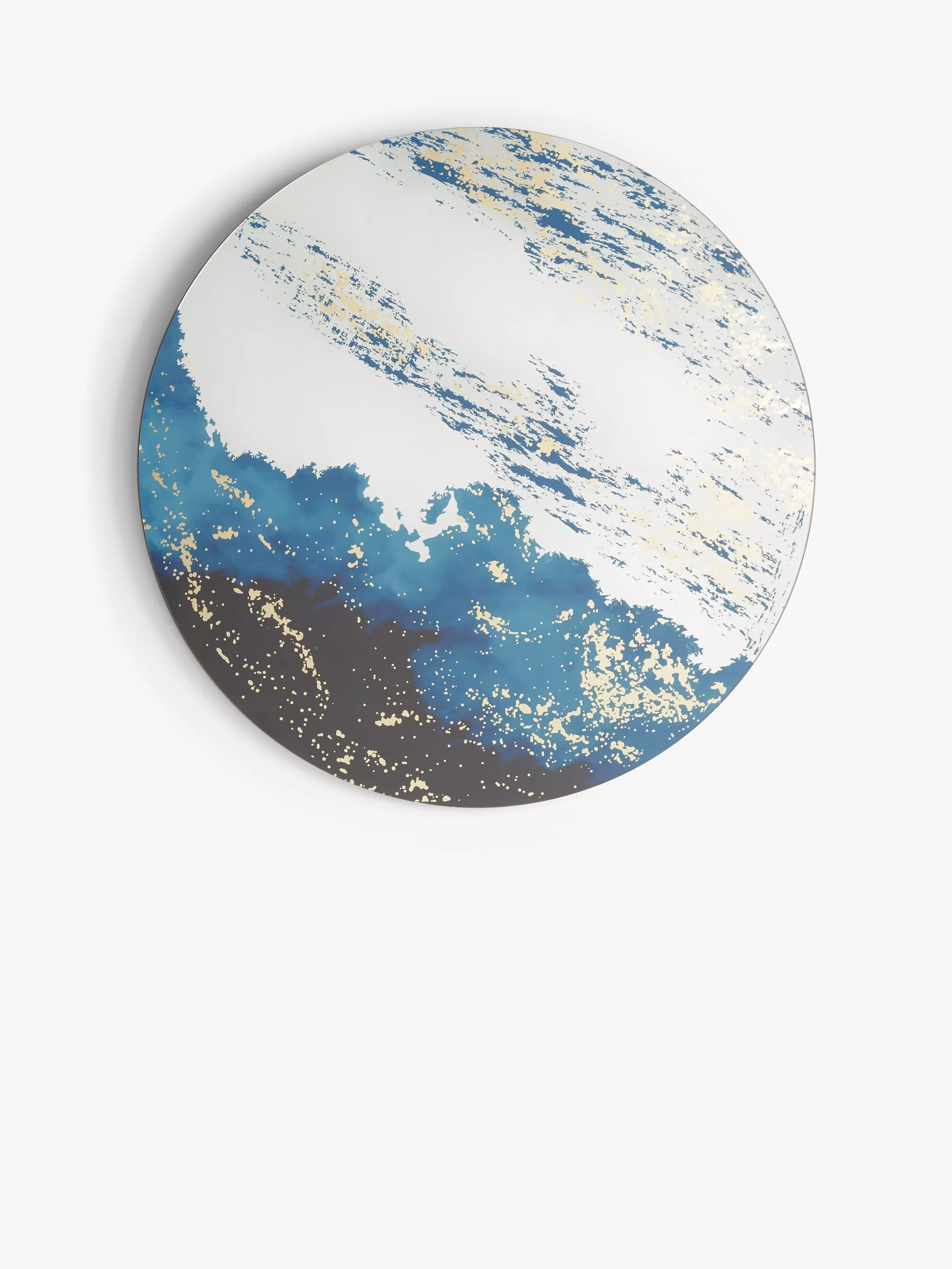 Made of glass, our round decorative Art mirror has a colourful front with an abstract design and metallic highlights. This mirror is ready to wall mount by the attached D-ring fittings on the back.