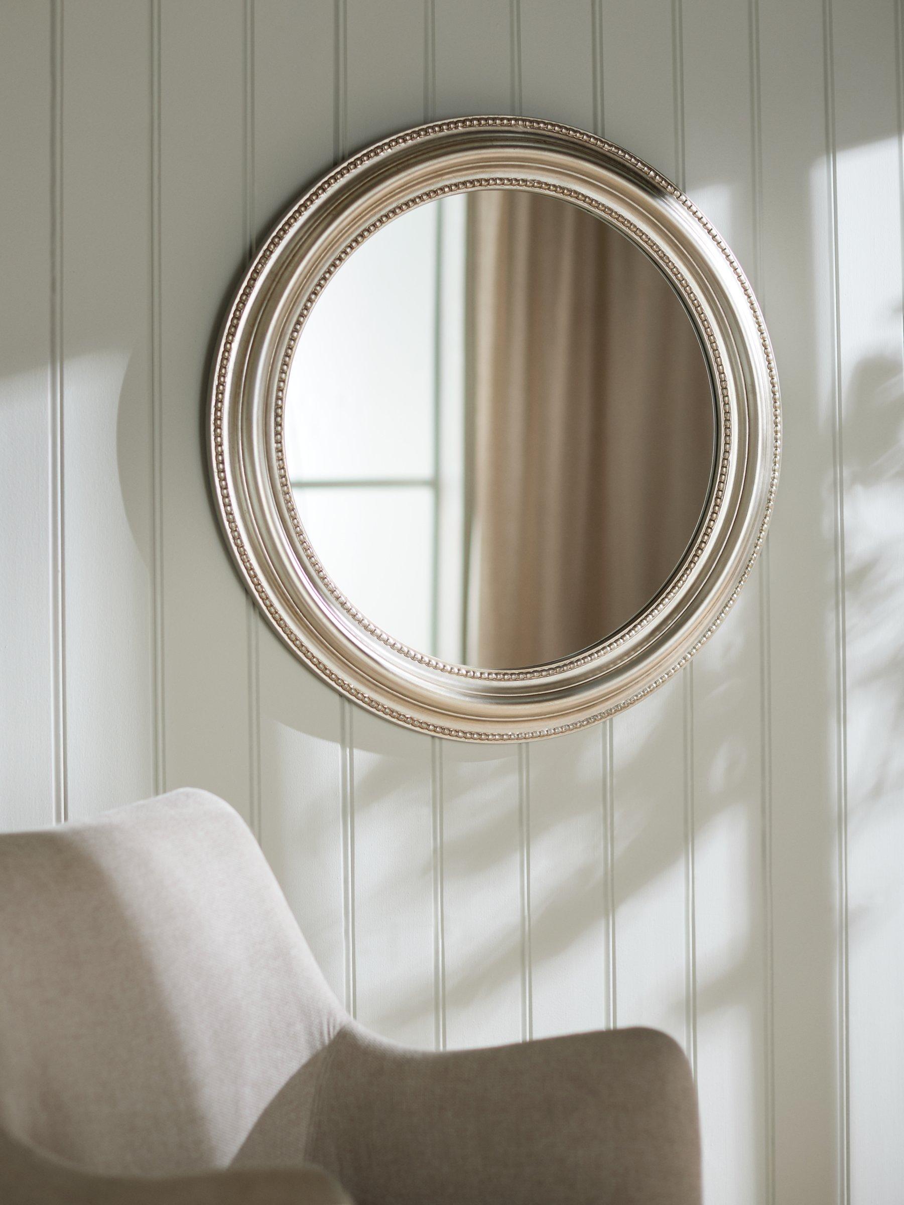 Featuring an elegant metallic frame with exquisite bead detailing, this round, decorative piece will bounce light around your room, while adding a hint of retro glamour.
