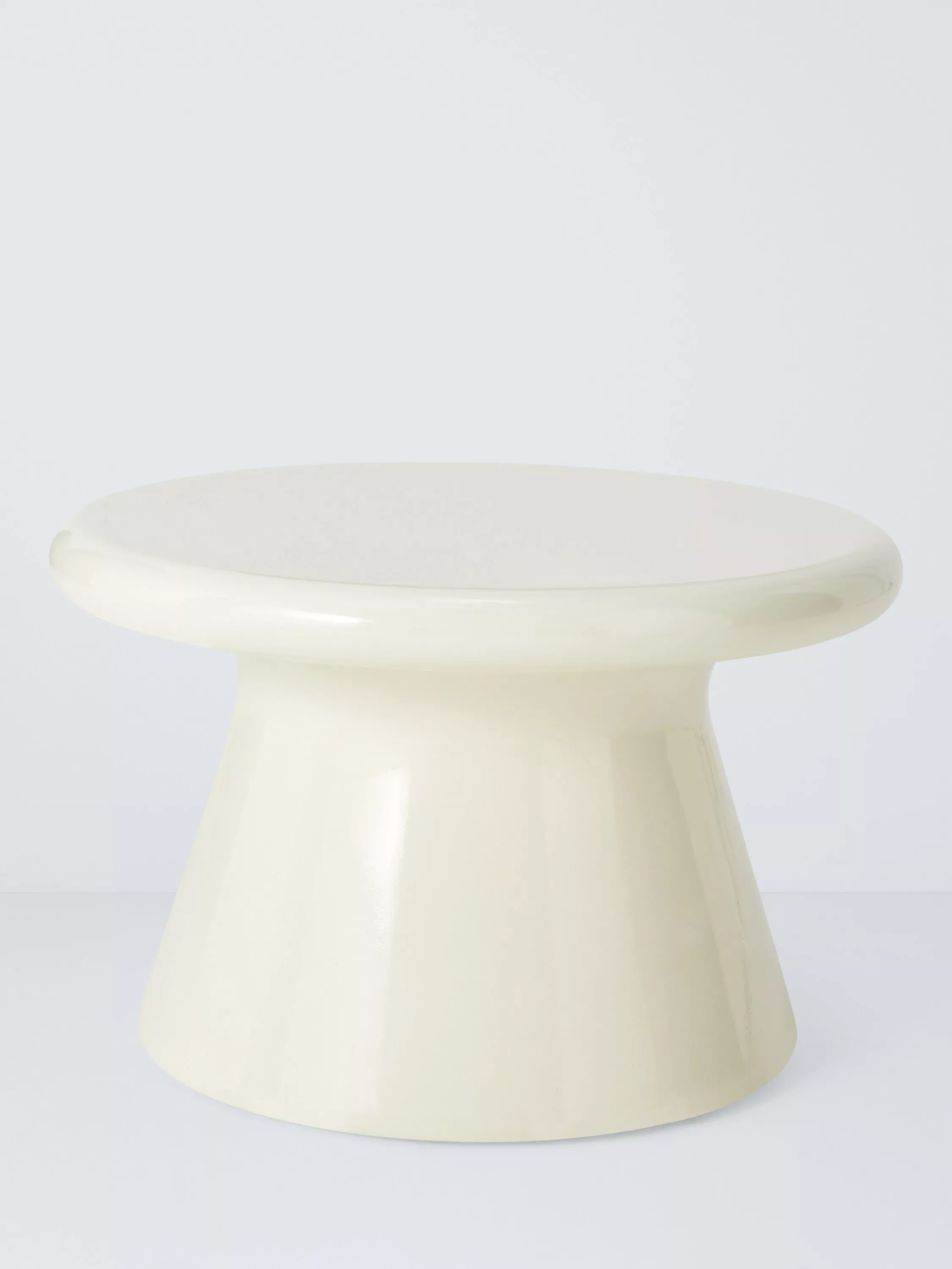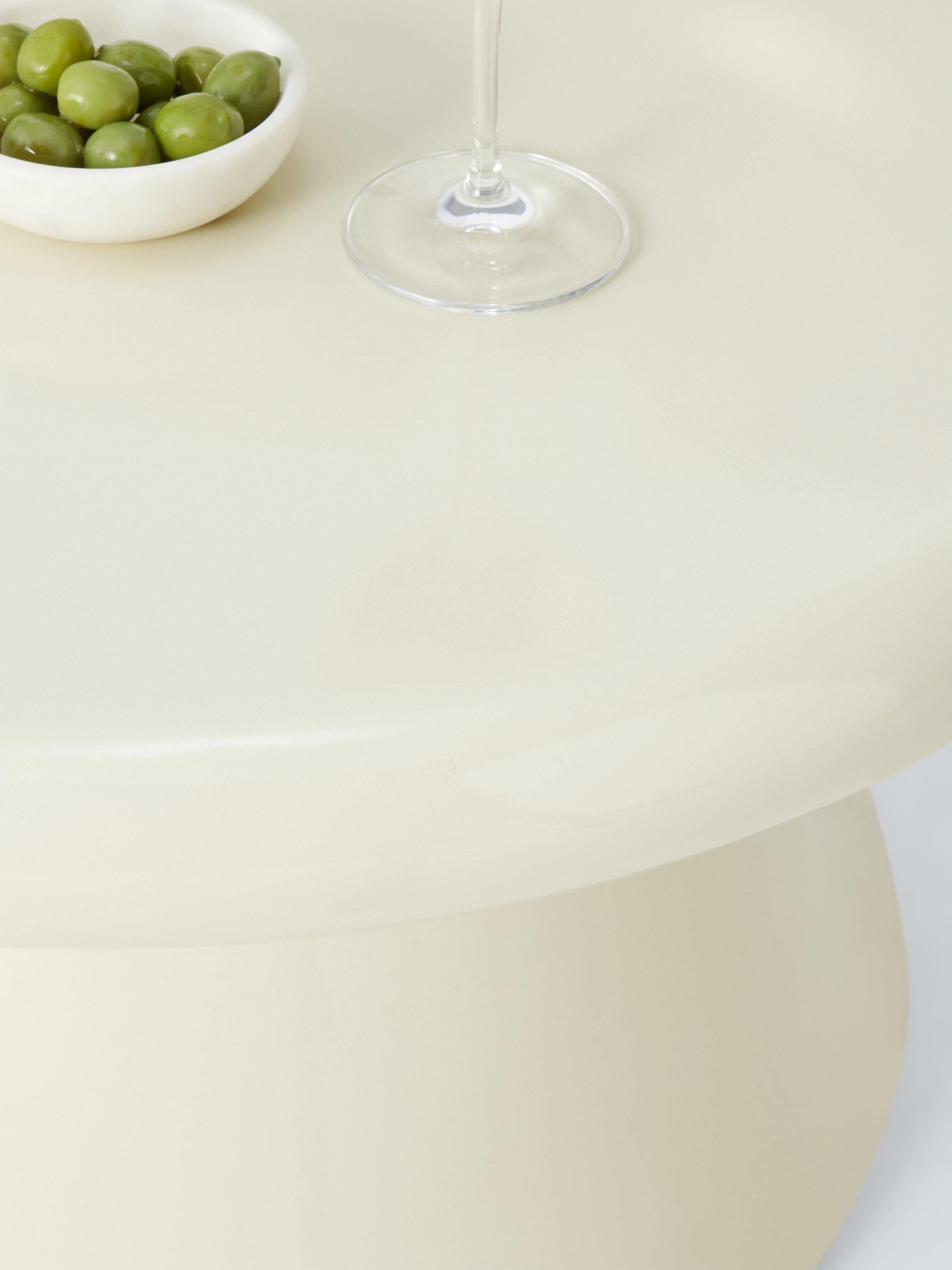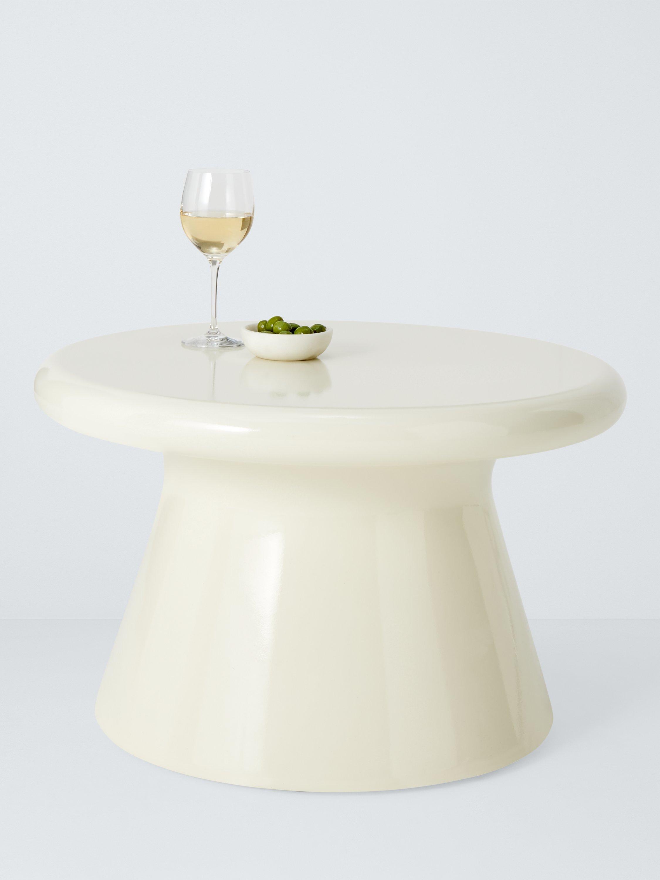 Contemporary garden coffee table made using concrete-like material to create a fluid shape. A solid-looking design that's relatively light in weight compared to standard concrete and much easier to move. The material is robust, durable and corrosion-resistant, making it ideal for use in the garden.