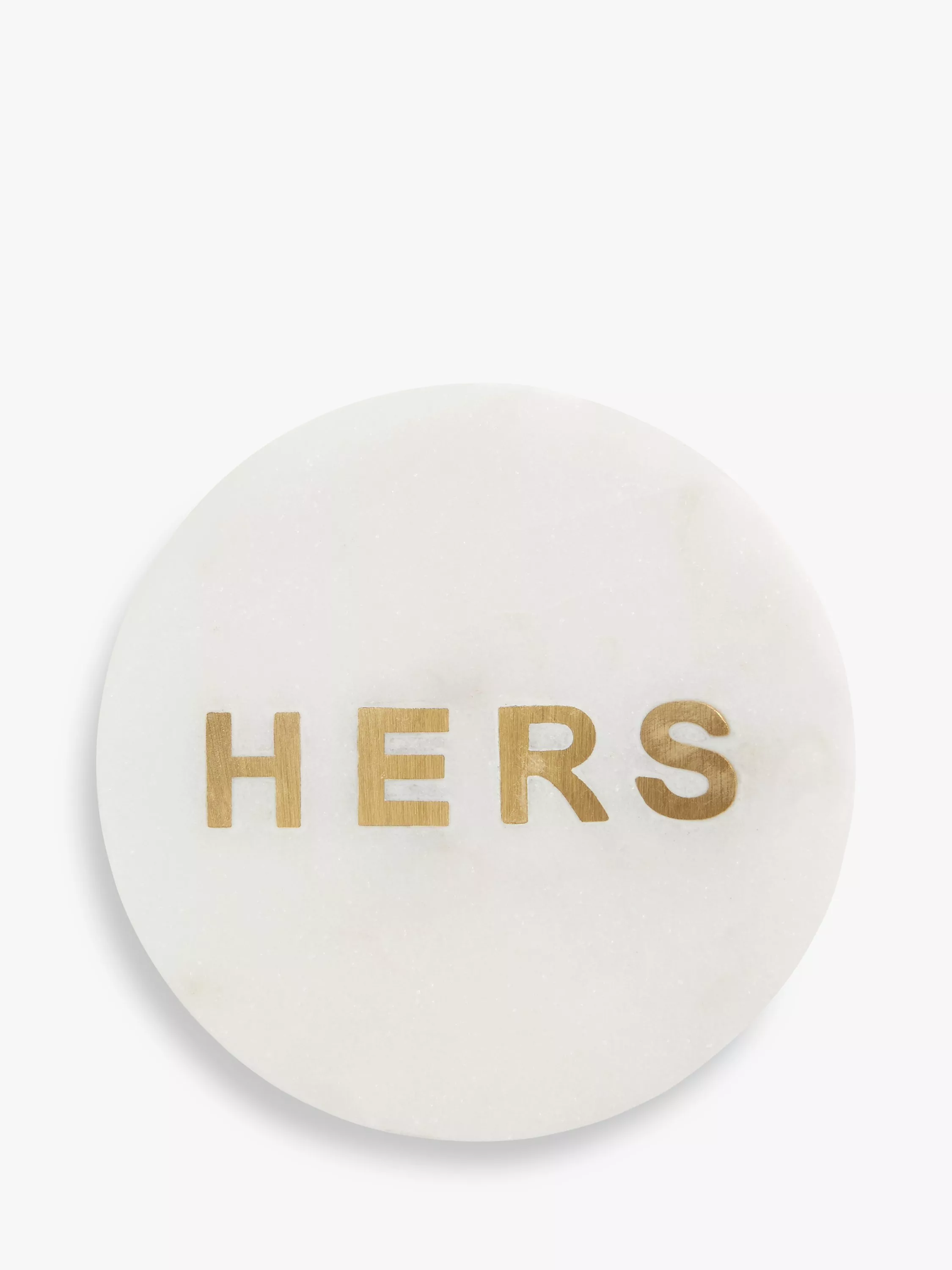 Made of white marble, this giftable coaster is inlaid with 'Hers' lettering in brass. Durable and low maintenance, it's easy to keep clean and both a practical and decorative way to protect table surfaces from hot and cold drinks.