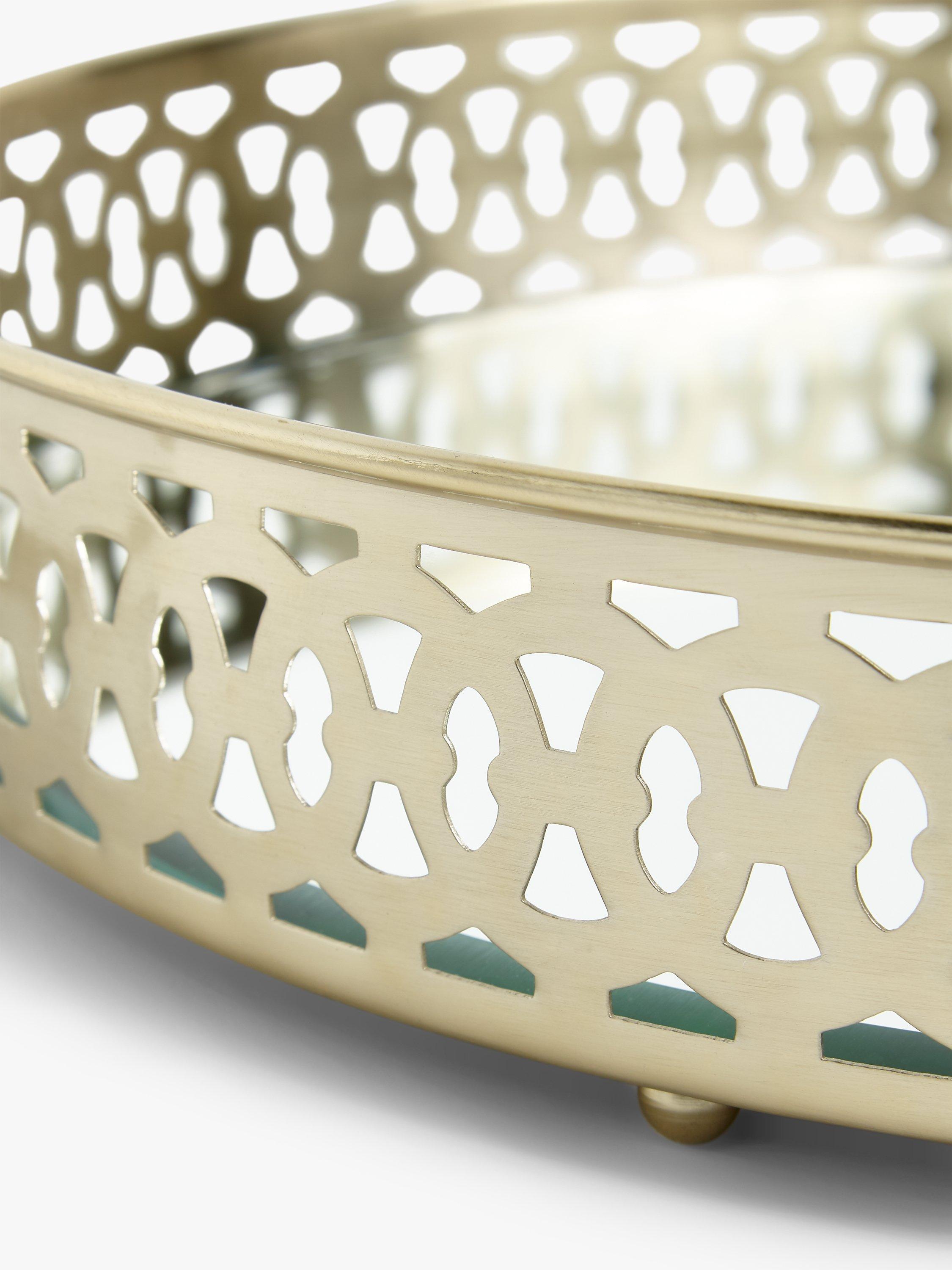 A stylish way to serve cocktails and other drinks, this round metal tray has a mirrored base. Ornate detailing on the border and a gold-toned finish create an opulent look.
