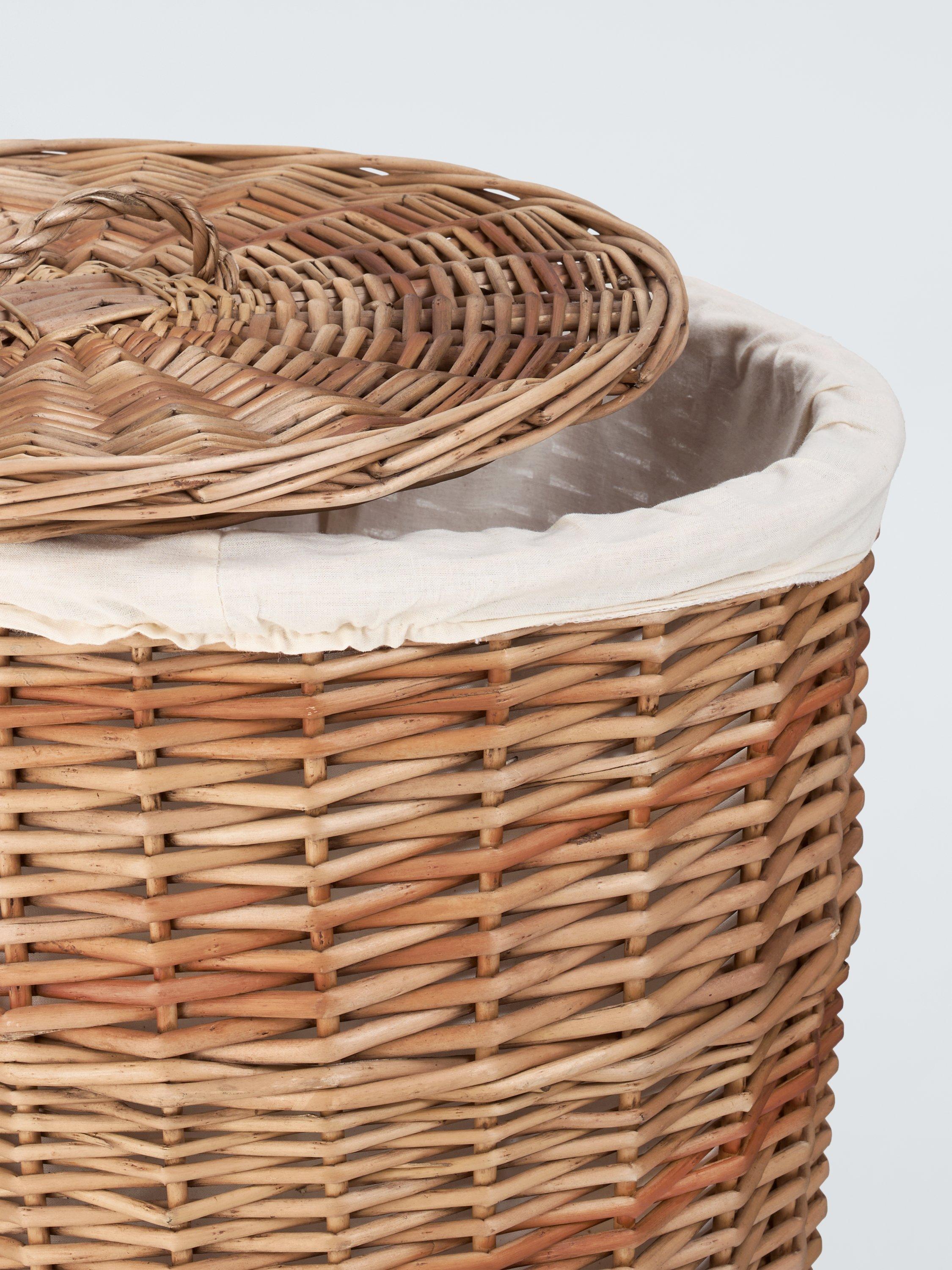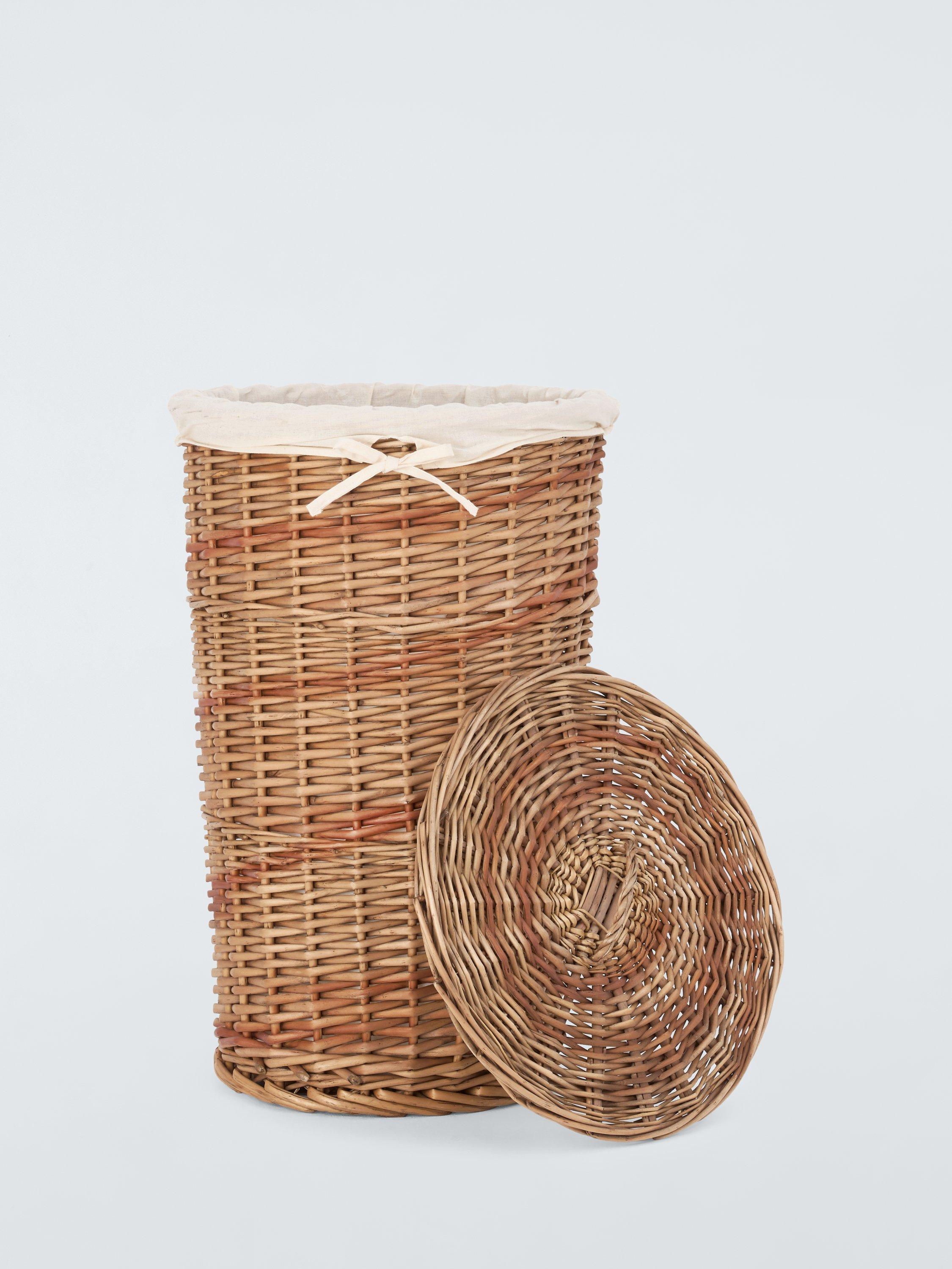 This lidded laundry basket features a brown spiral pattern and comes with a drawstring liner that can be removed for washing.