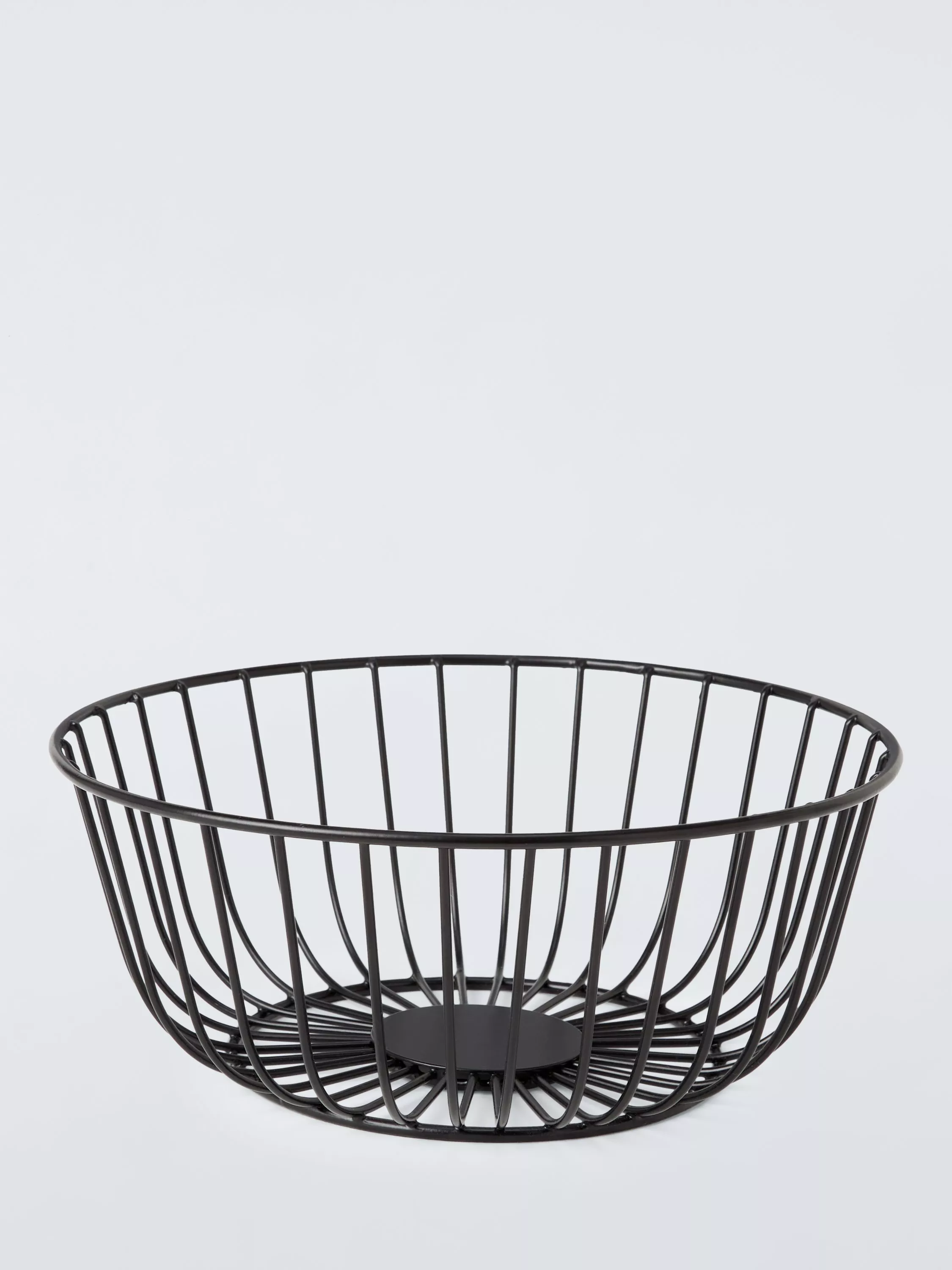 Round wire basket, a contemporary design for serving bread or displaying fruit.