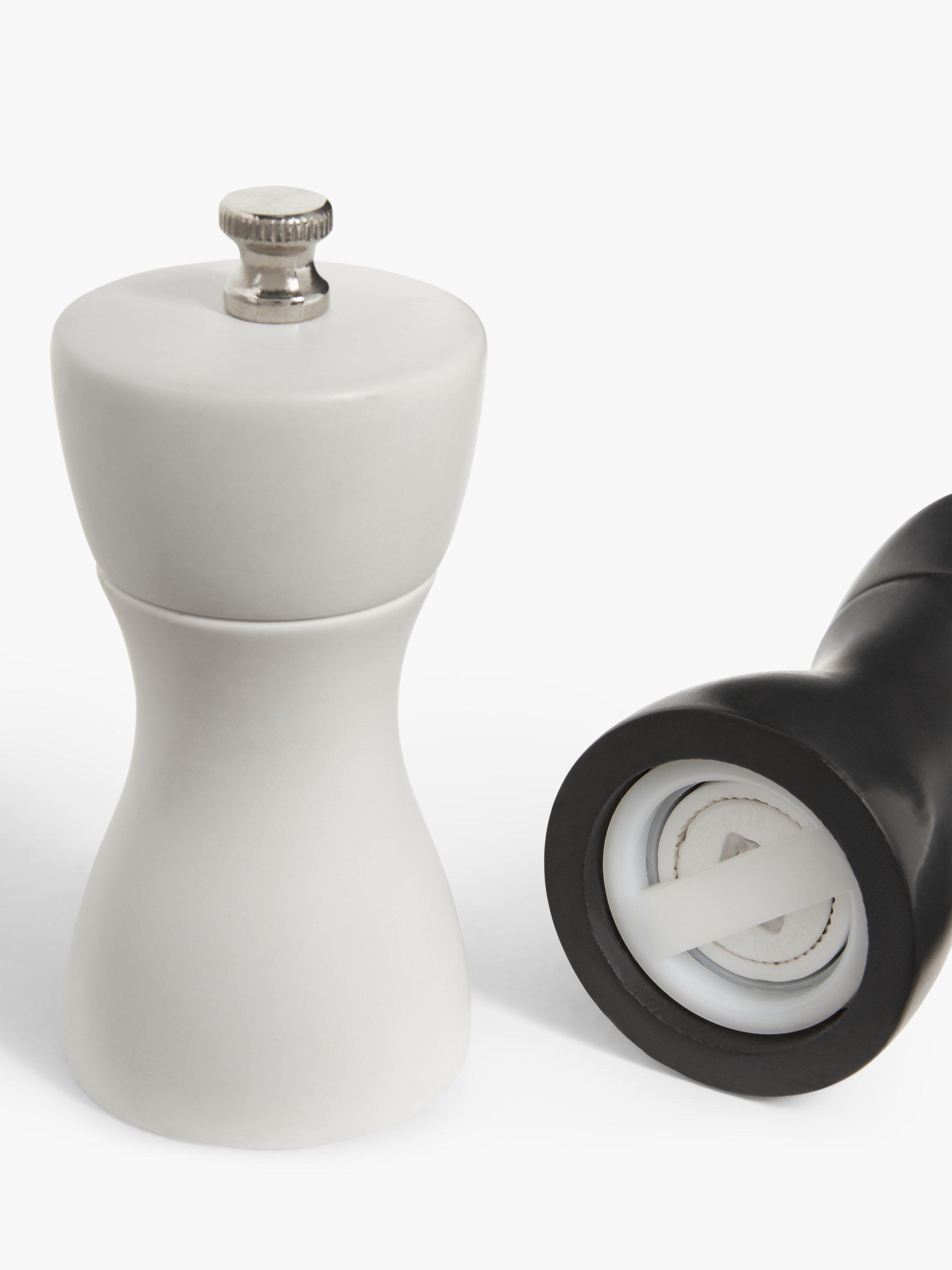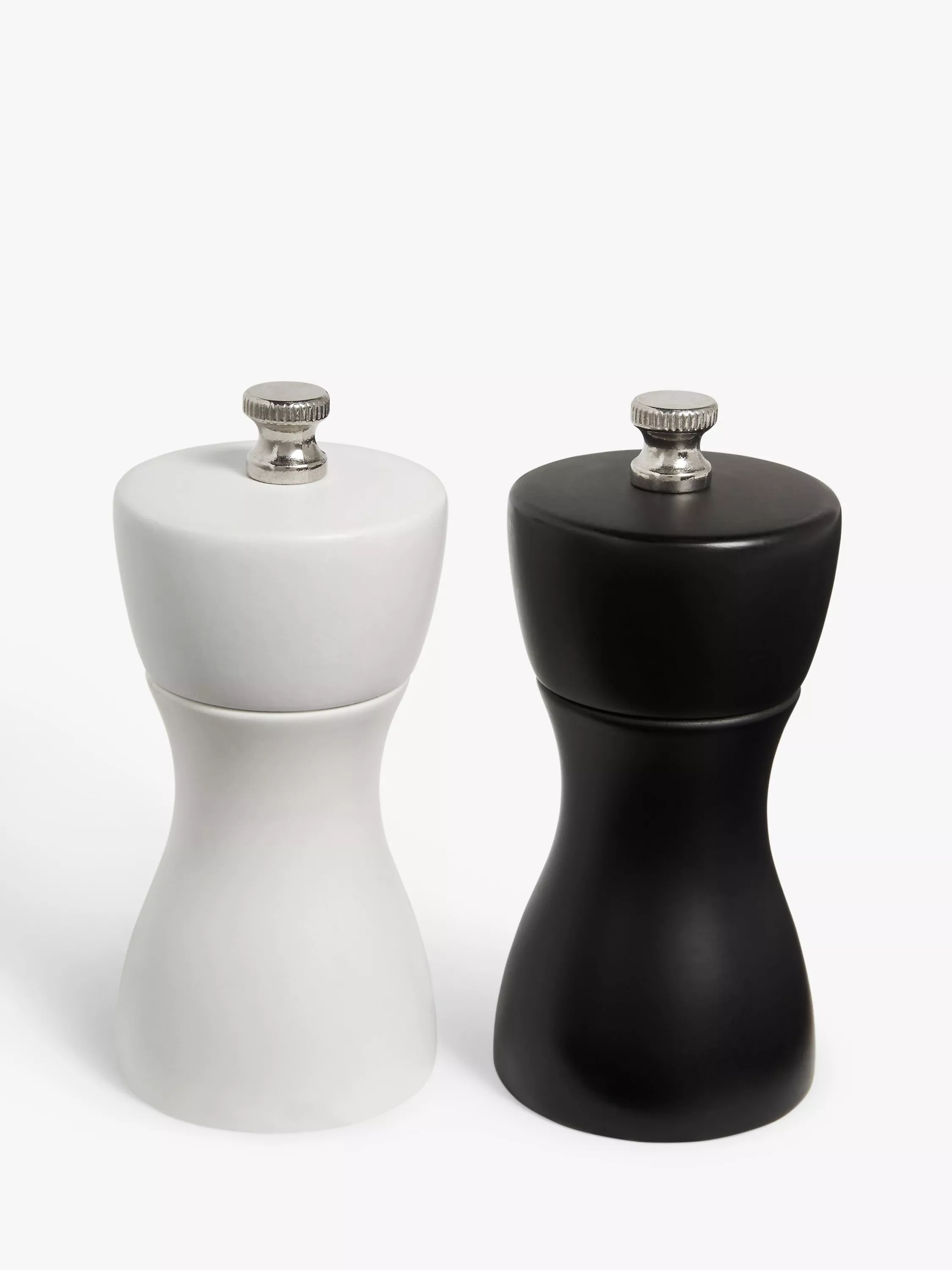 Twist to grind with this pair of salt and pepper mills, made of rubber wood and finished in black and white. Easy to use, the mills have corrosion-resistant ceramic grind mechanisms for durability. Adjust the grind from coarse to fine to suit your taste.