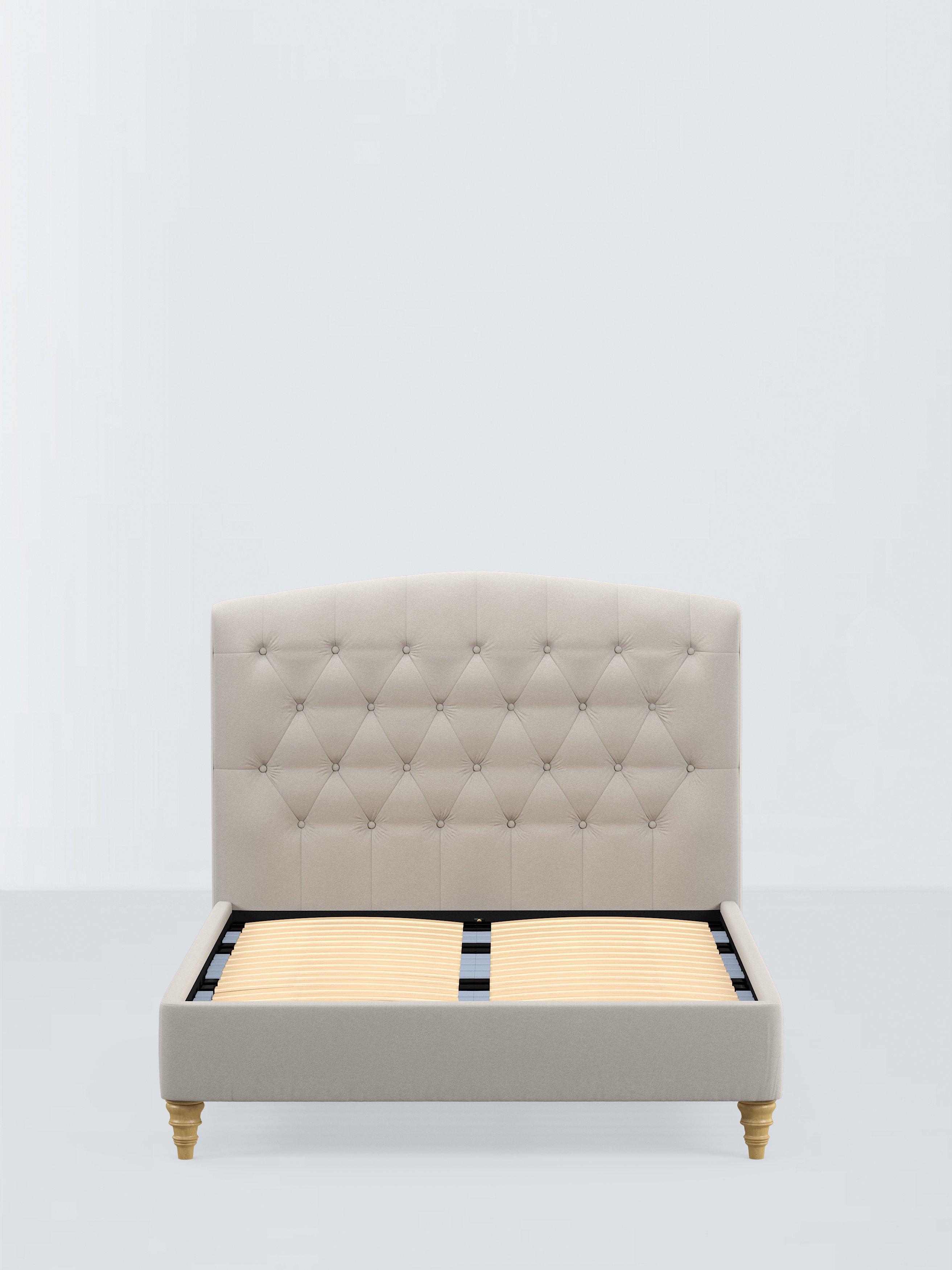 The design of our Rue bed frame is timeless and sophisticated. We've added button detailing to the headboard and supported the frame with low, twisted legs made from high quality wood. There are also supportive sprung slats in the base.