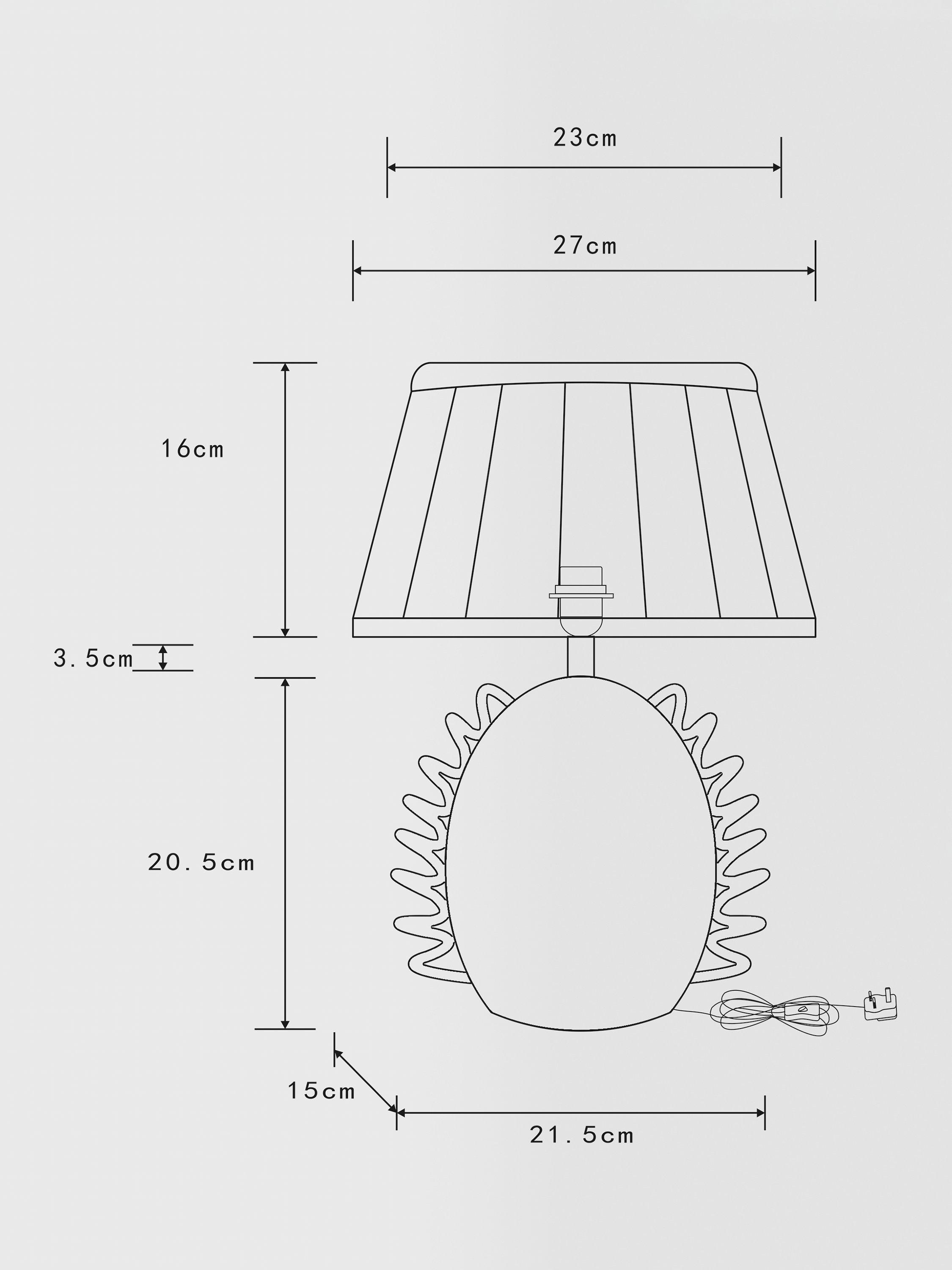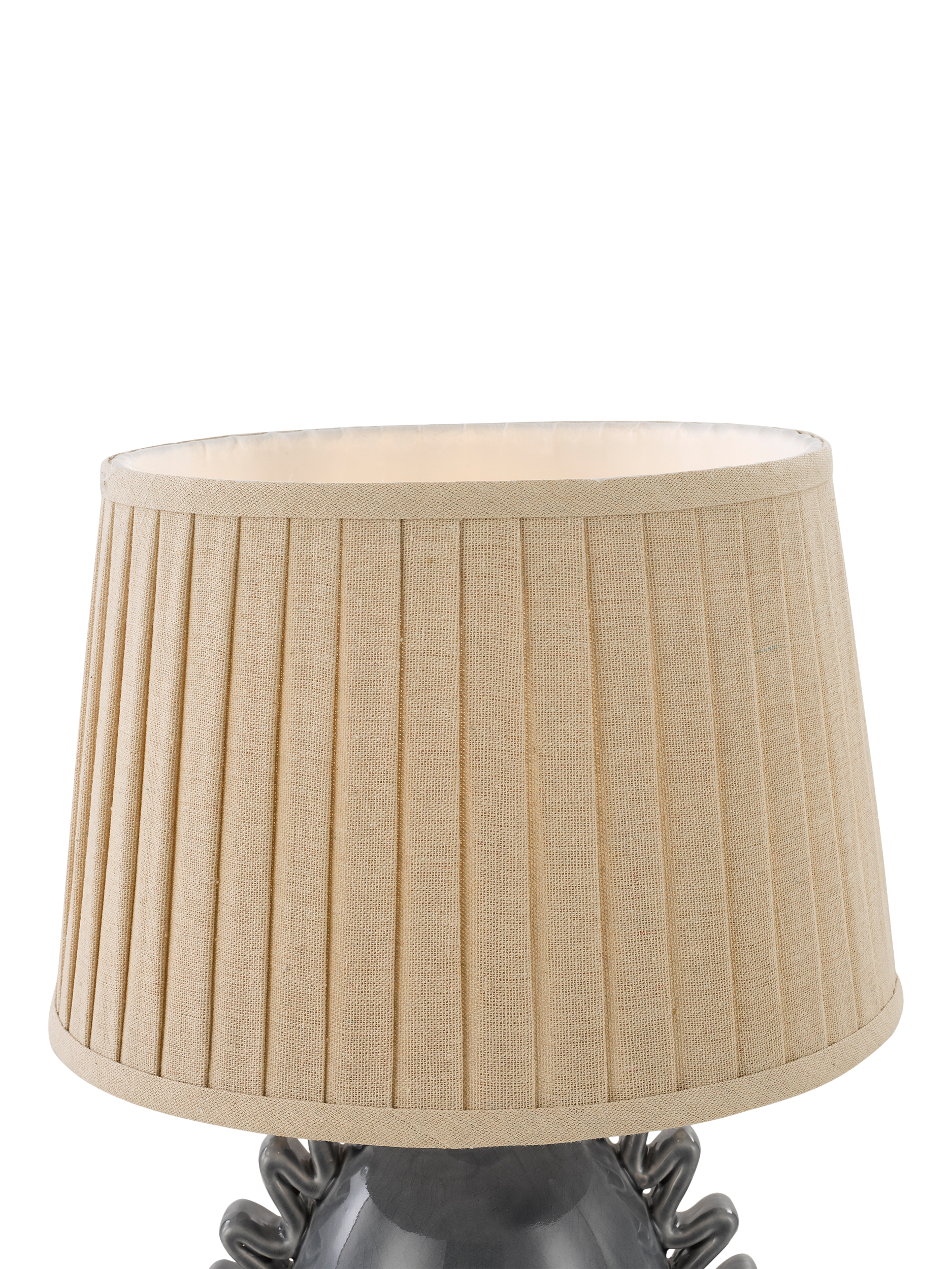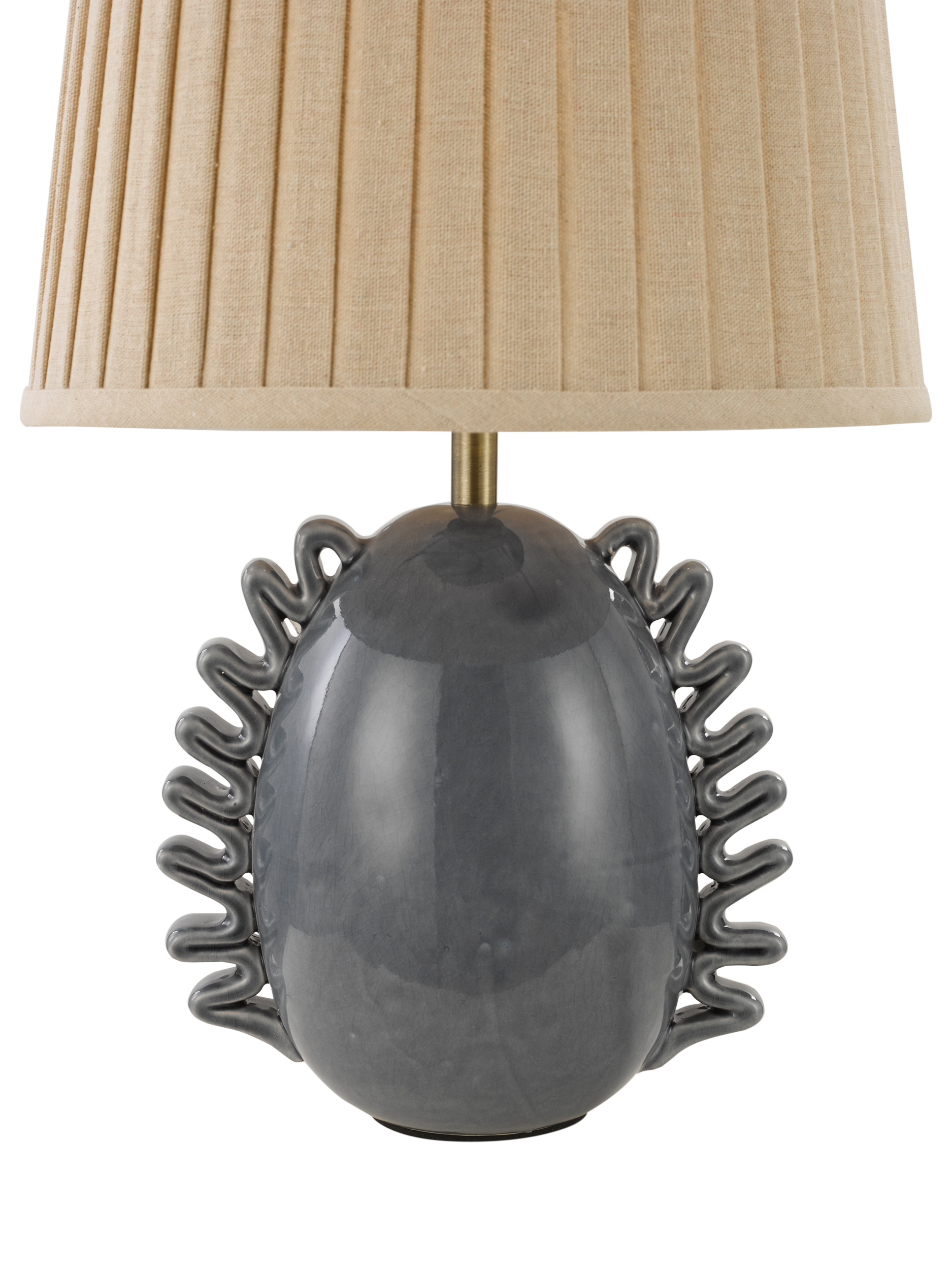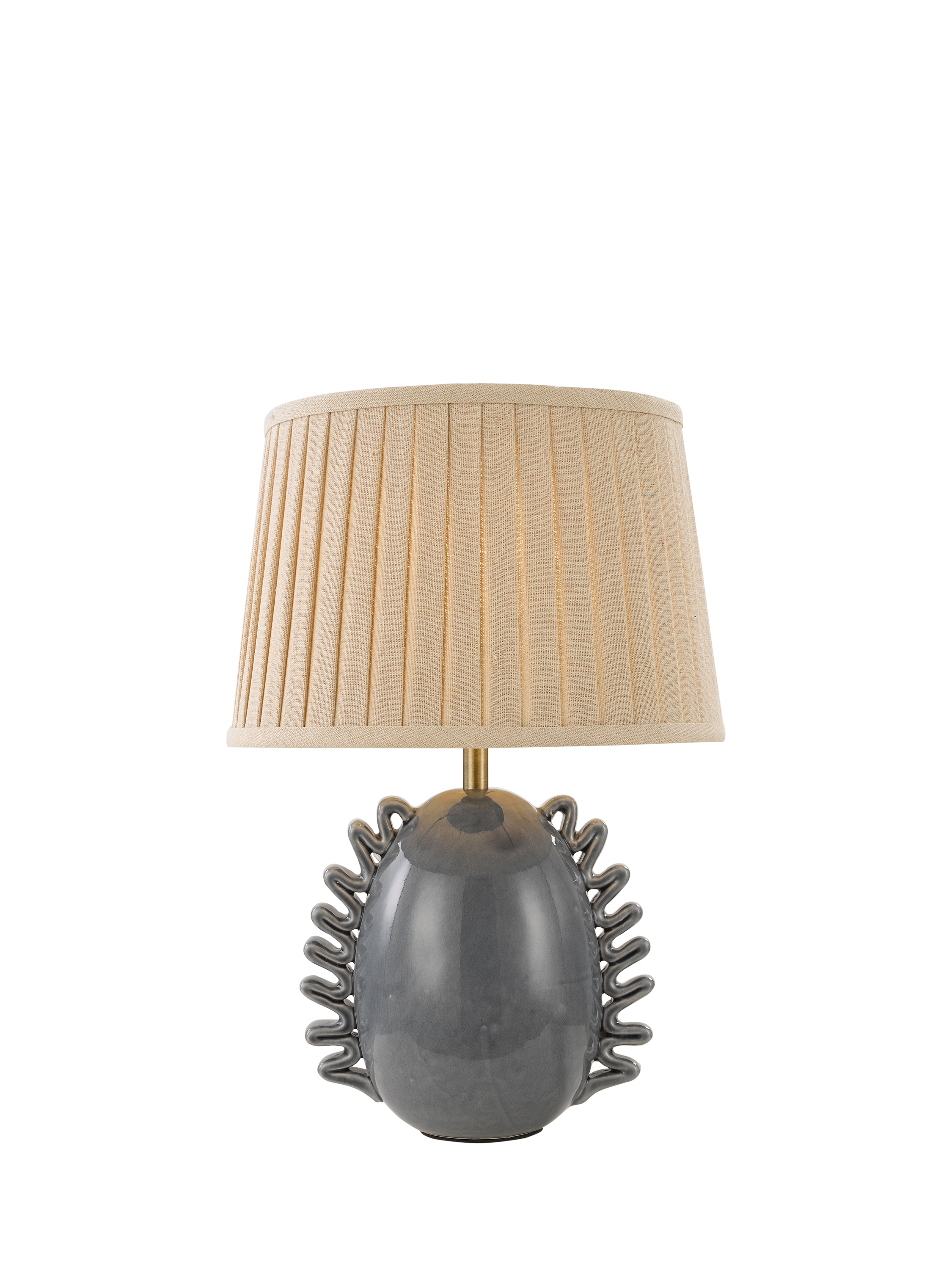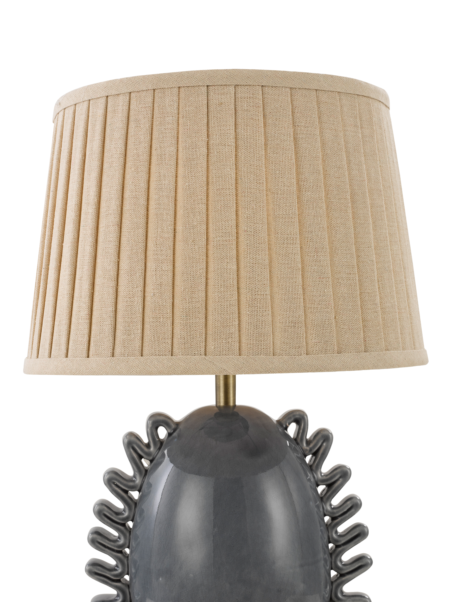 A striking artisan design, this table lamp features a playful wiggle detail, hand-applied and finished in a high-gloss crackle glaze. It's complemented by a luxurious, pleated, oatmeal-coloured fabric lampshade and a braided cable.