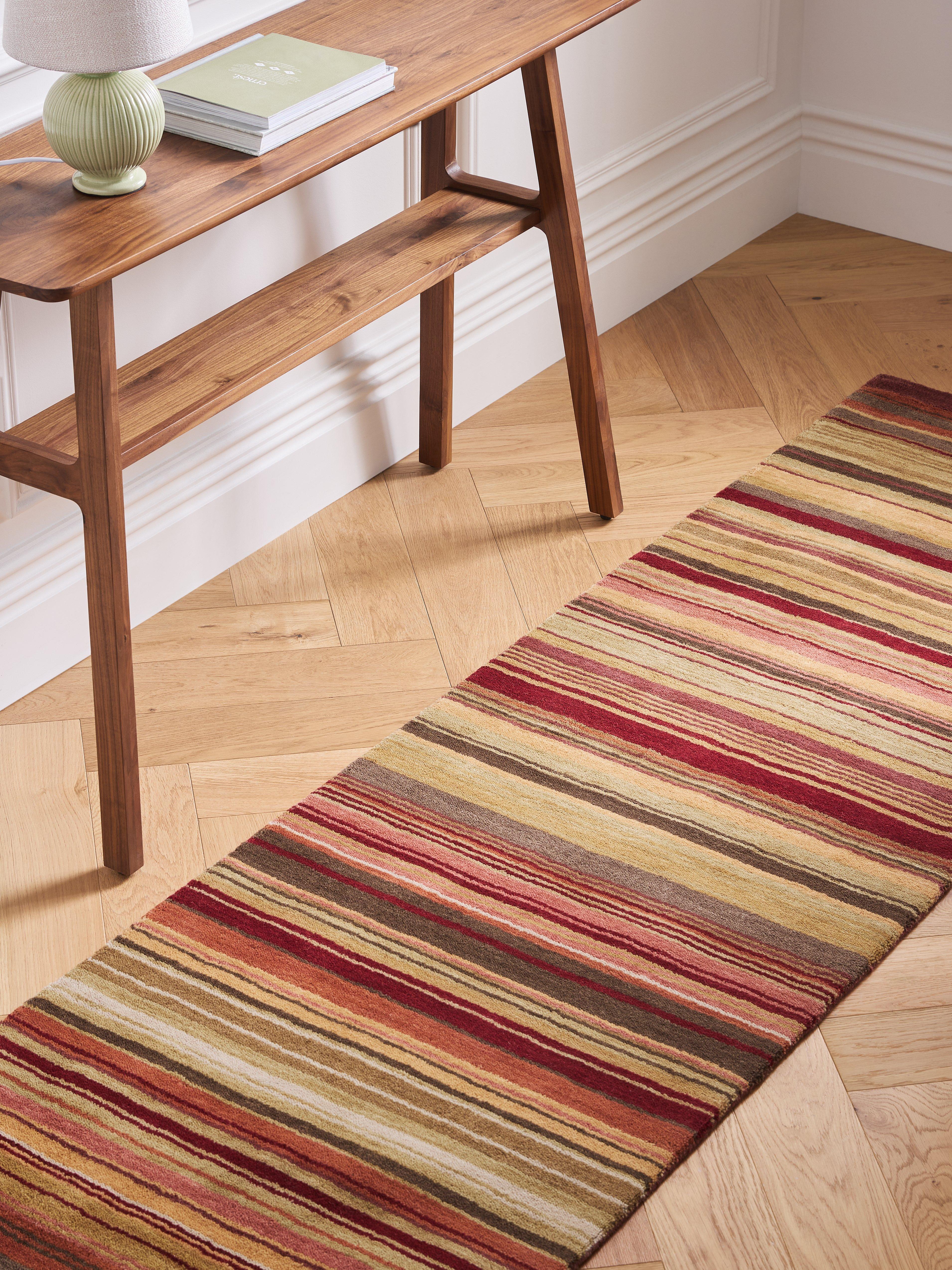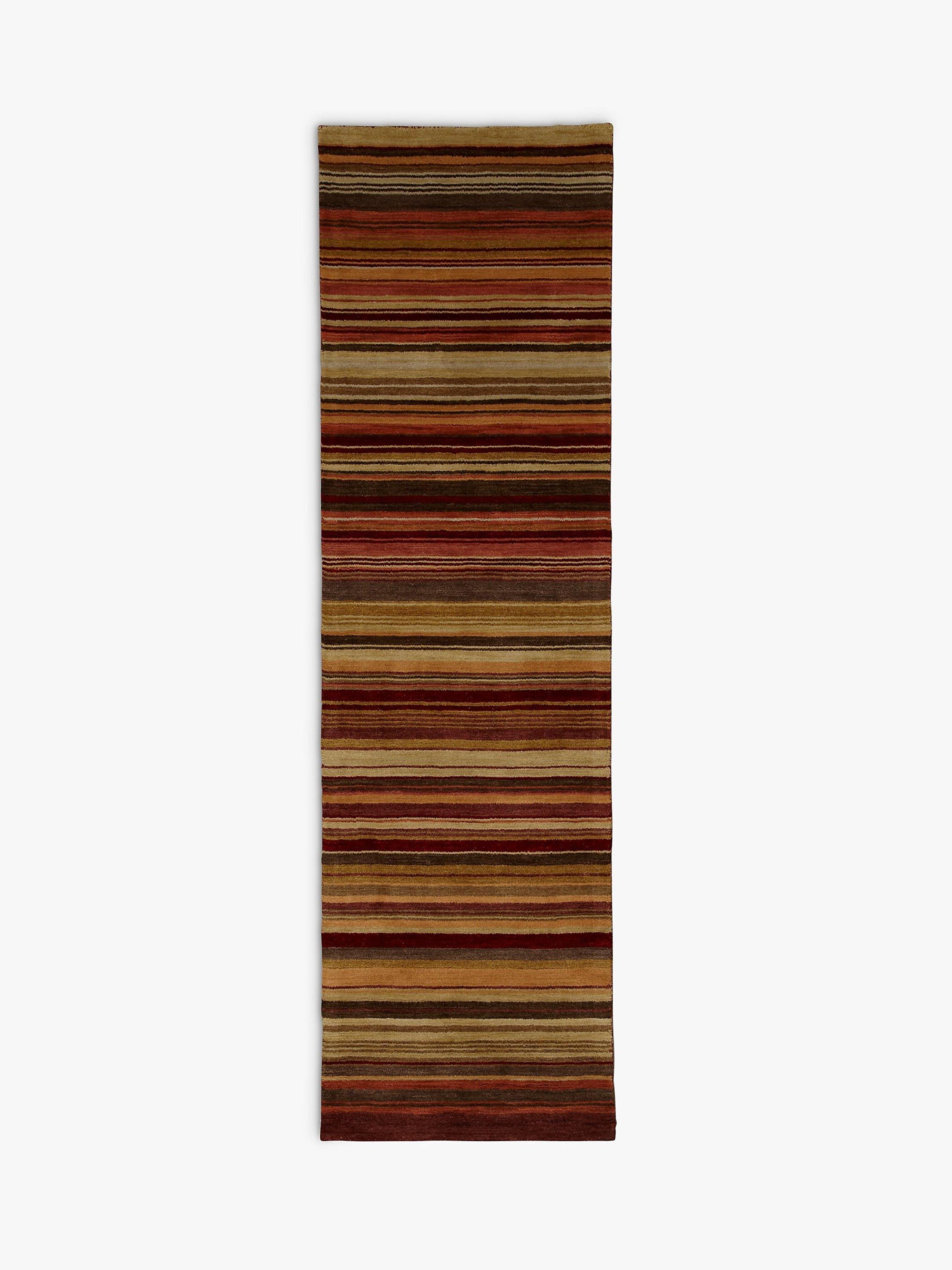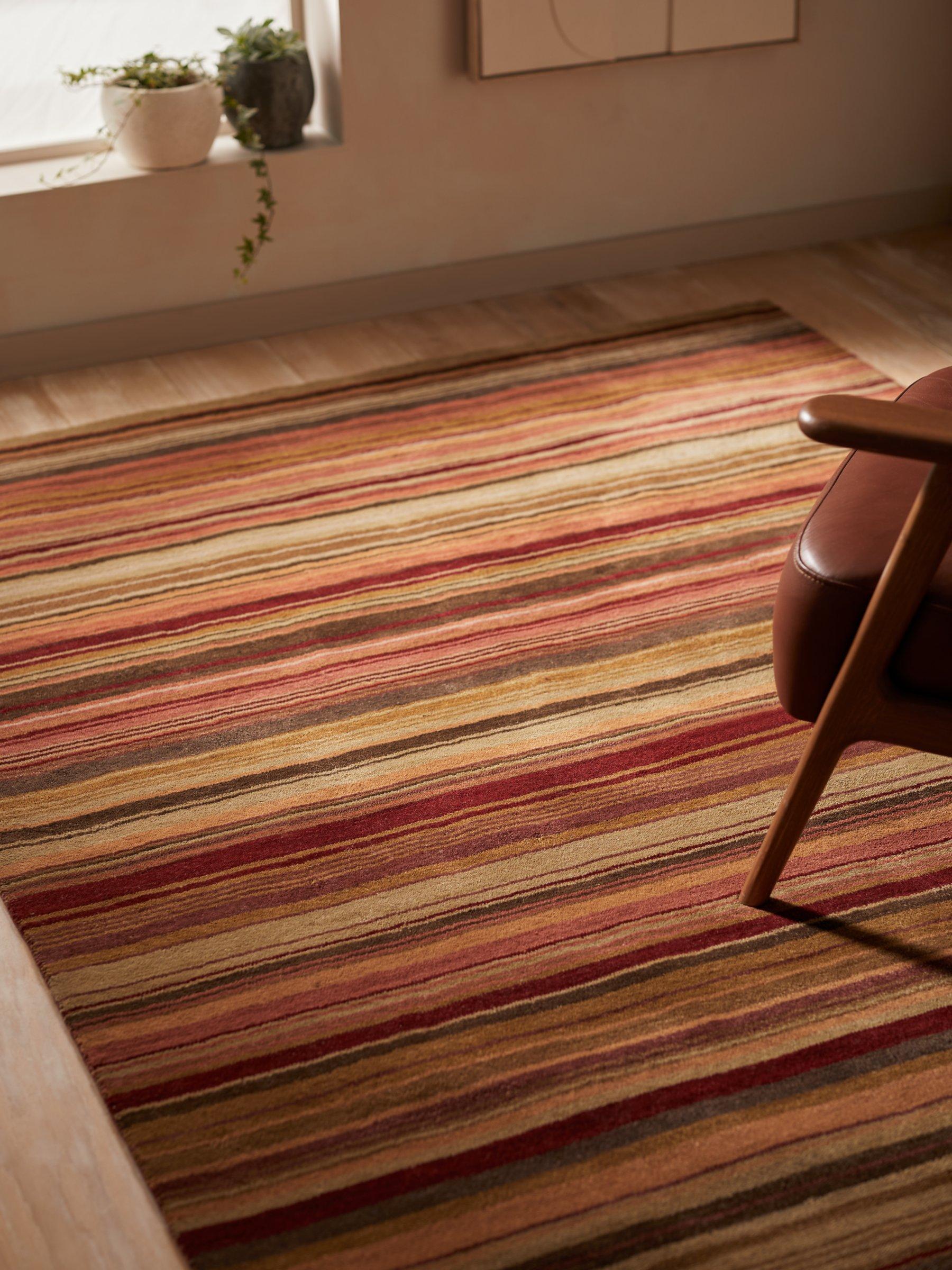 The rich, varied tones give off a dark and moody vibe, allowing you to tap into the chic hotel trend by emulating a city boutique. The striped pattern runs parallel across the wool rug, allowing for a rich colour palette that has a gradient design. The piece is hand knotted in India, giving you a durable and attractive floor covering for your home.