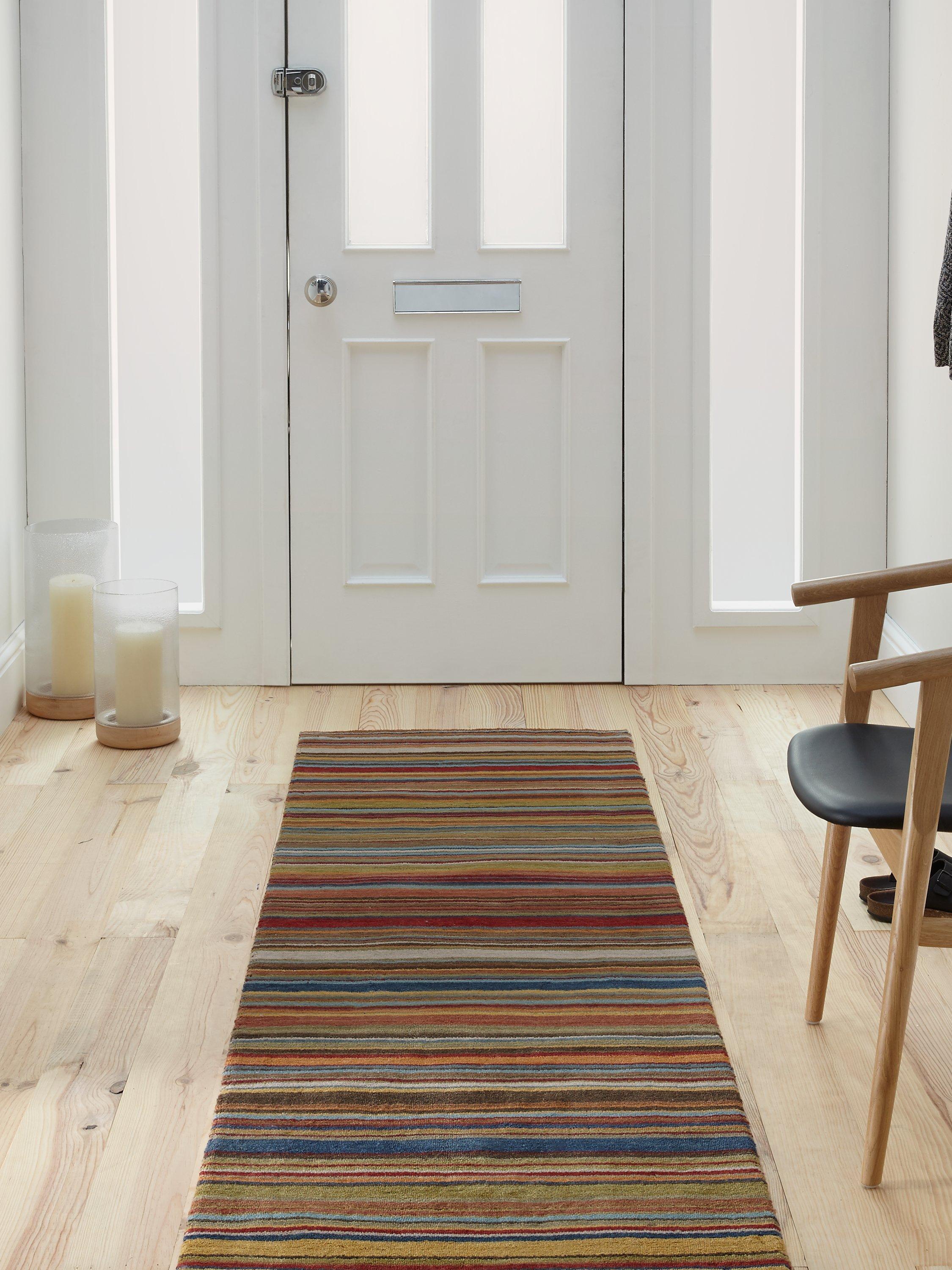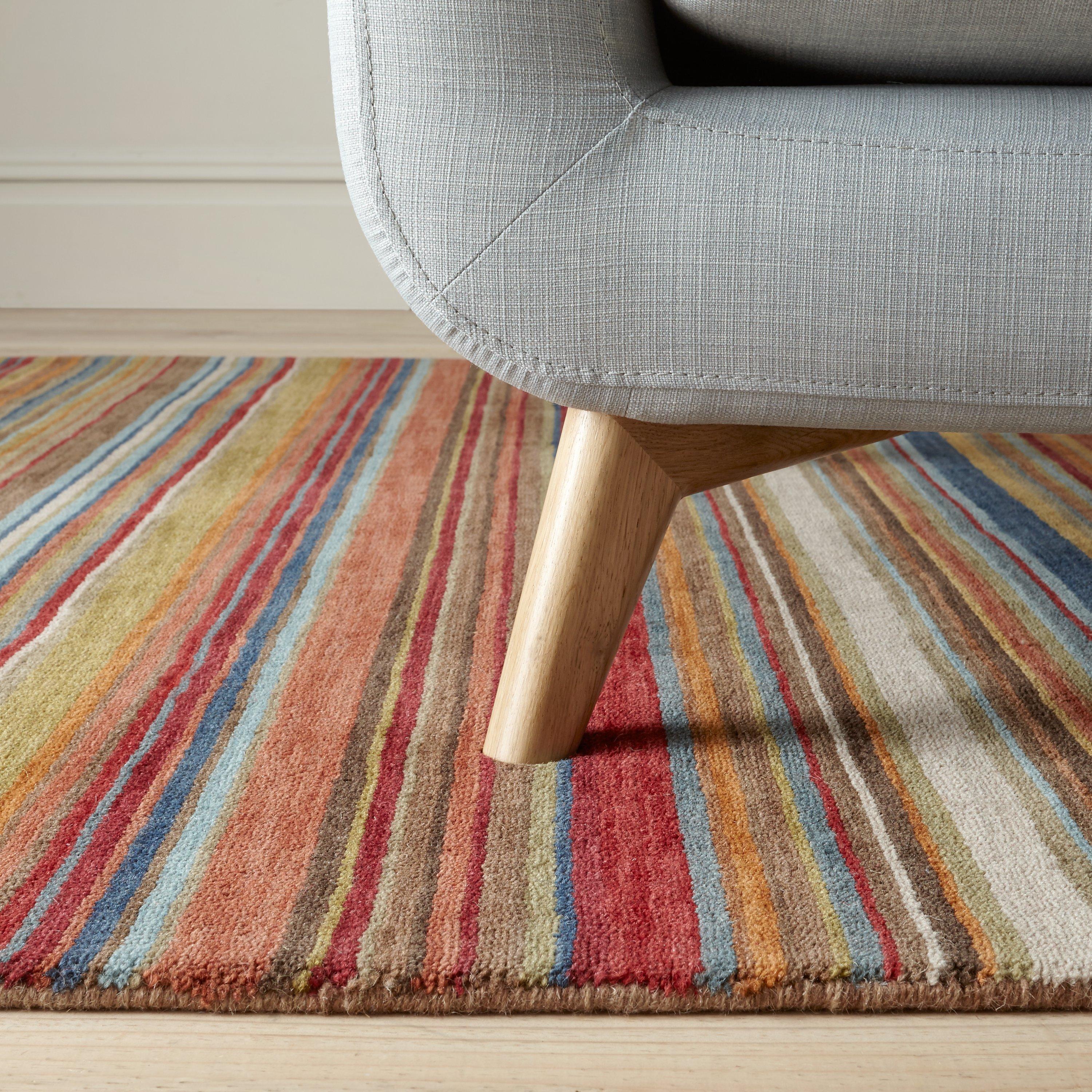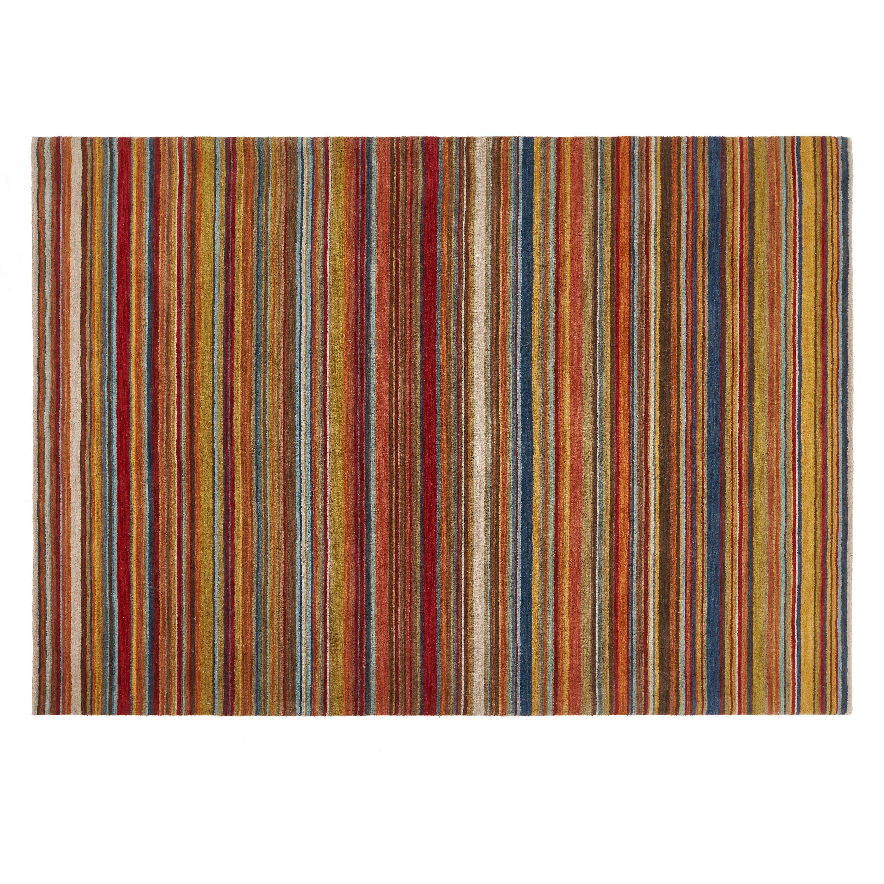 The rich, varied tones give off a dark and moody vibe, allowing you to tap into the chic hotel trend by emulating a city boutique. The striped pattern runs parallel across the wool rug, allowing for a rich colour palette that has a gradient design. The piece is hand knotted in India, giving you a durable and attractive floor covering for your home.