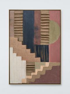 Abstract wall art on canvas. Linen fabric stripes and geometric shapes create visual impact and texture. Unglazed and presented in a wood-effect frame, ready to hang on your wall.