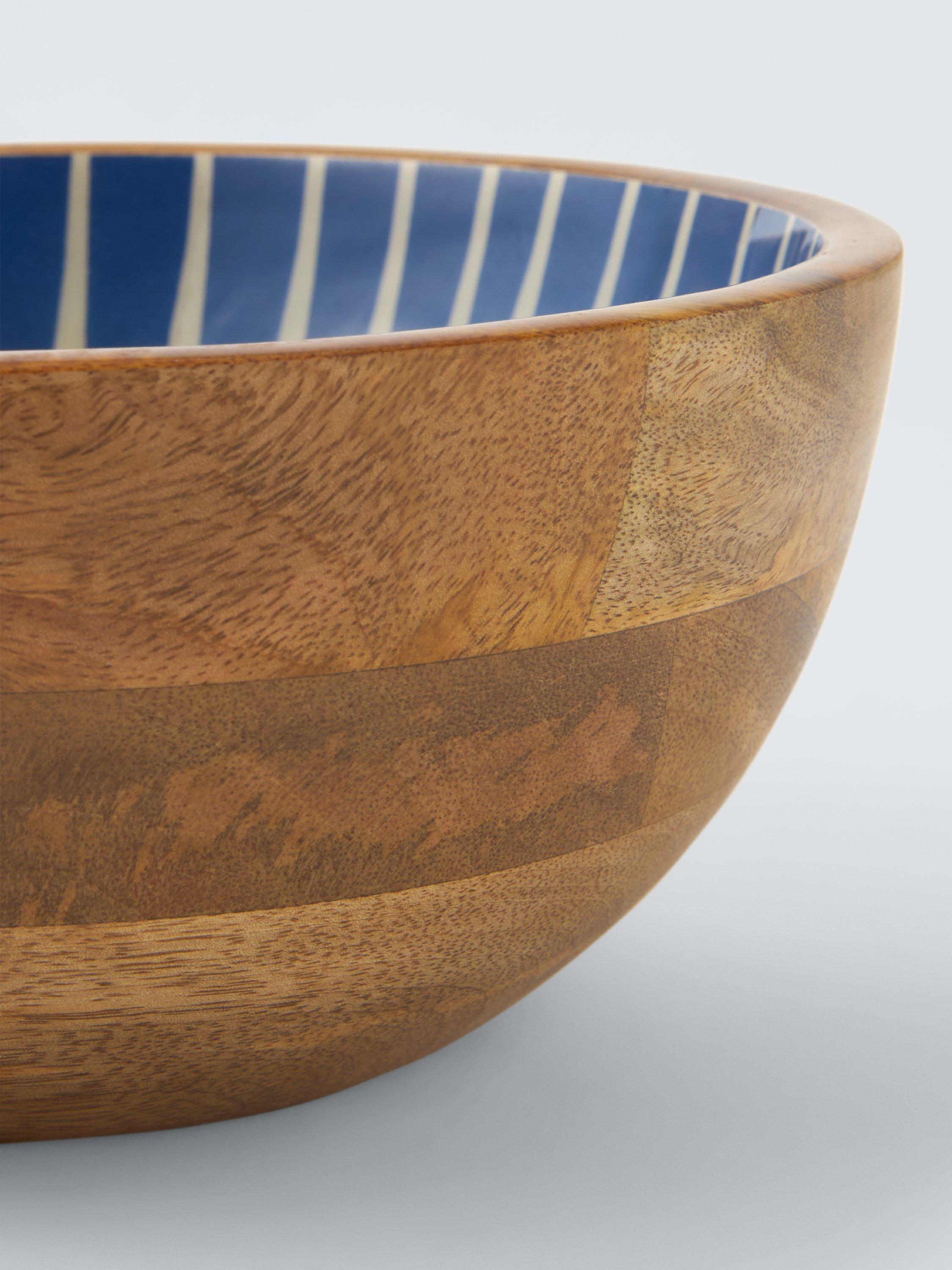 Handmade mango wood bowl with a walnut finish that shows off the natural variations in woodgrain pattern. Inside, the smooth enamelled surface is decorated in a colourful striped design.