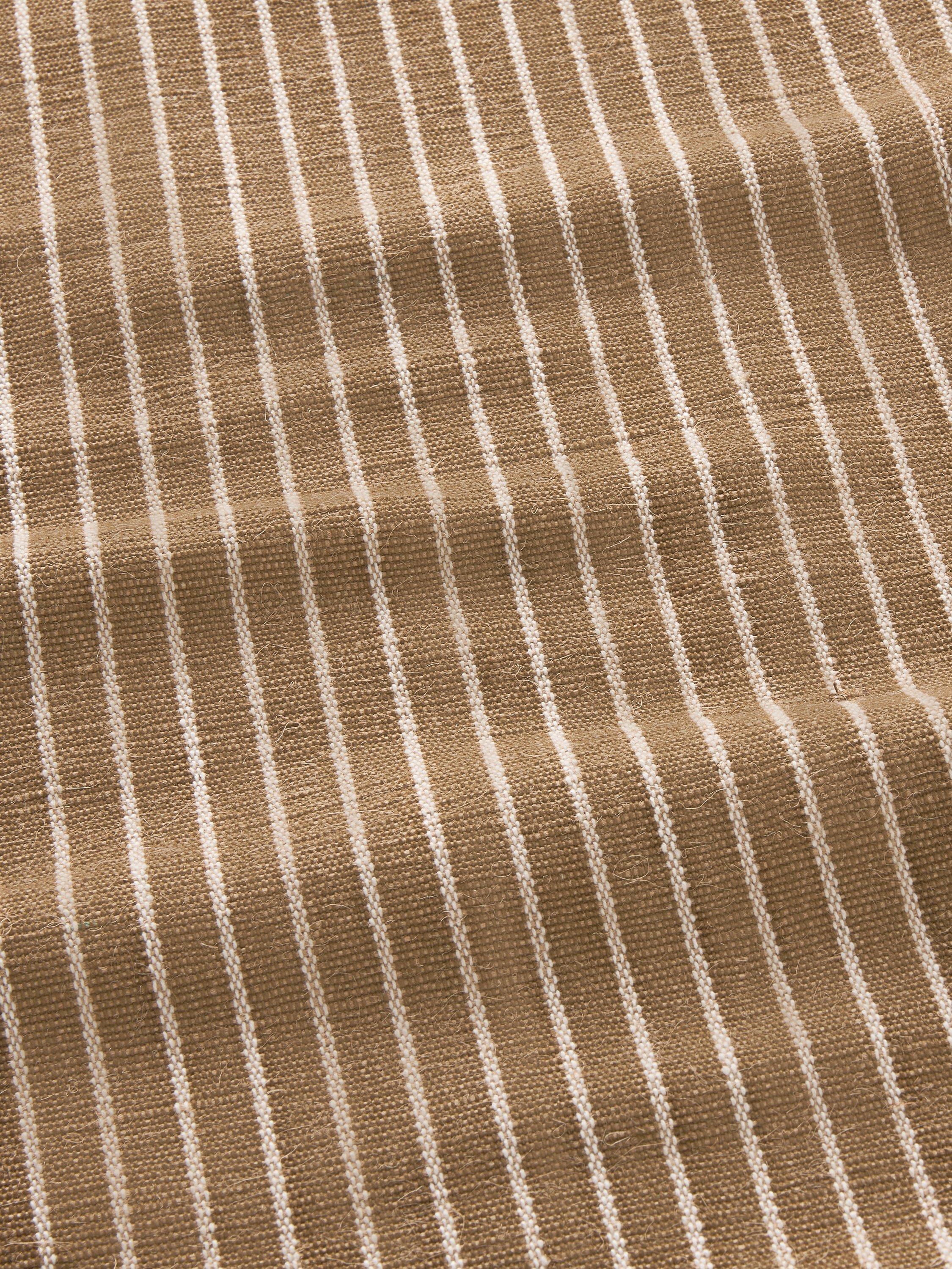 Striped cotton table runner with a rustic feel and fringed hem for texture. Machine washable for easy cleaning.