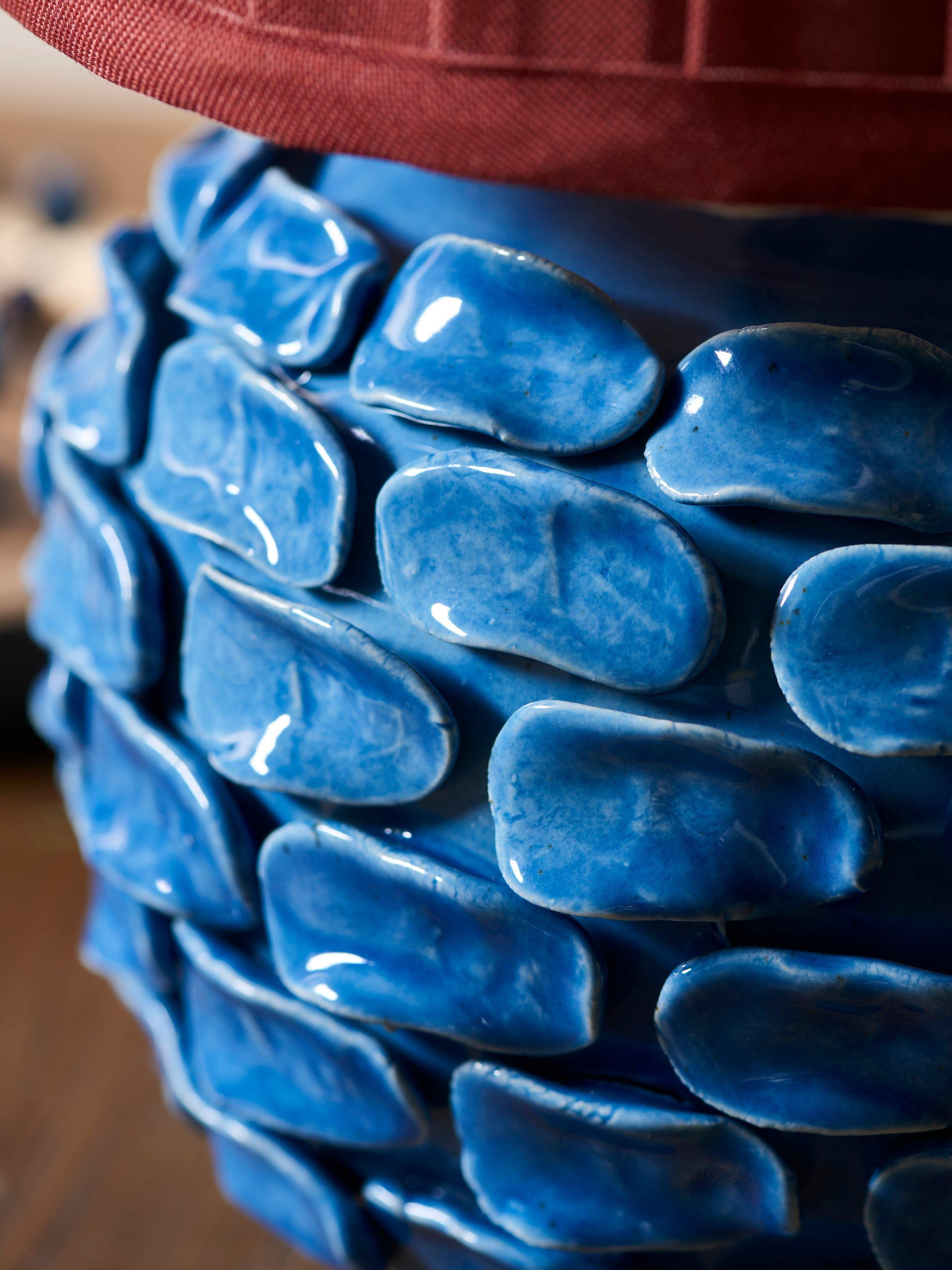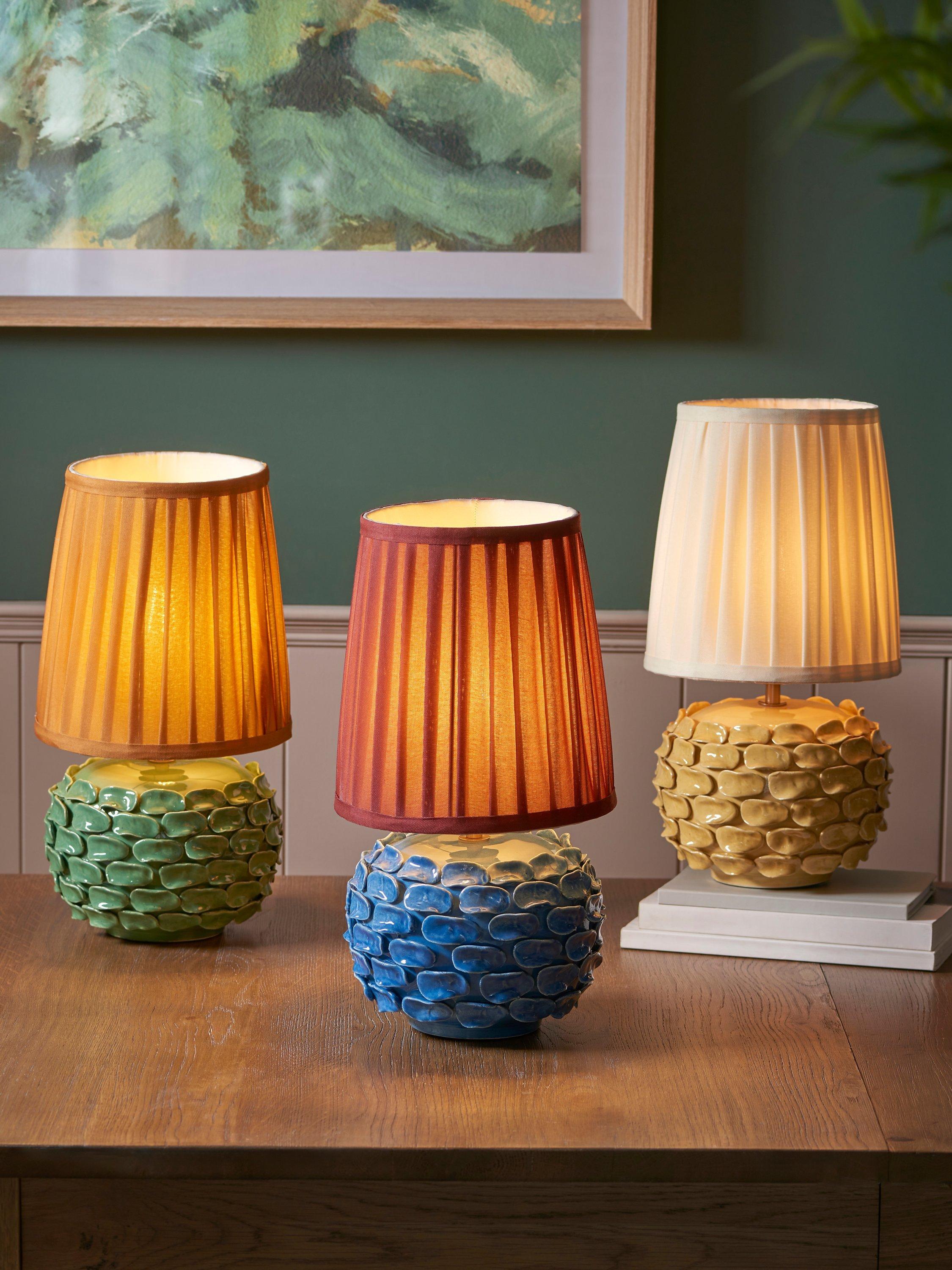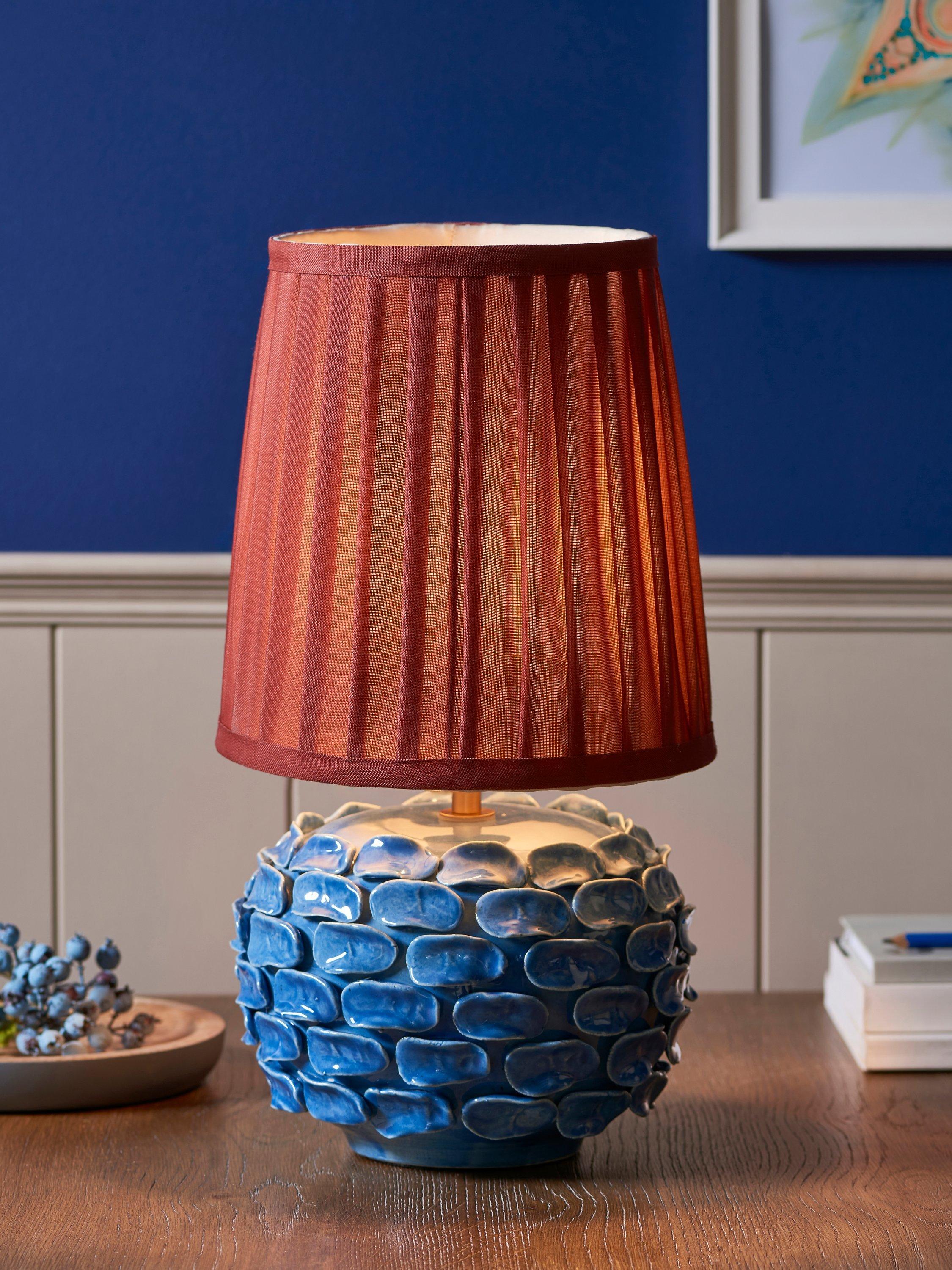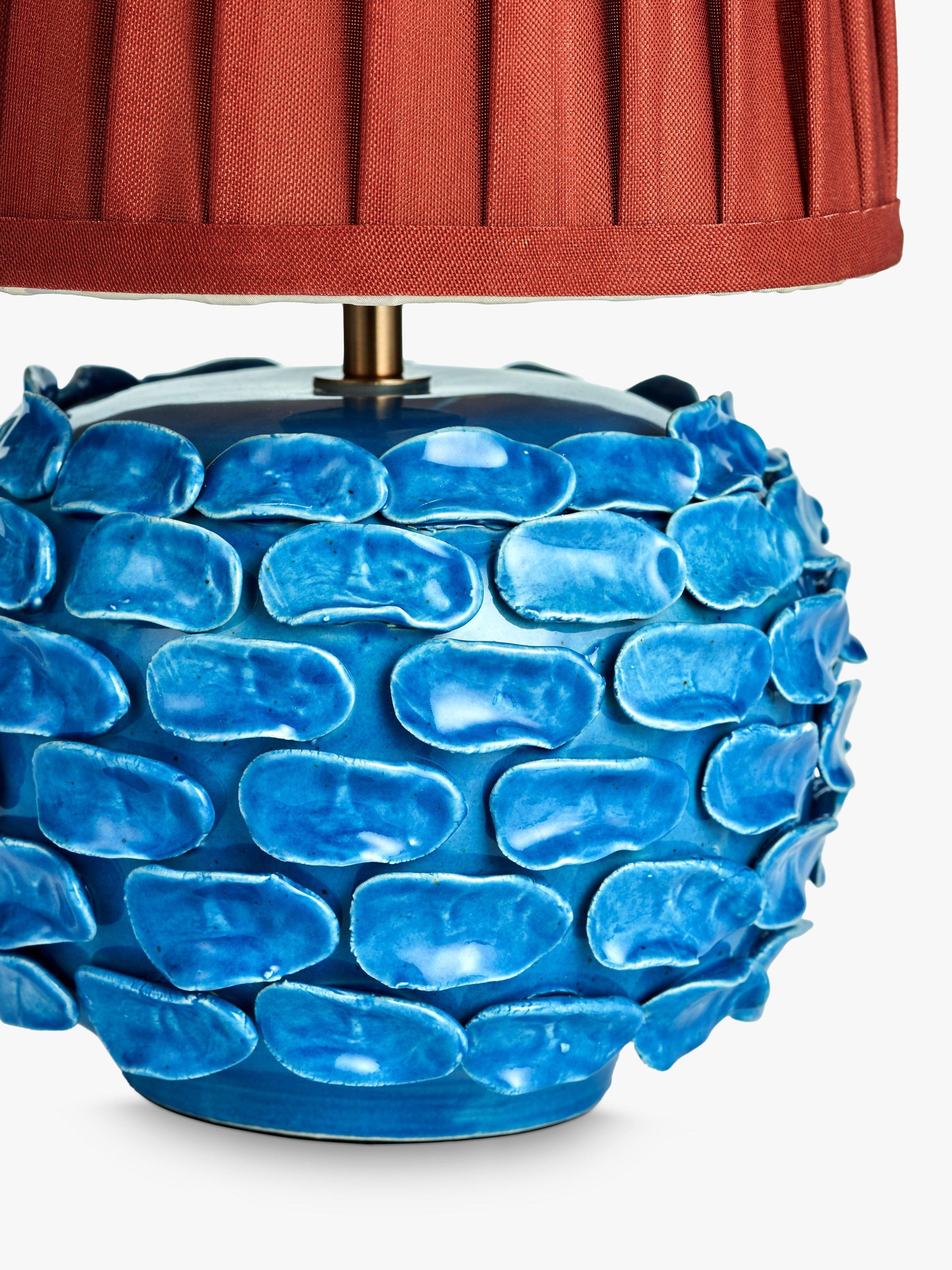 Sabzi takes it's inspiration from a large leafy herb. We carefully pick the organic ceramic petals and place each piece by hand onto a classic pebble shape base. A highly bespoke finish, each lamp is unique and has a striking reactive speckle glaze paired with a colourful pleated lampshade - we love the statement colourways!