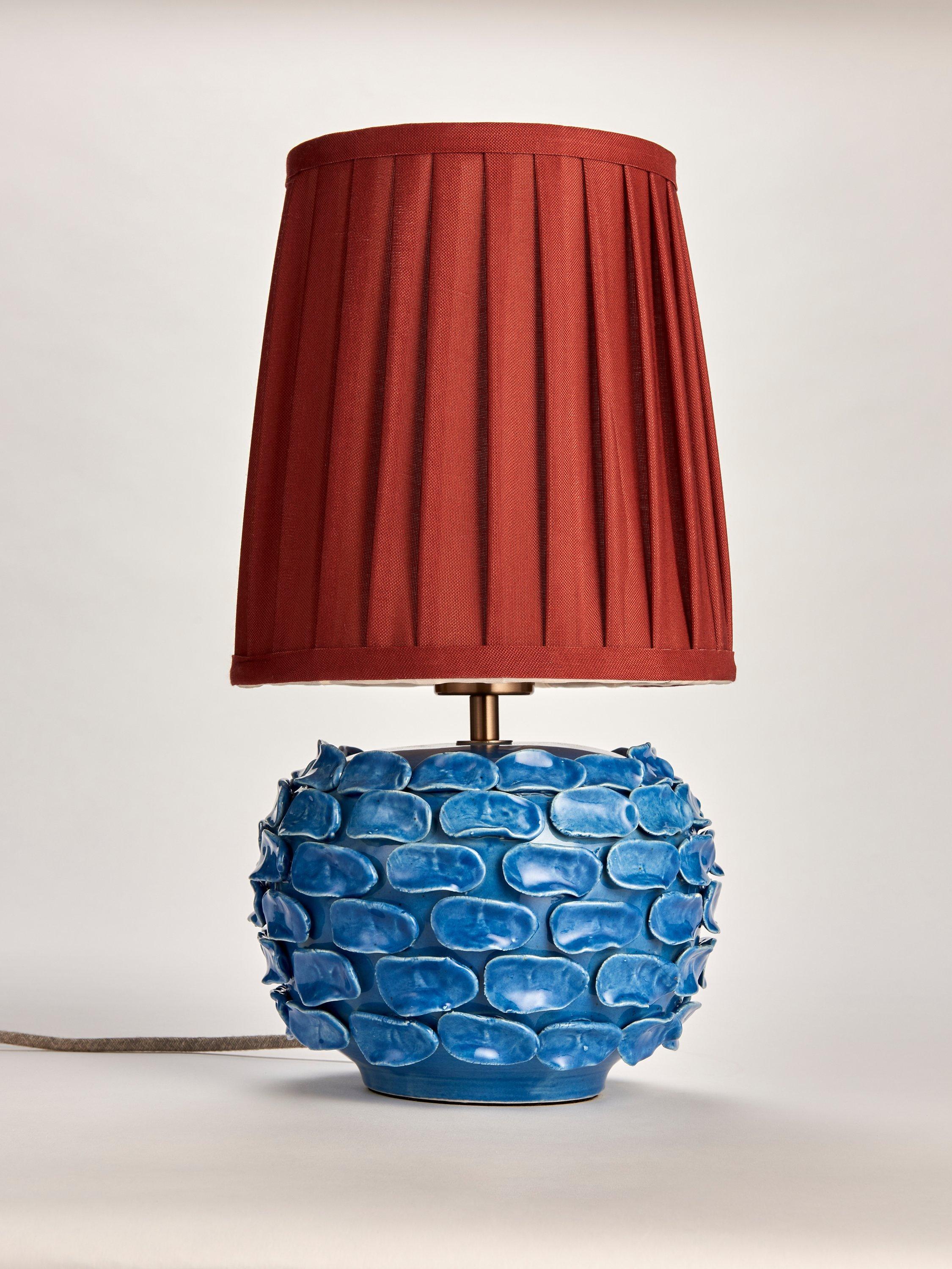 Sabzi takes it's inspiration from a large leafy herb. We carefully pick the organic ceramic petals and place each piece by hand onto a classic pebble shape base. A highly bespoke finish, each lamp is unique and has a striking reactive speckle glaze paired with a colourful pleated lampshade - we love the statement colourways!