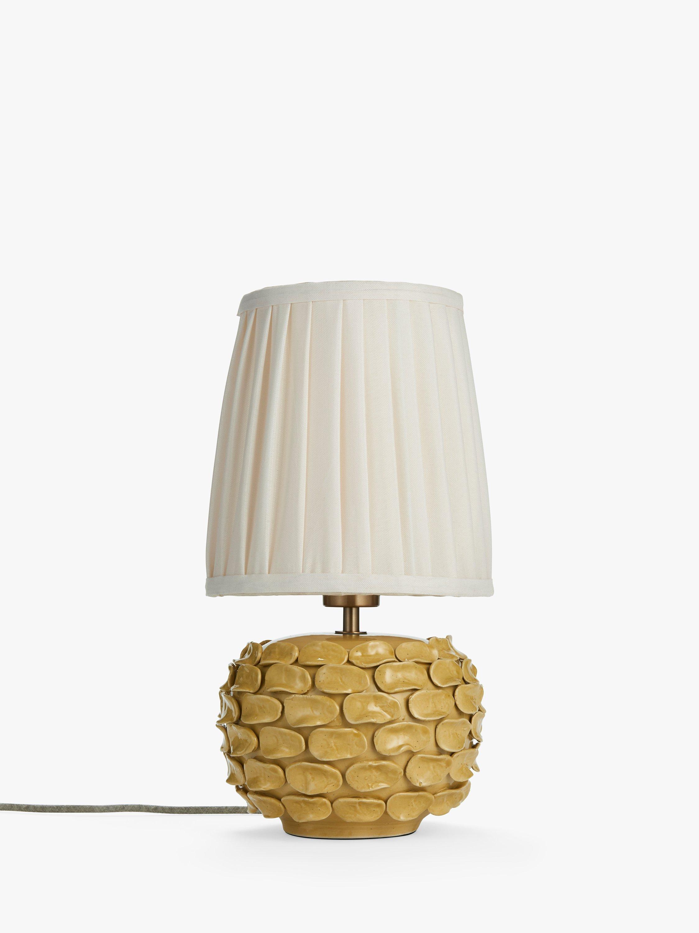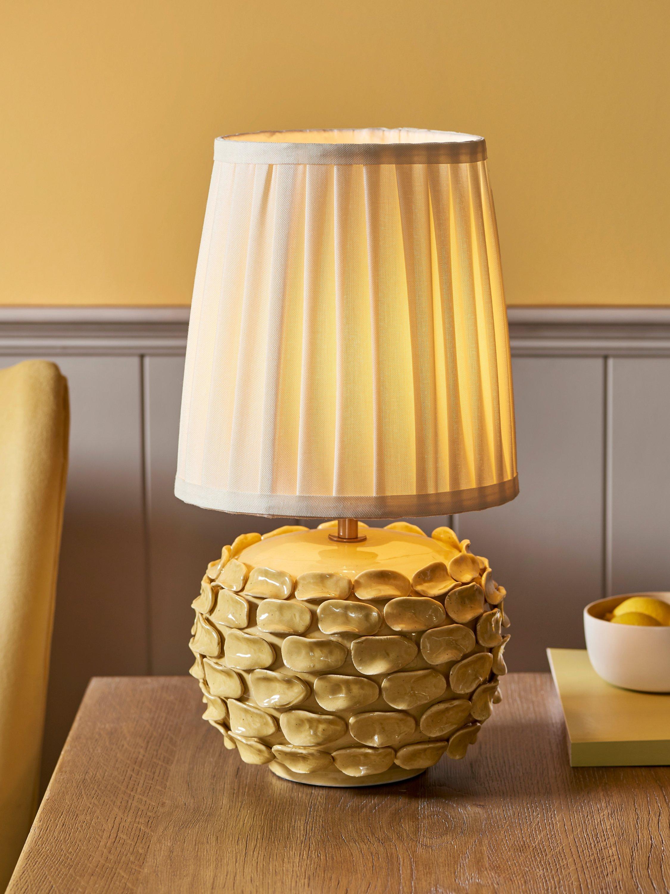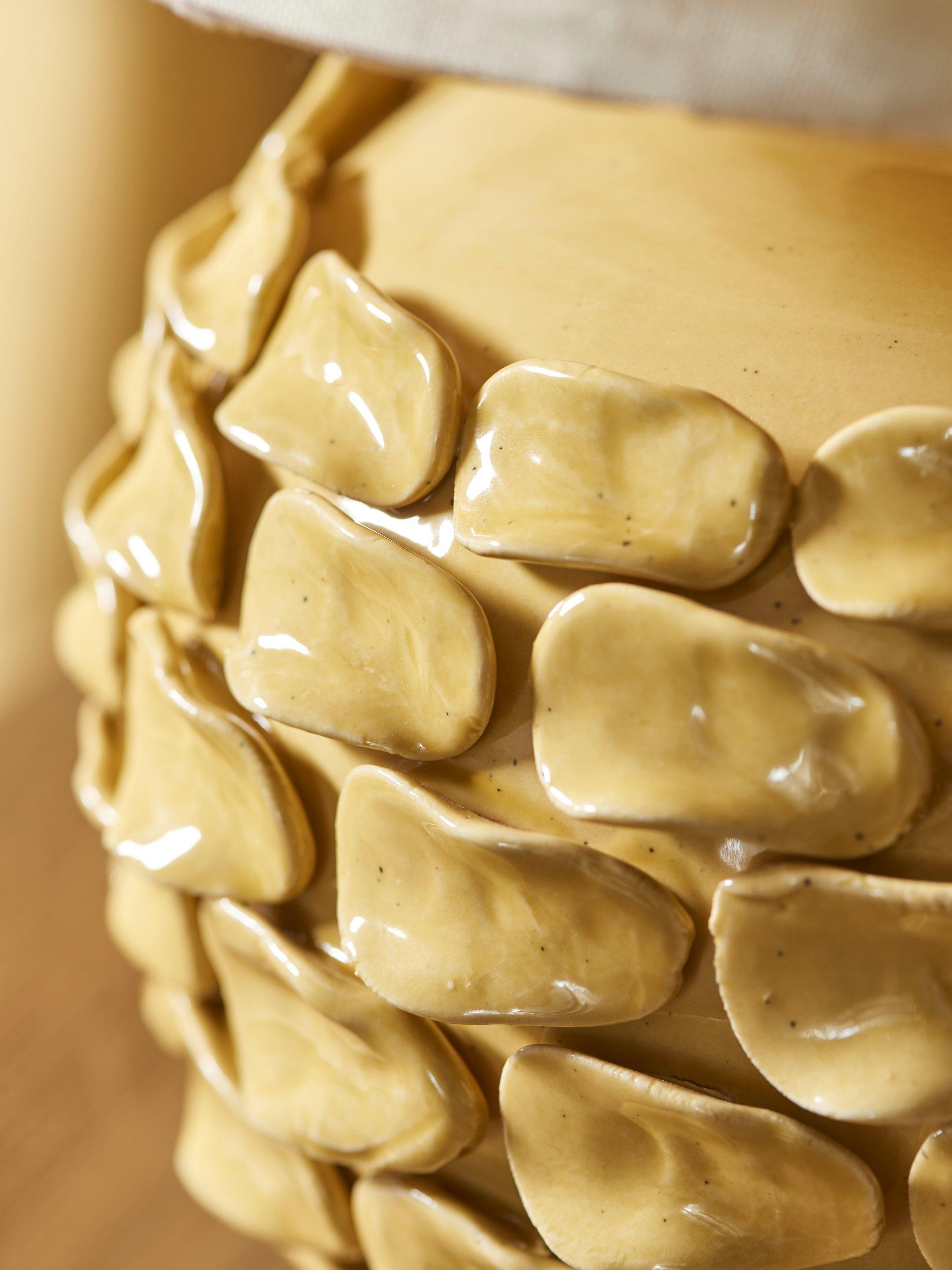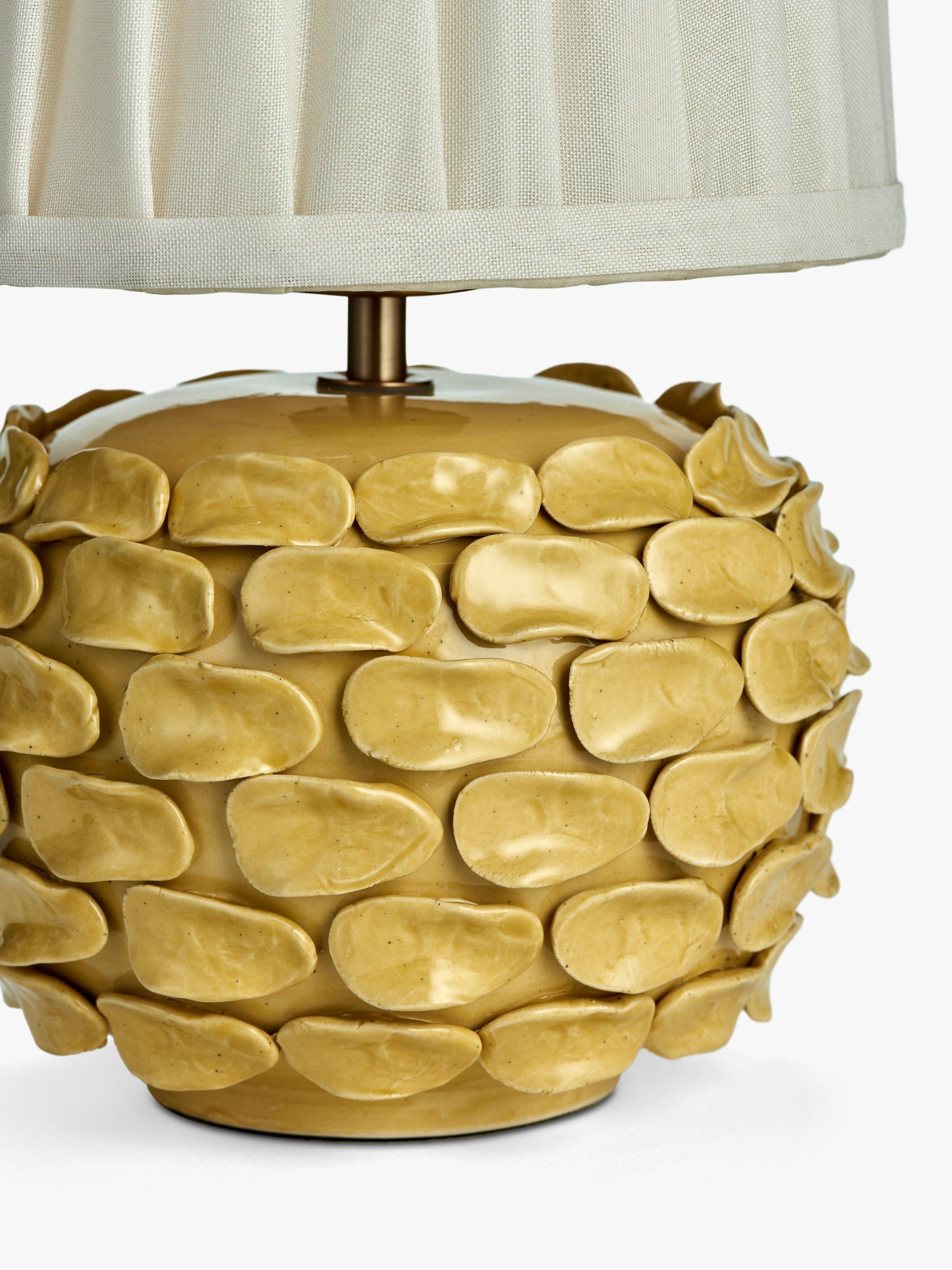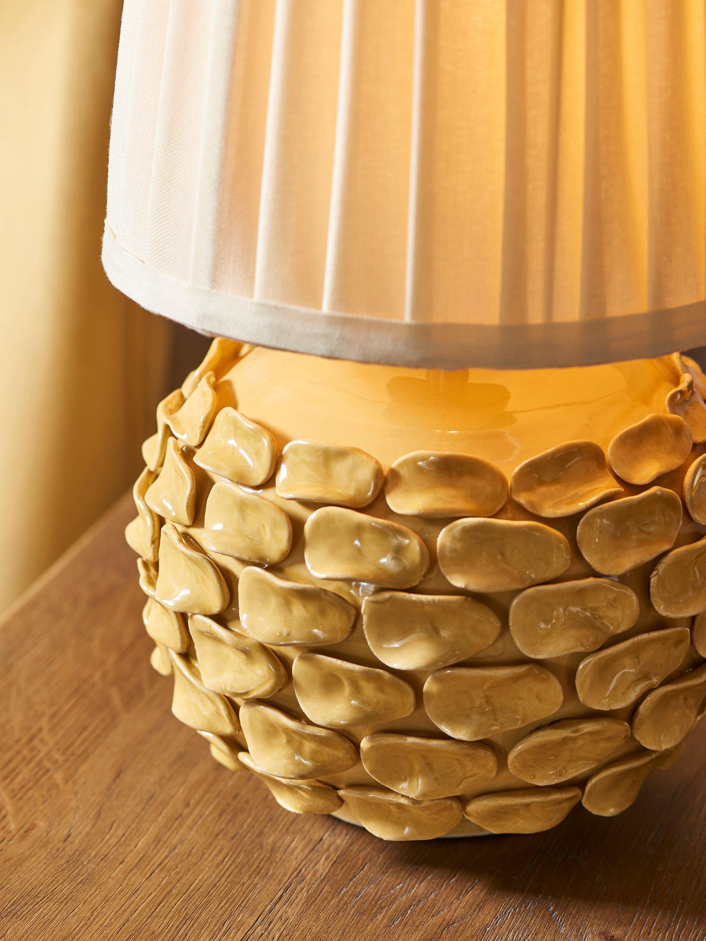 Sabzi takes it's inspiration from a large leafy herb. We carefully pick the organic ceramic petals and place each piece by hand onto a classic pebble shape base. A highly bespoke finish, each lamp is unique and has a striking reactive speckle glaze paired with a colourful pleated lampshade - we love the statement colourways!