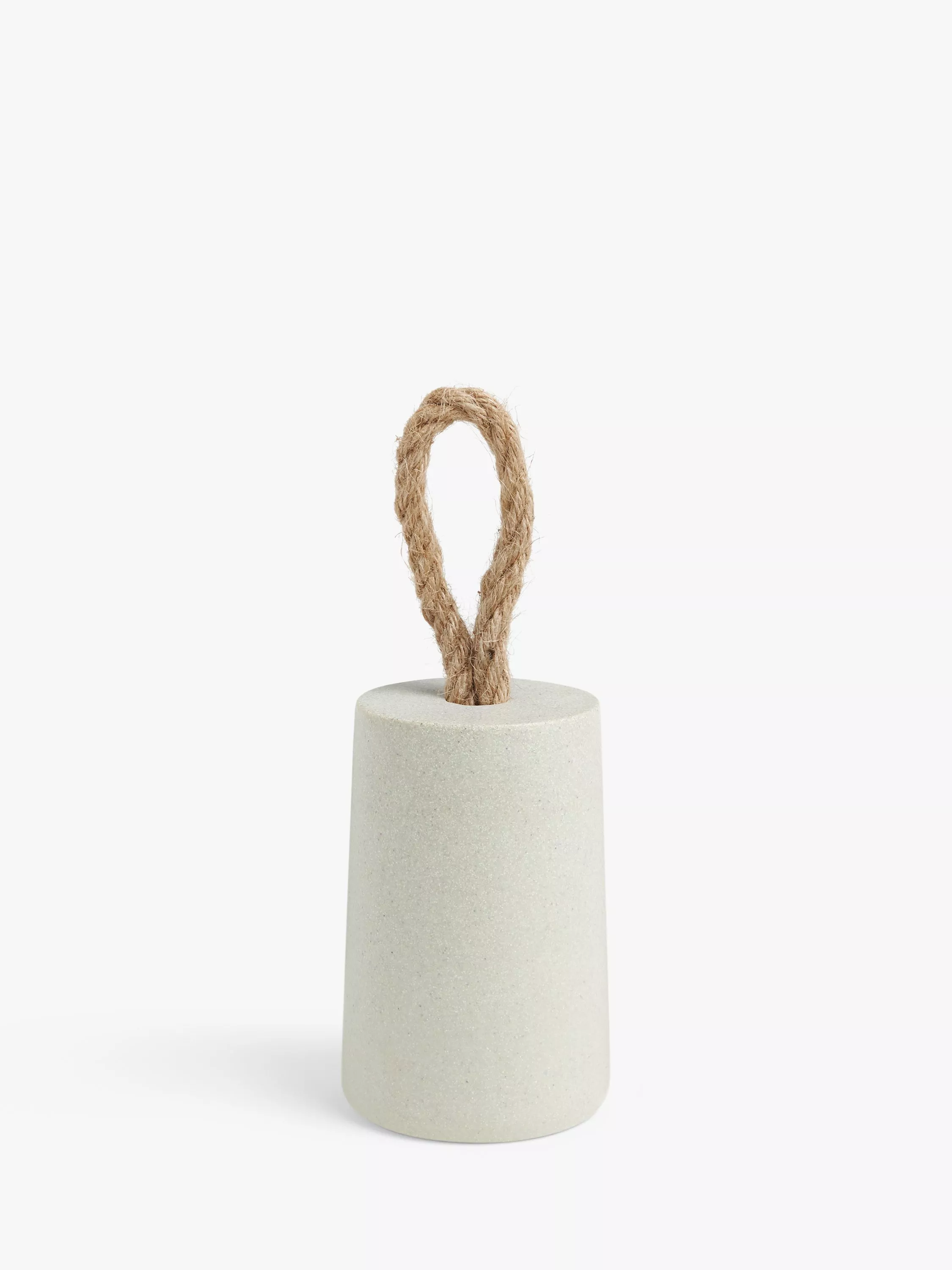 A chunky stone-look door stop with a twisted rope handle for a simple, industrial aesthetic.