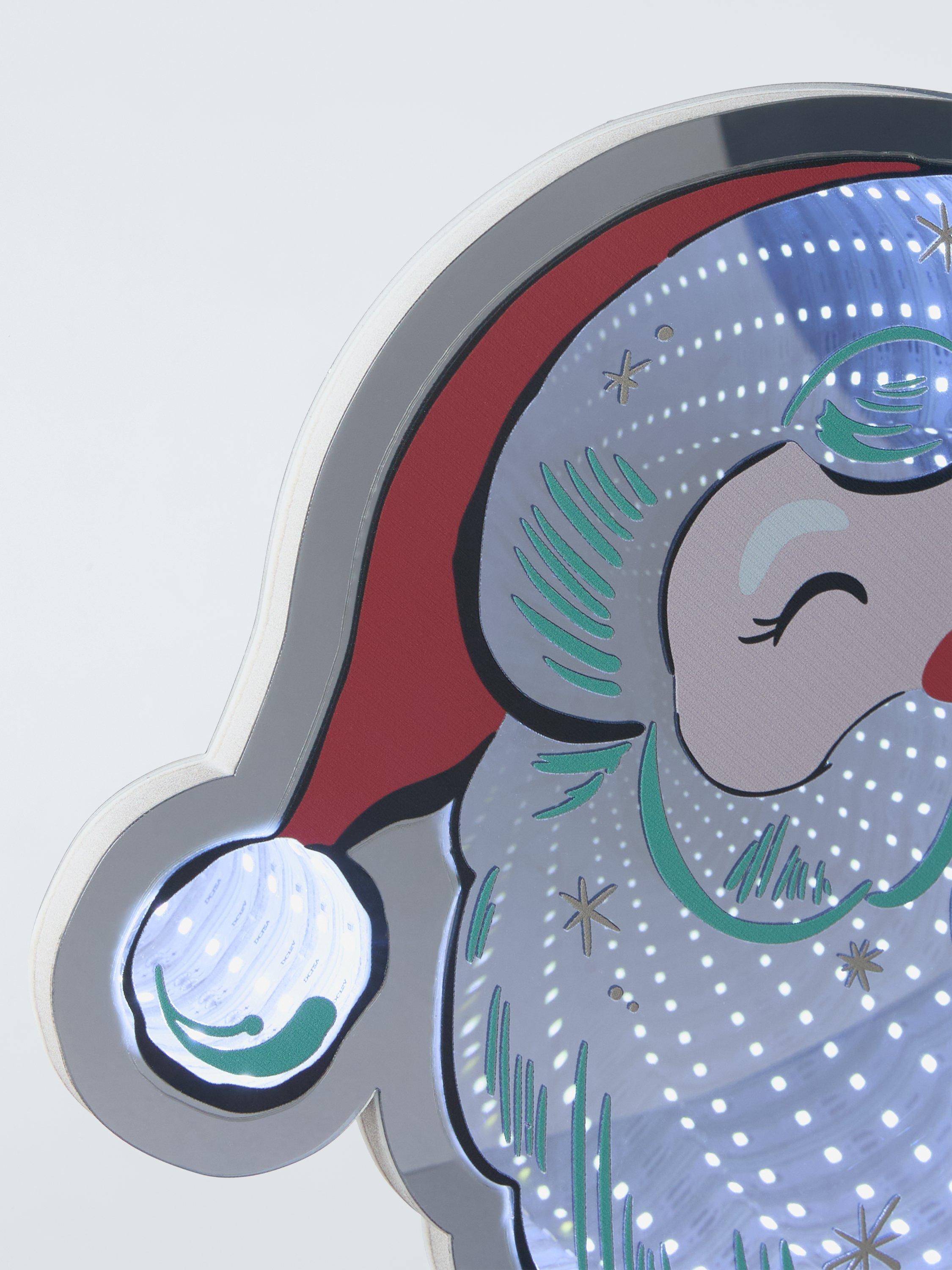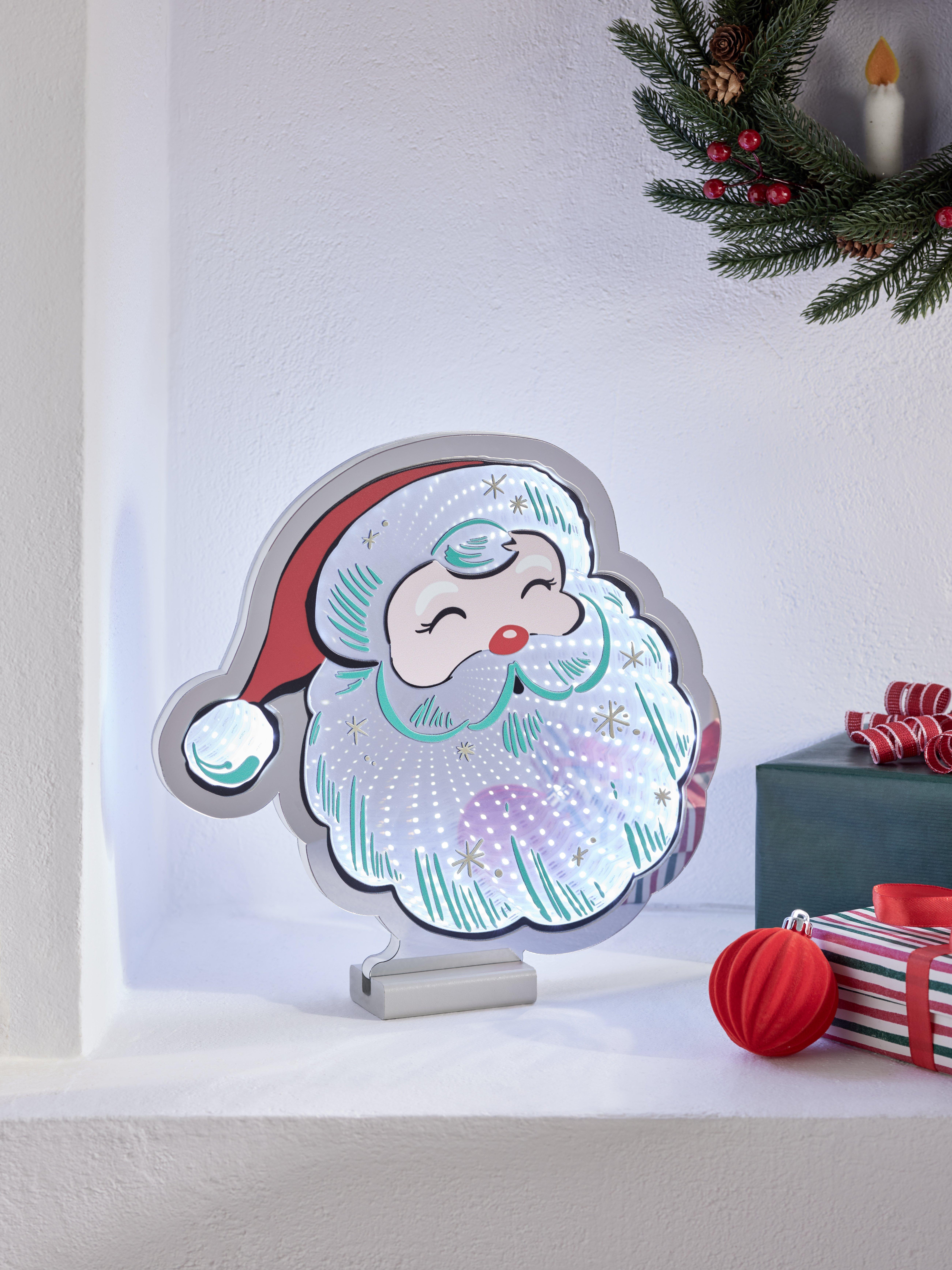 A cute and colourful decoration by day, a wonderful, way out infinity light by night, this smiling Santa head features a steady multi-coloured LED glow that brings warmth and cheer to any room.