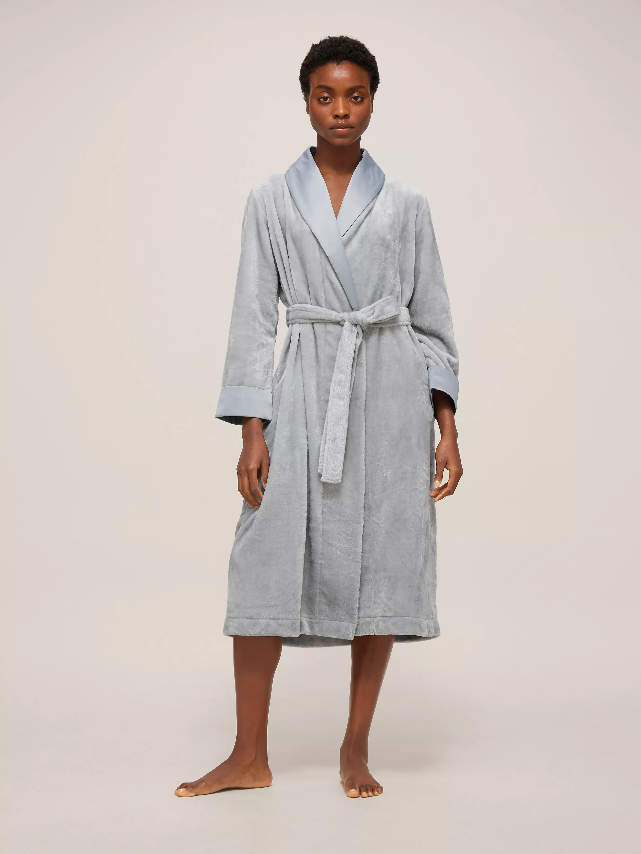 Our most luxurious robe for a sophisticated lounge look, we've designed this piece in super soft fleece and given it a satin shawl collar for an elevated touch that plays on beautifully rich textures. We've mirrored the satin trim on the cuffs and included a matching self tie belt so you can fasten over sleep and loungewear to keep warm and cosy.