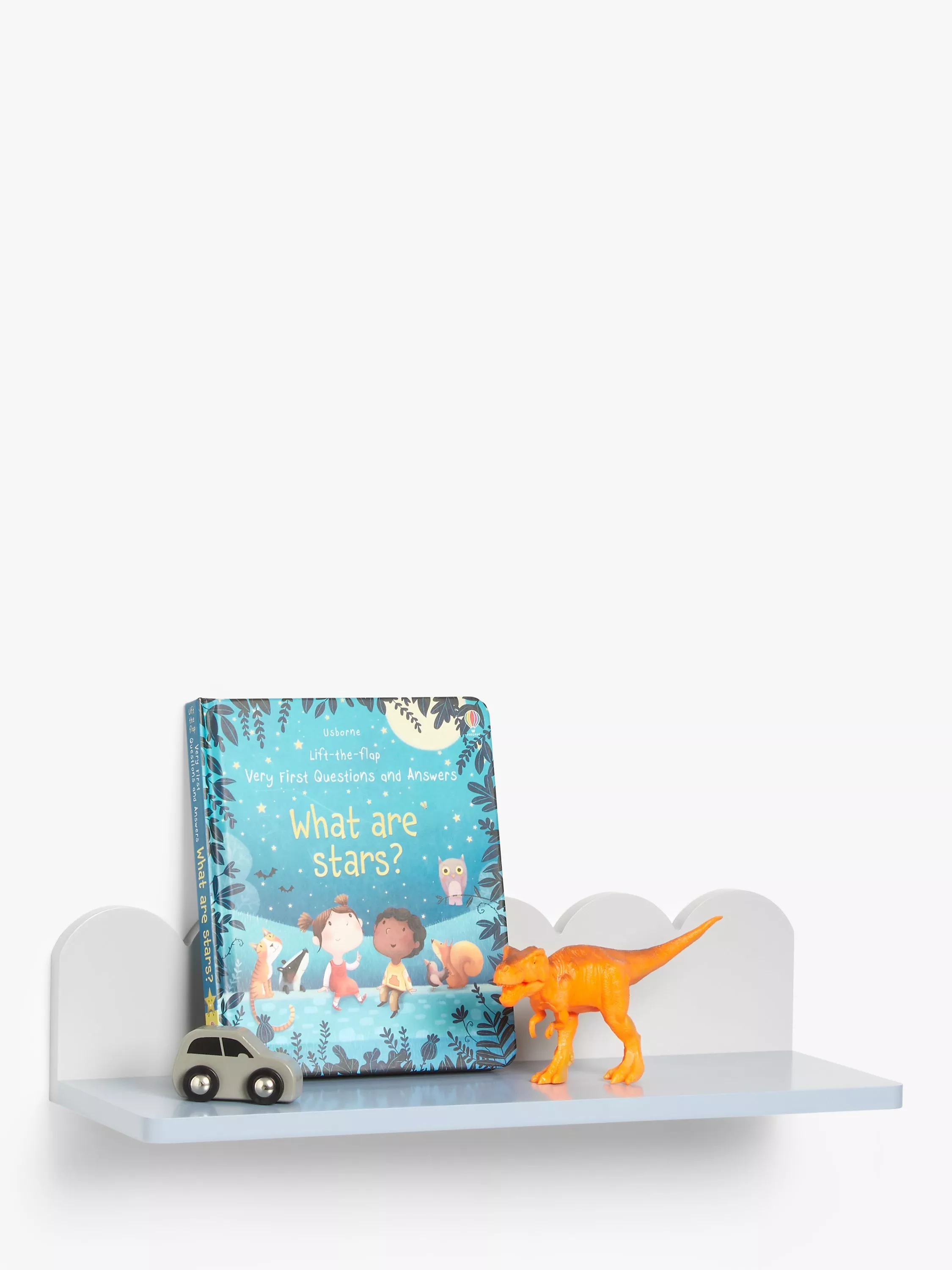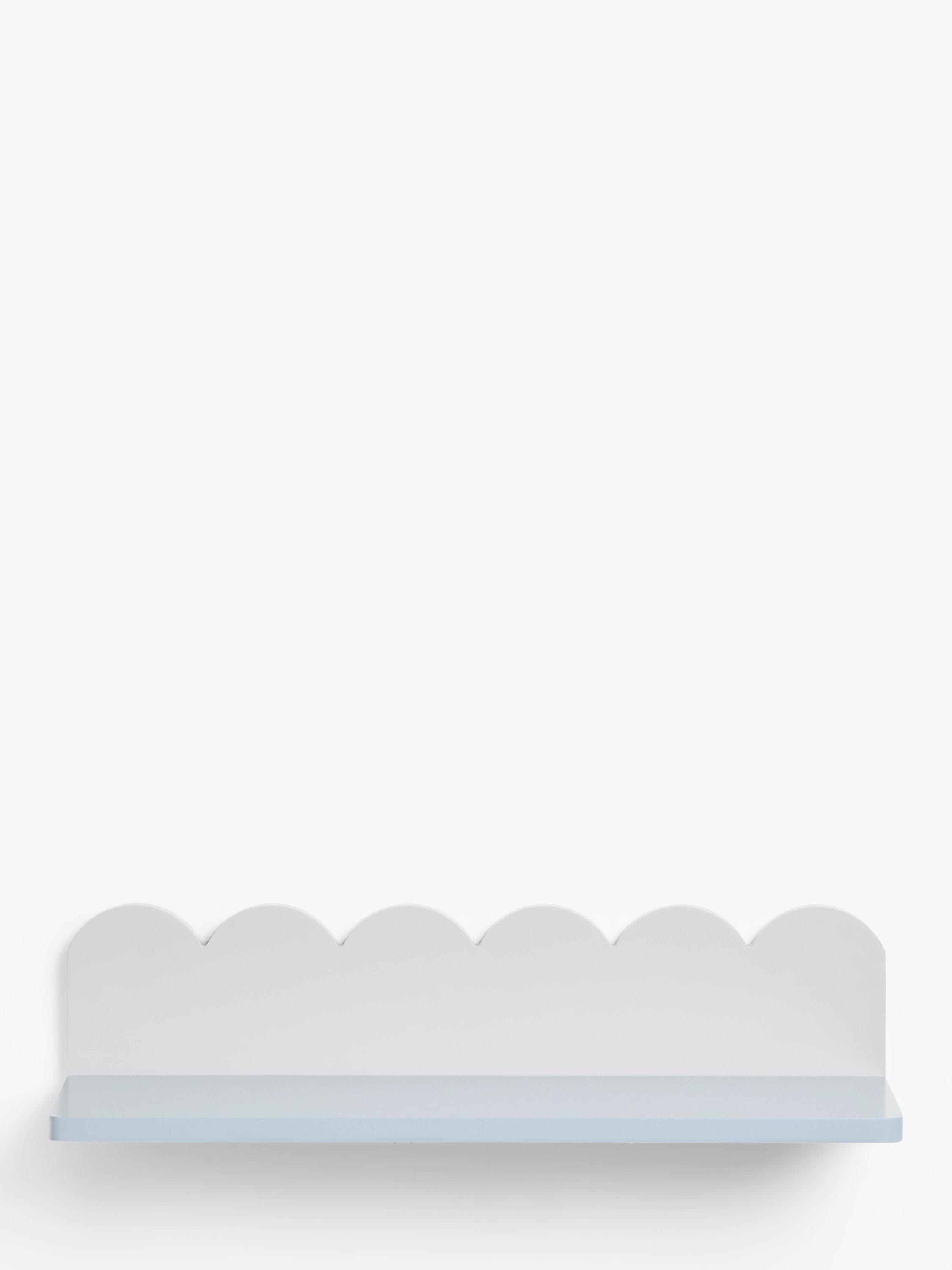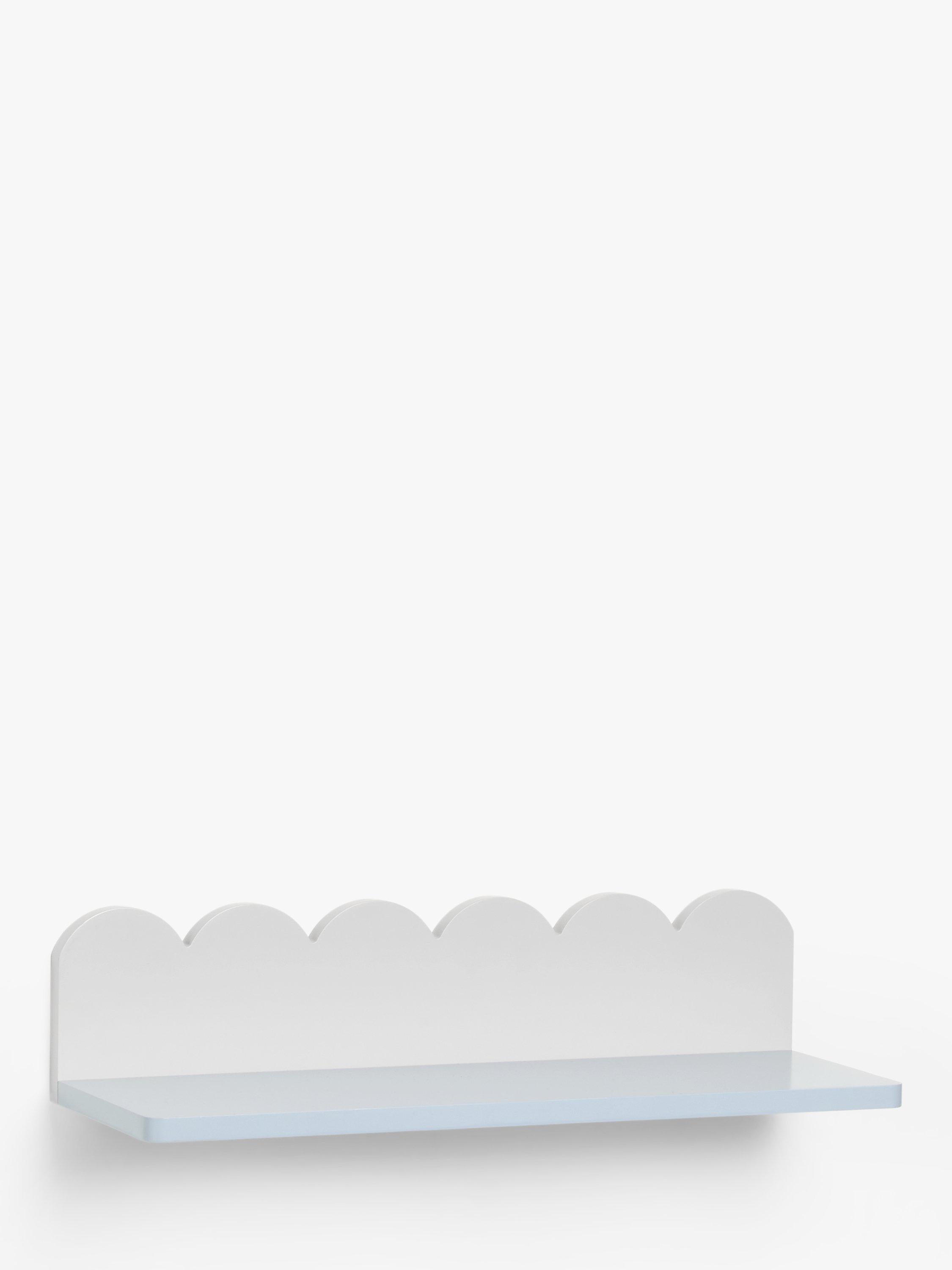 Add some fun detail to their space with this scalloped wall shelf from our collection. Simply designed, this shelf has a scalloped shape that is reminiscent of clouds but neutral enough to fit into any themed room.