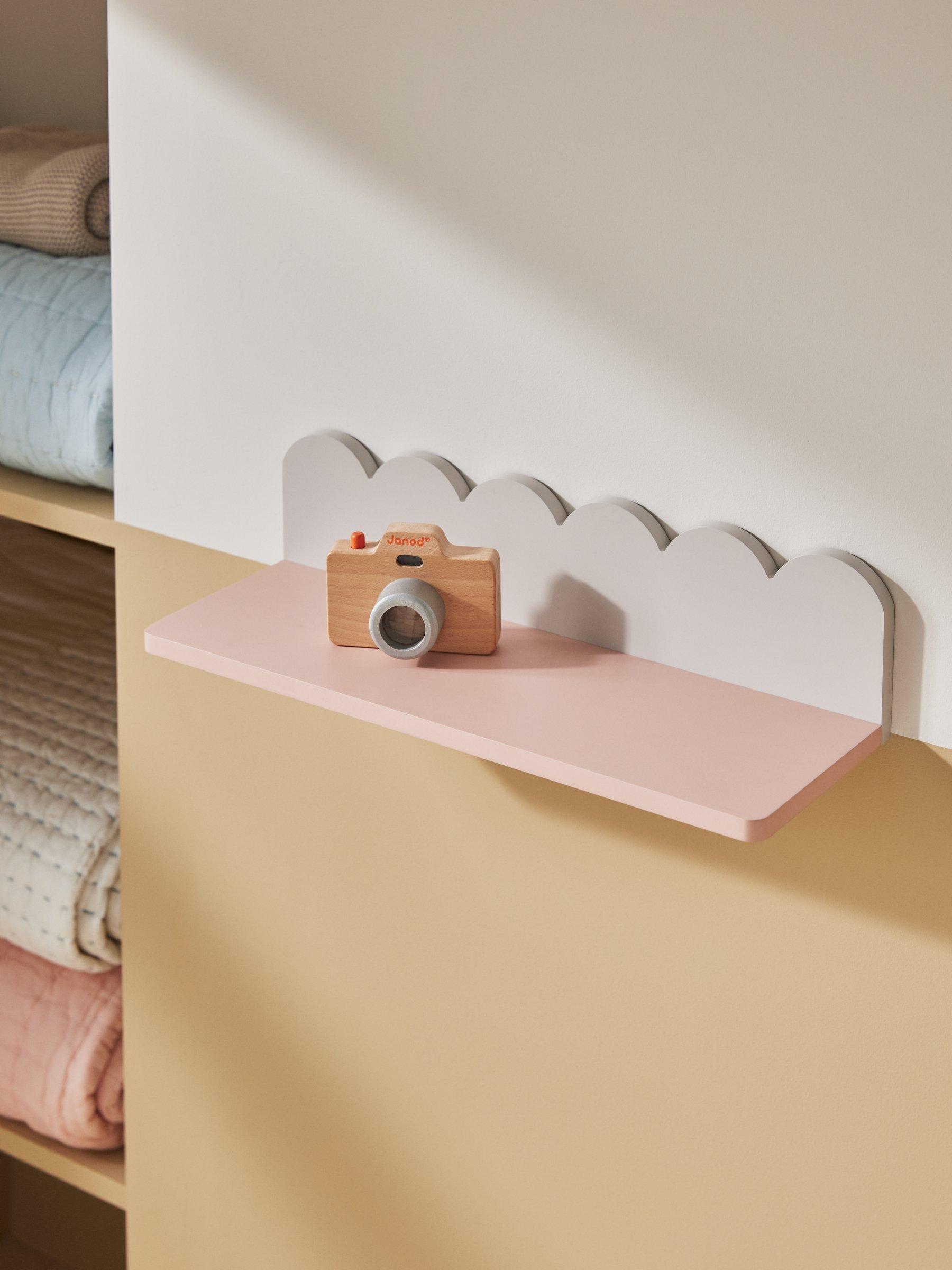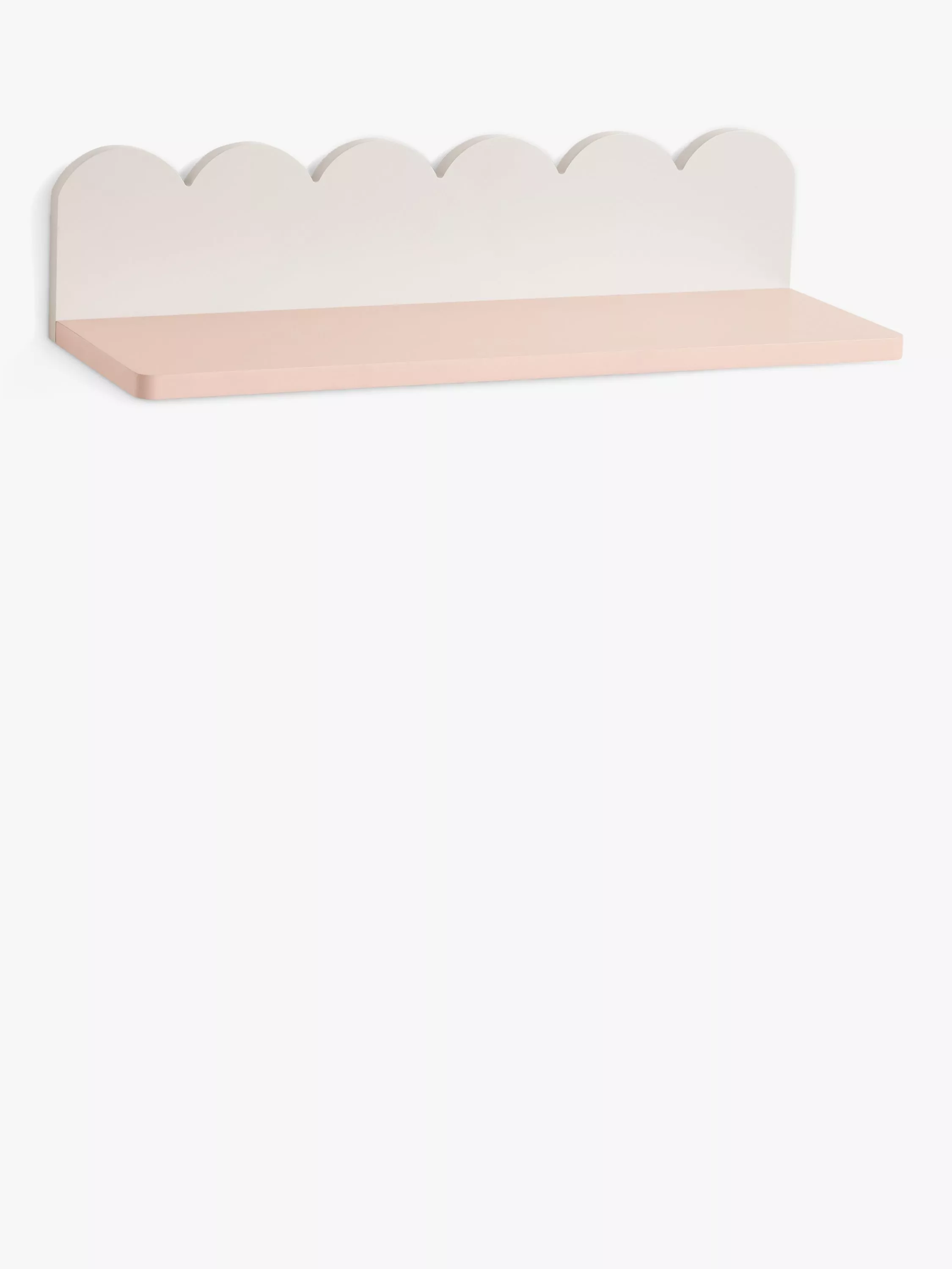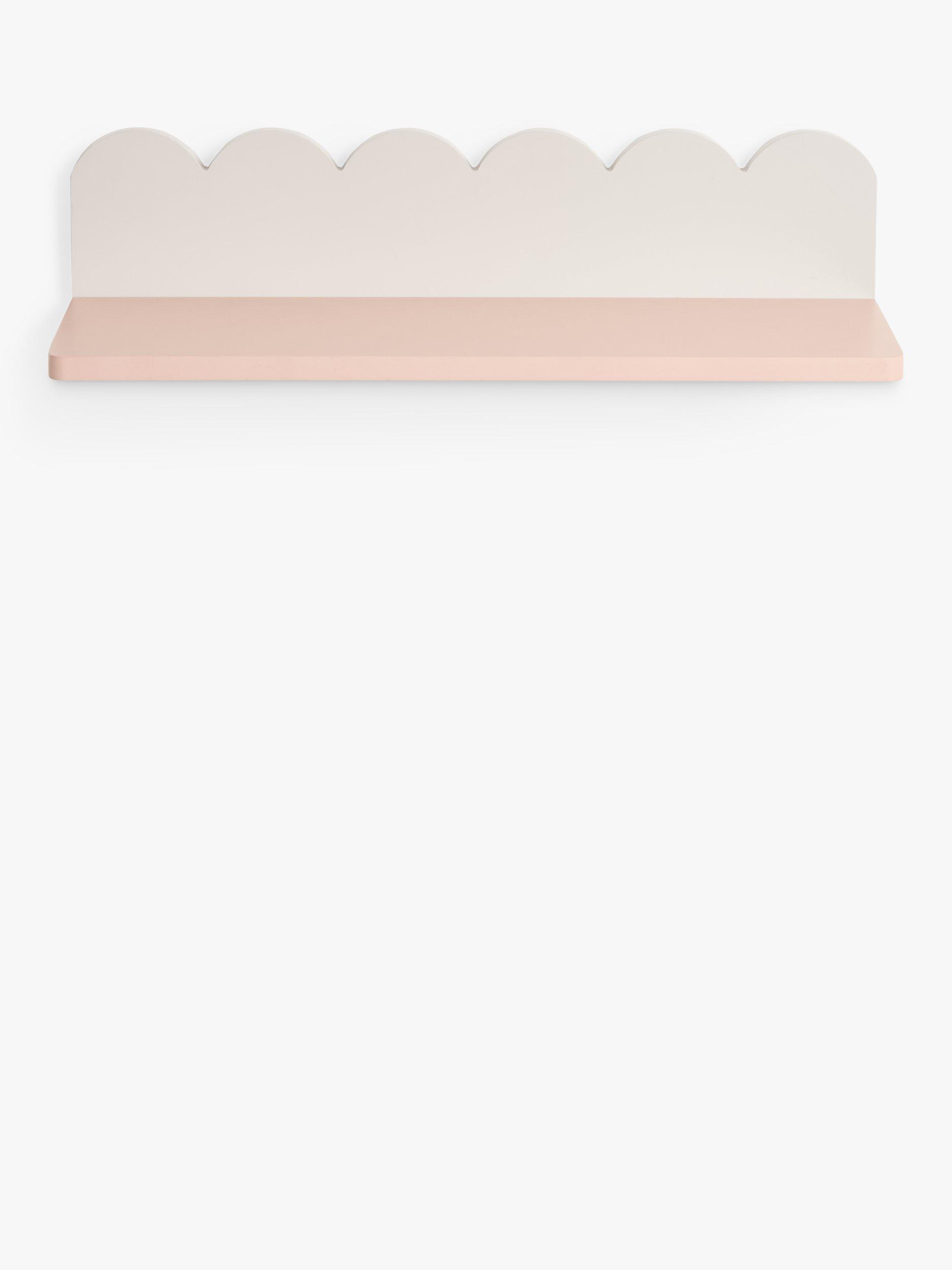 Add some fun detail to their space with this scalloped wall shelf from our collection. Simply designed, this shelf has a scalloped shape that is reminiscent of clouds but neutral enough to fit into any themed room.