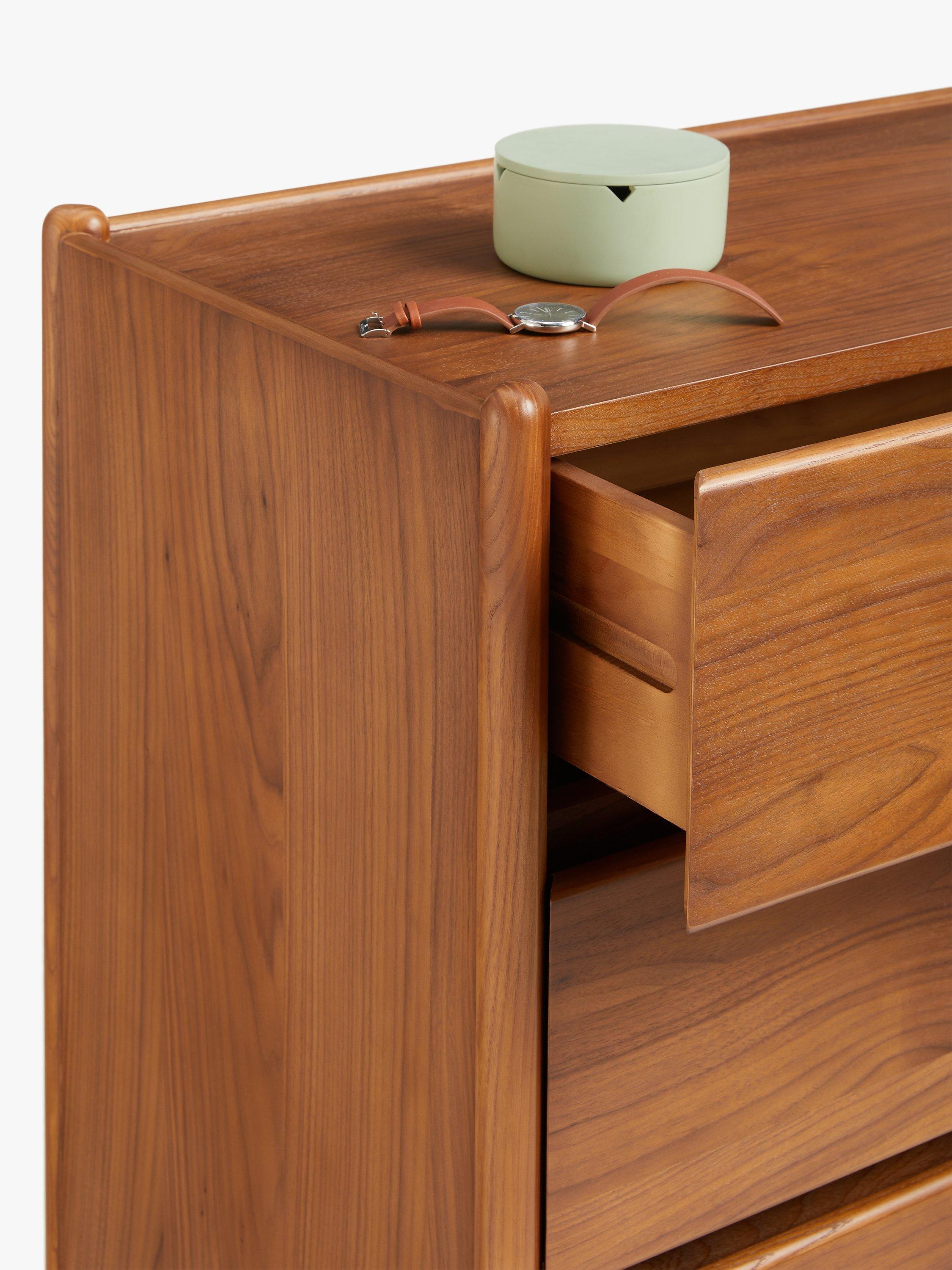 Our Scandi Walnut range of bedroom furniture is a celebration of natural and minimalist design, built to last. This bedside table has three storage drawers and the top surface has a slight tray-edge design so your bedside essentials stay secure. Its rounded posts, tapered legs and sleek, handle-less drawers all honour Scandinavian design principles, so it's perfect for keeping your bedroom a calm, uncluttered and simple space.