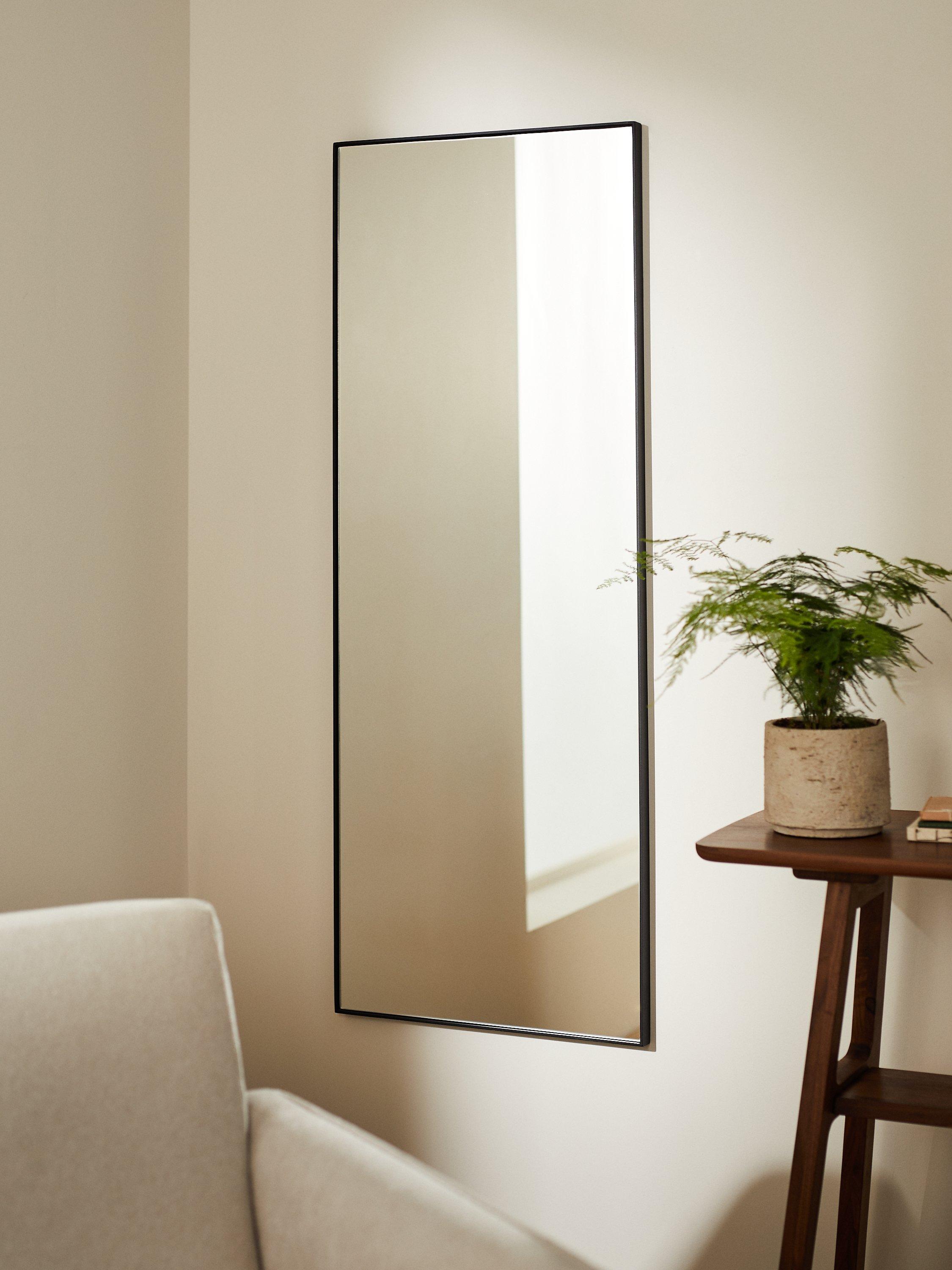 Framed by a metal rim, this rectangular hall mirror adds contemporary style to a room. Wall mount, vertically or horizontally, using the keyhole fitting on the reverse side.