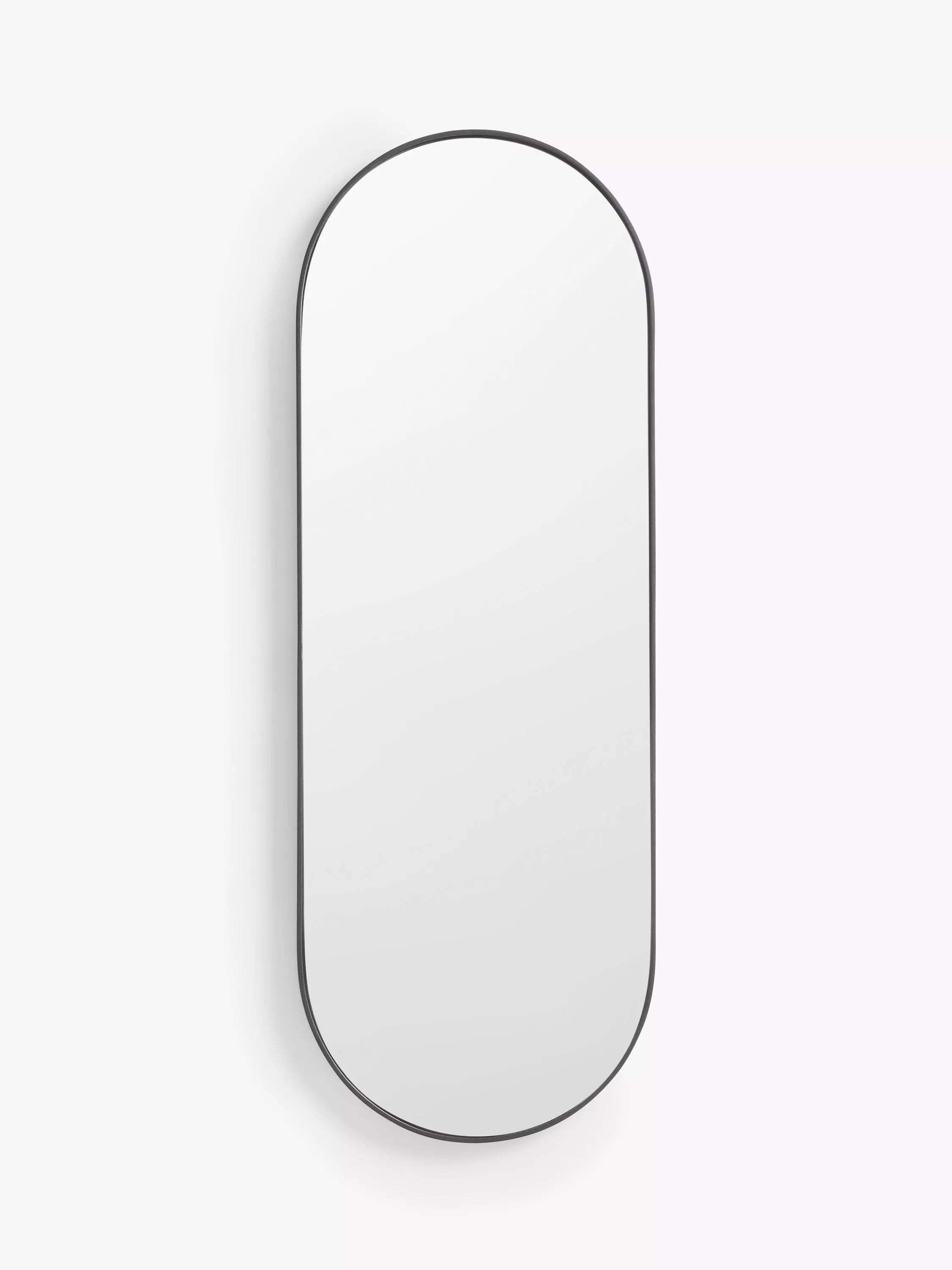 Handmade with gently rounded edges, this Scandi wall mirror has a lozenge shape and metallic frame. Wall-mount it horizontally or vertically to suit your room, by the keyhole hangers on the back.