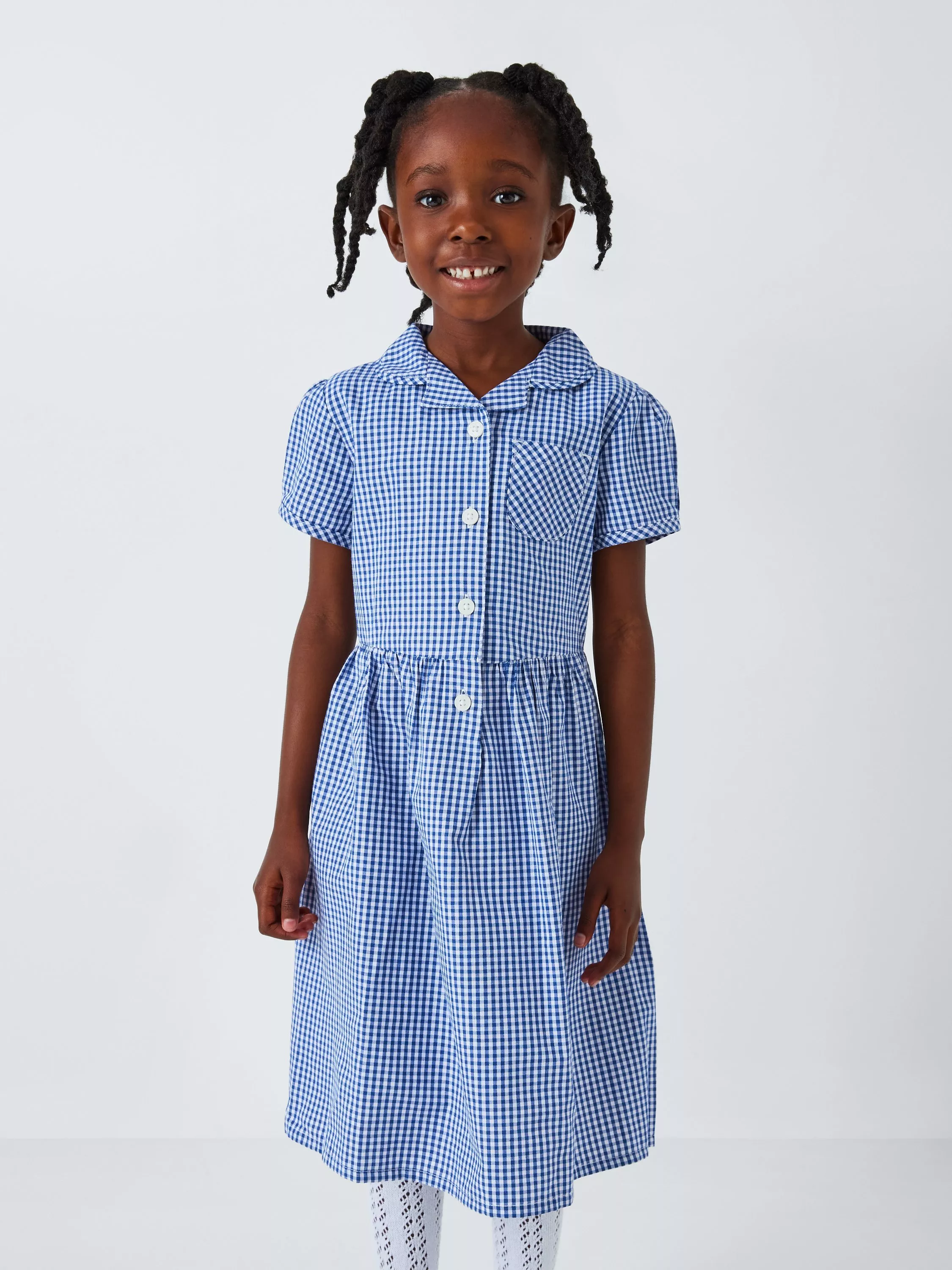 This smart school dress features the classic small gingham check pattern, front button fastening from the waist up and a small collar. Ideal for keeping her looking smart and feeling comfortable throughout the day, the slim tie belt gives the dress both shape and detail.