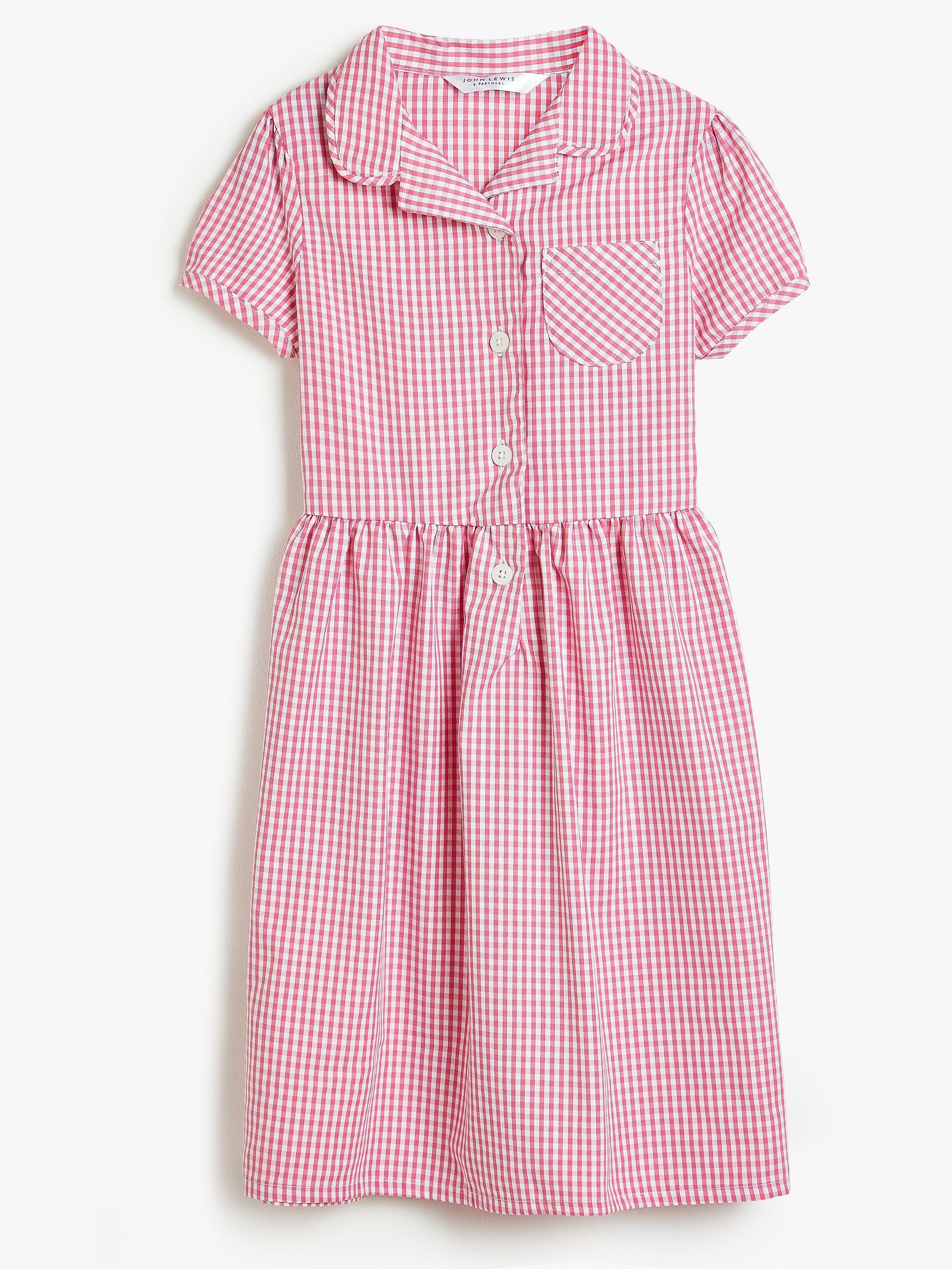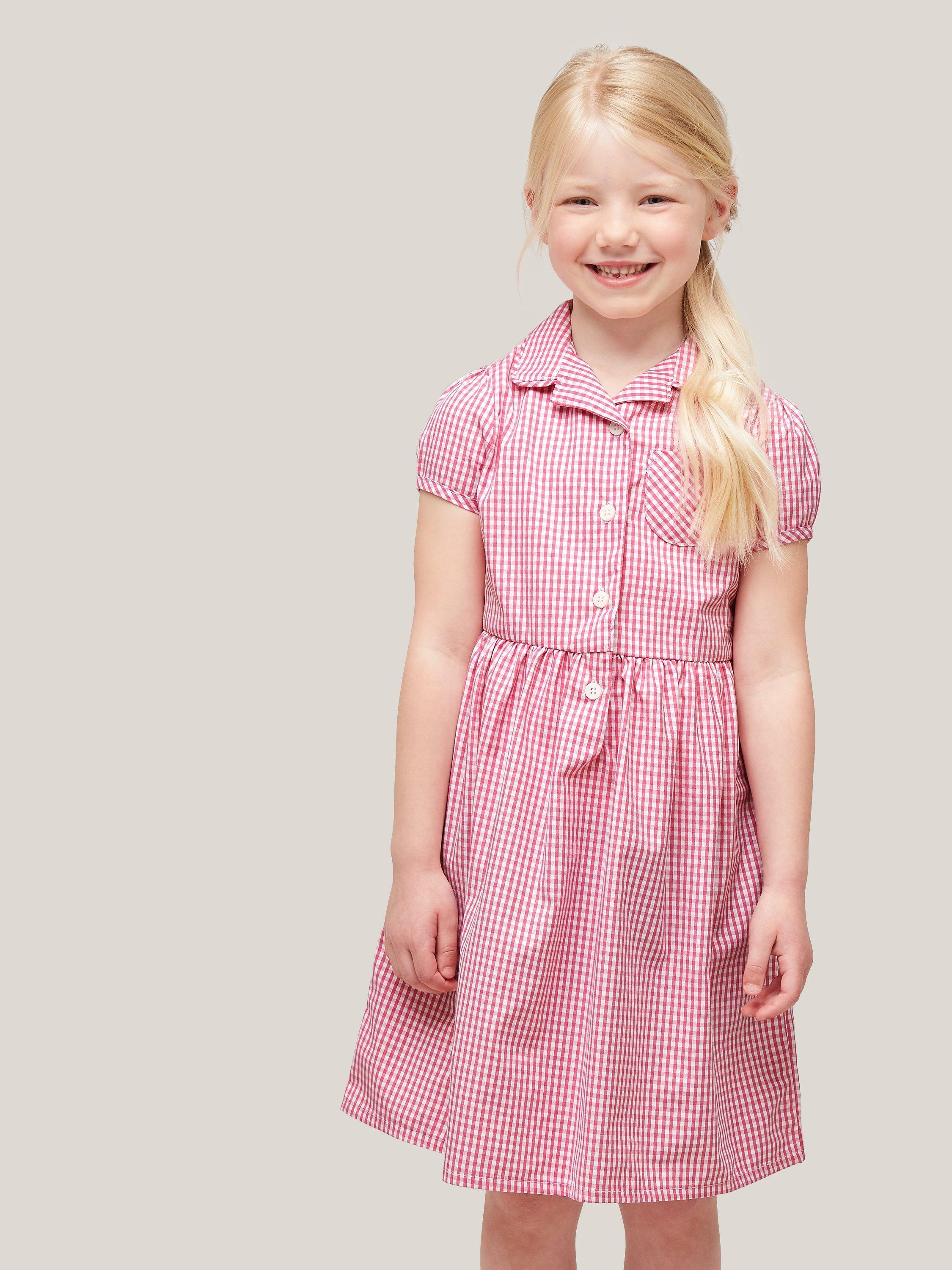 This smart school dress features the classic small gingham check pattern, front button fastening from the waist up and a small collar. Ideal for keeping her looking smart and feeling comfortable throughout the day, the slim tie belt gives the dress both shape and detail.