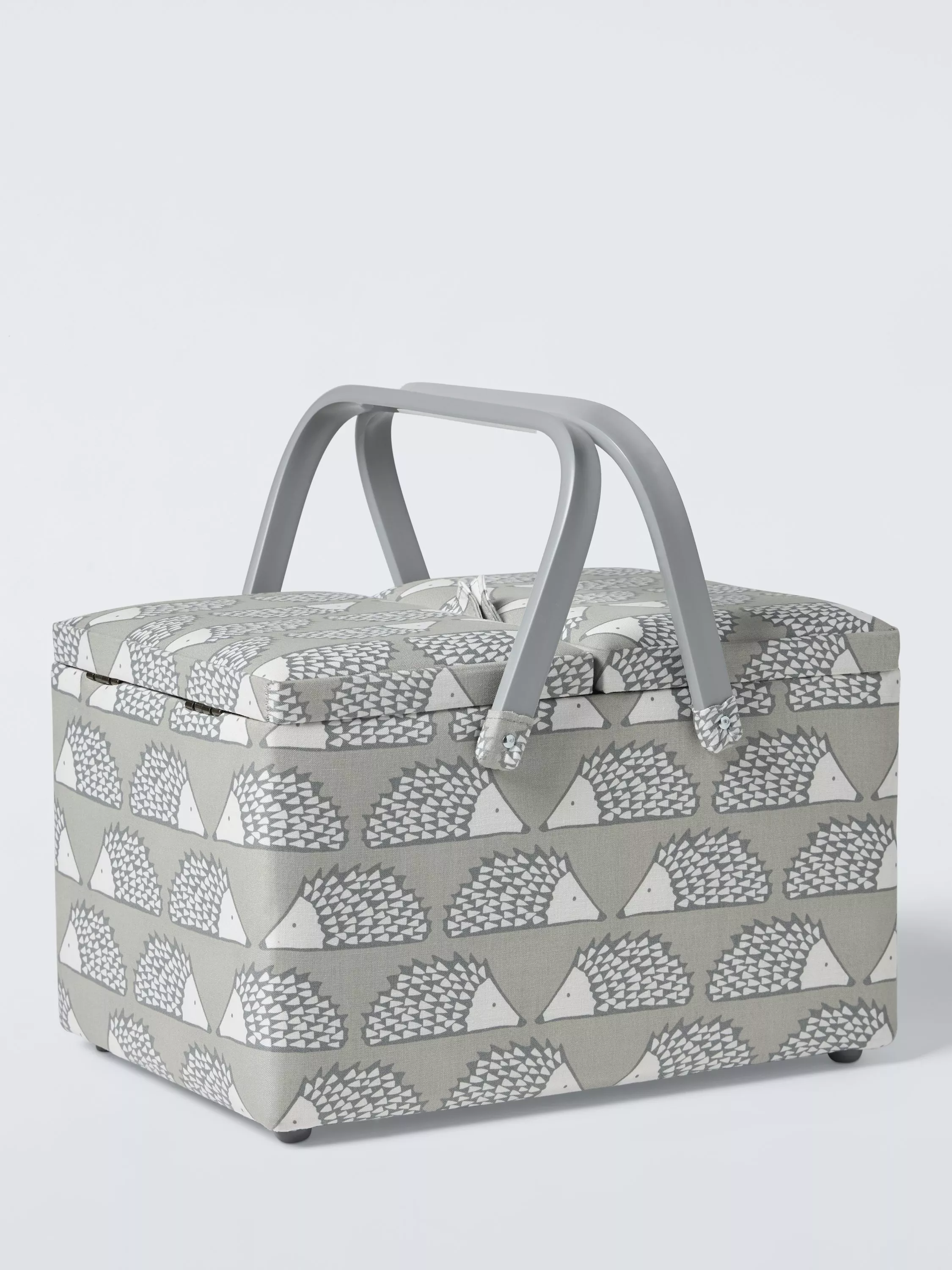 Covered in soft printed cotton, this twin lid sewing basket has a double grab handle that allows for ease of transport enabling you to sew on the go. It also has a removable plastic tray with plenty of compartment space for needles, thimbles and threads allowing you to organise your sewing kit in preparation for your next project. The removable tray lifts to reveal a spacious compartment that can be used for storing fabrics and other essential equipment. This basket is an essential for serious sewers.