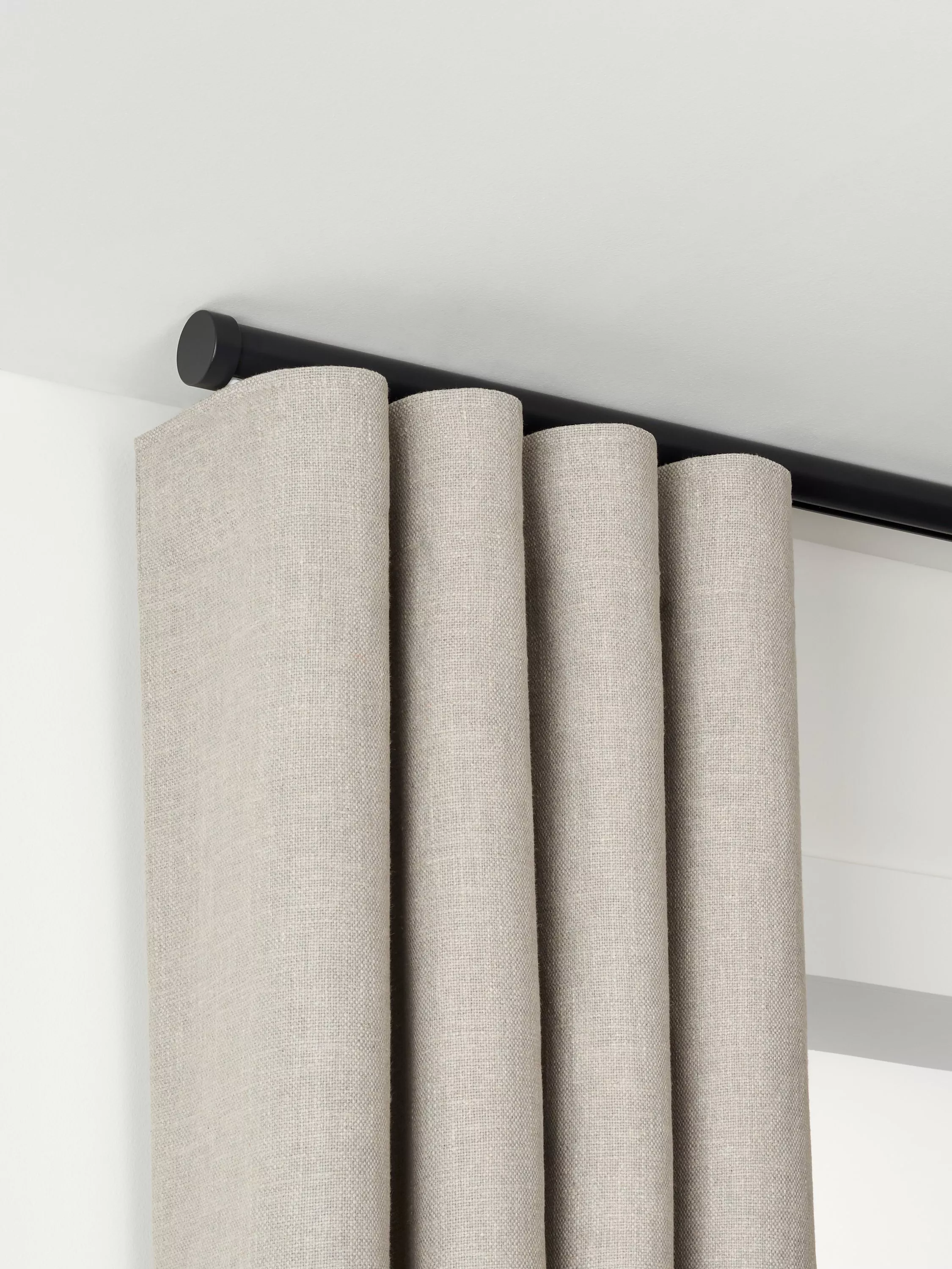 This particular version is our 30mm, ceiling-fix curl gliding pole with a stud finial. The gliders run smoothly in the pole channel, minimising noise as you open and close your curtains. It’s designed to be fitted flush to the ceiling and is suitable for hanging ‘S’ shape curtains with a curl heading style. If you pop into any of our shops and ask a Partner about our ‘Designed for You’ service they can help you create the perfect pair of curtains with this particular heading.
