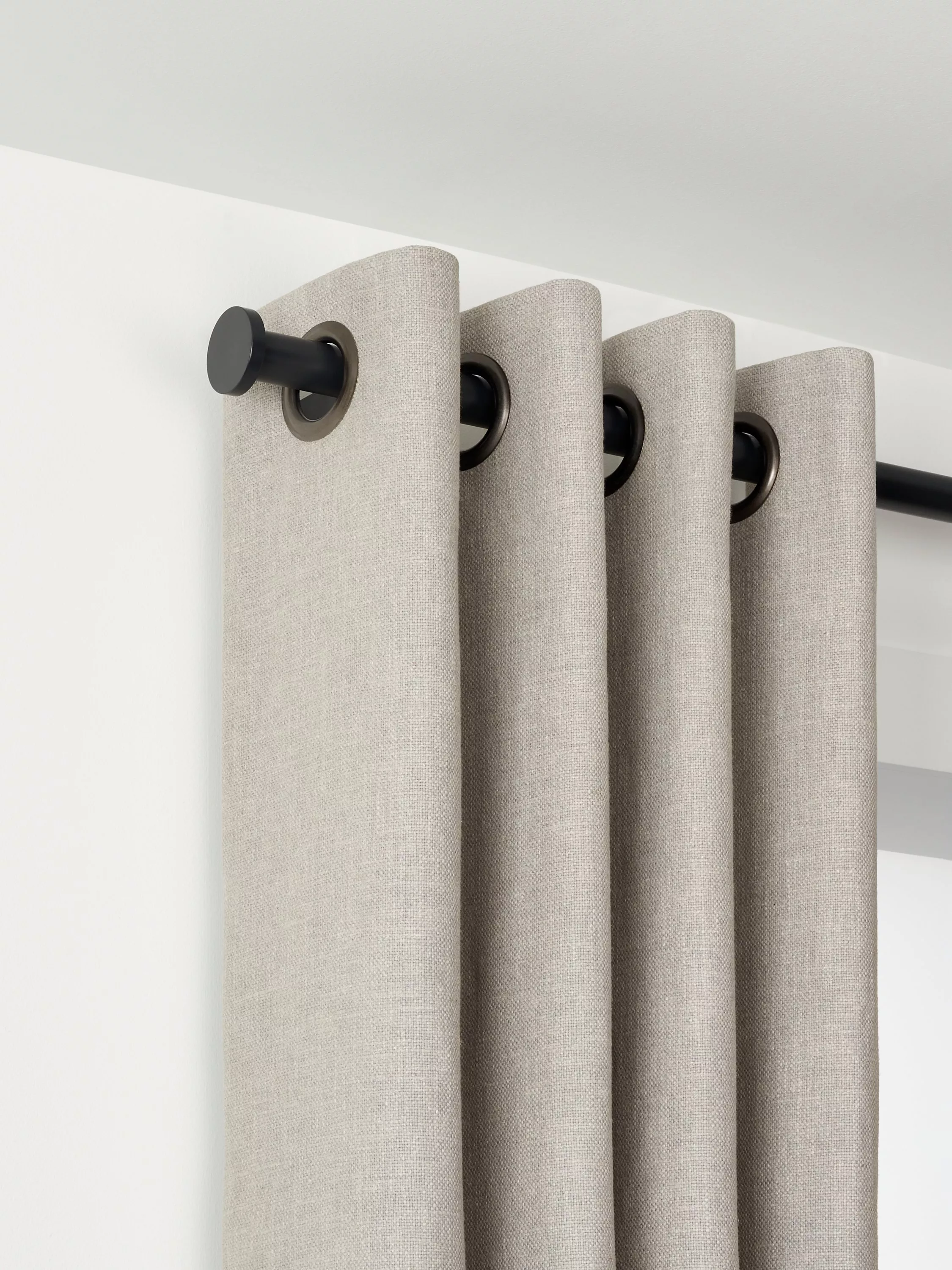 This particular version is our 25mm, wall-fix eyelet curtain pole with a disc finial. As the name suggests it's suitable for hanging eyelet curtains only.