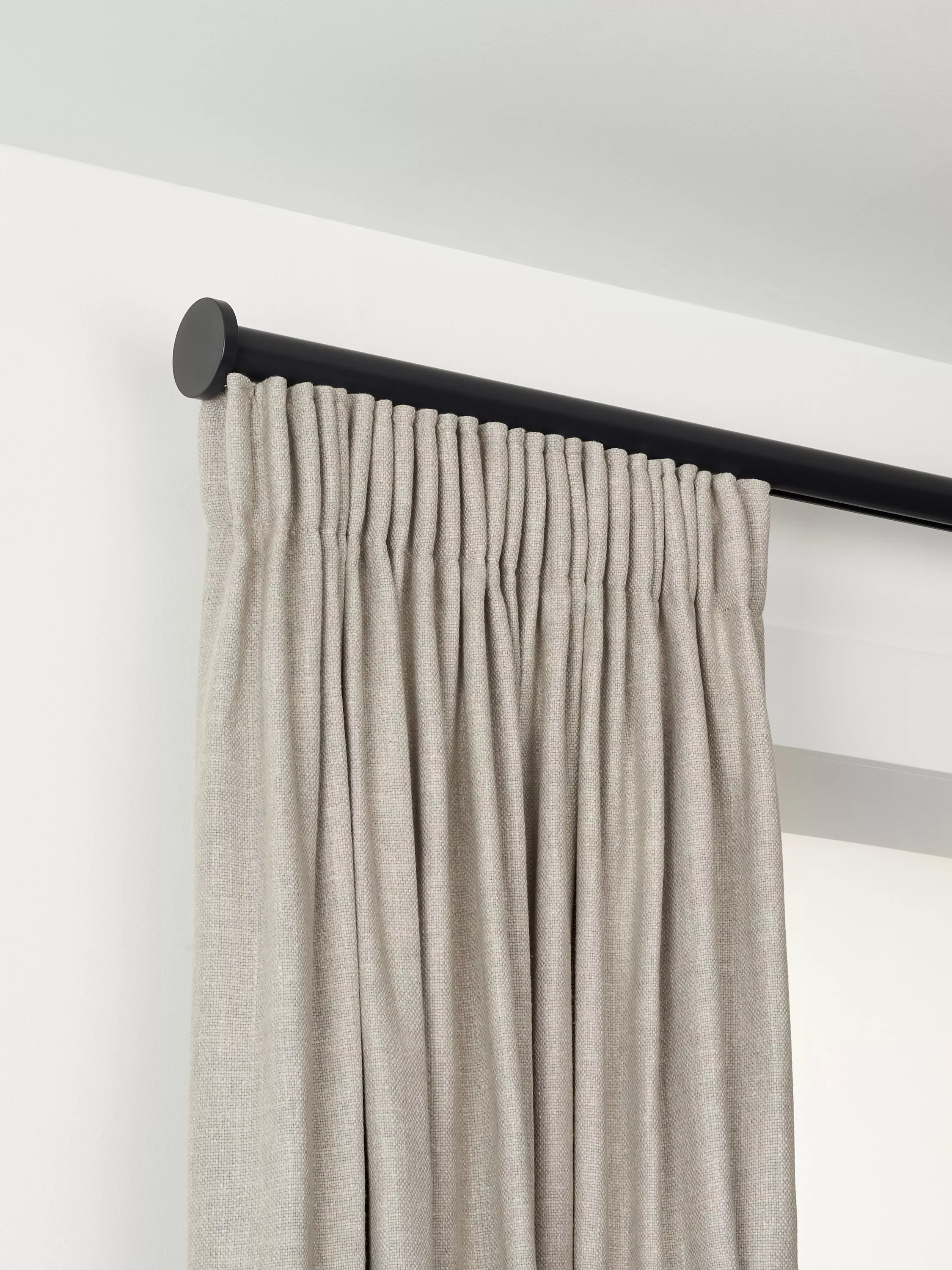 This particular version is our 30mm, wall-fix gliding curtain pole with a disc finial. It's suitable for hanging curtains with any pleated heading style. The gliders are designed to run smoothly in the pole channel, minimising noise as you open and close your curtains.