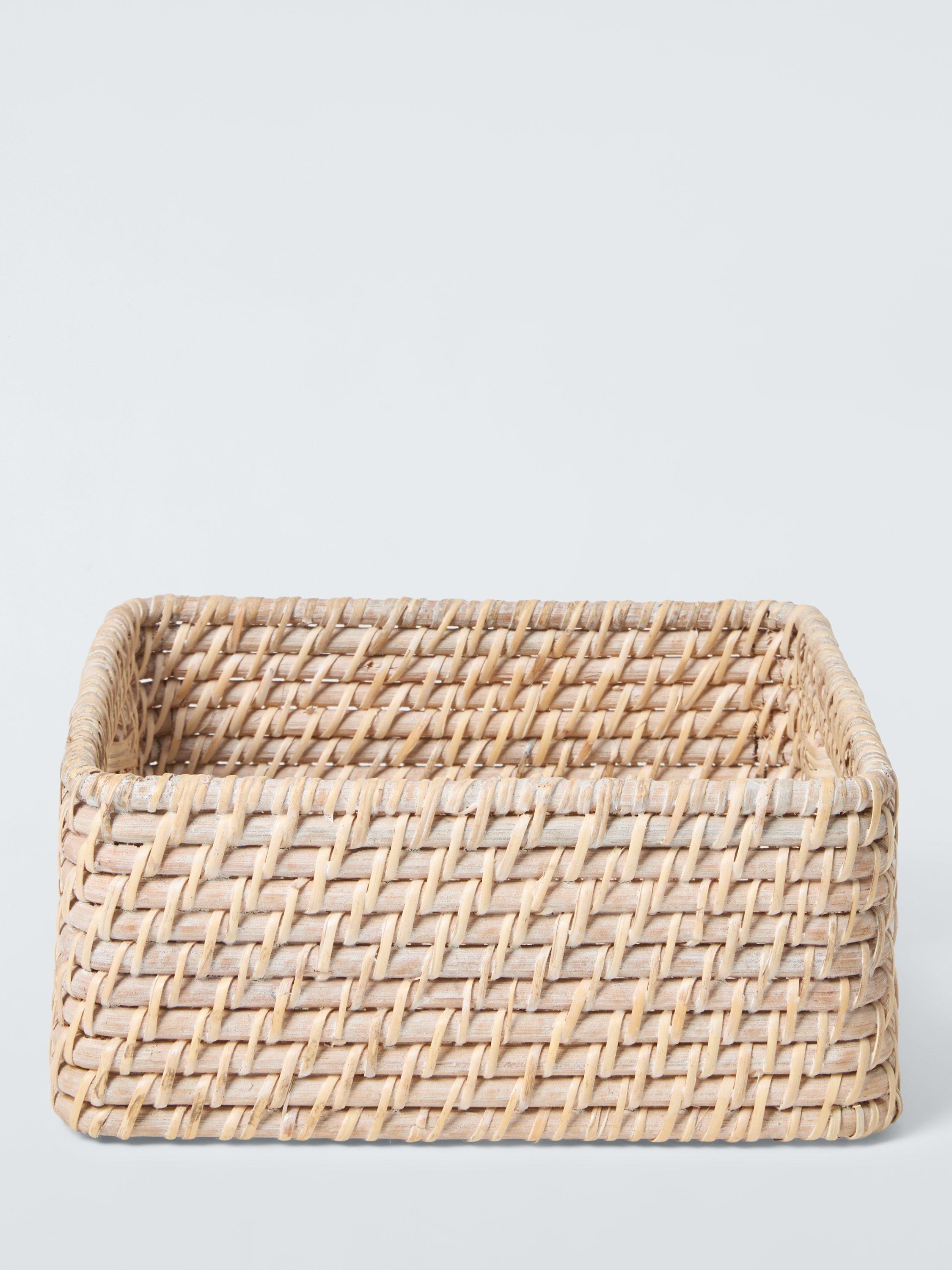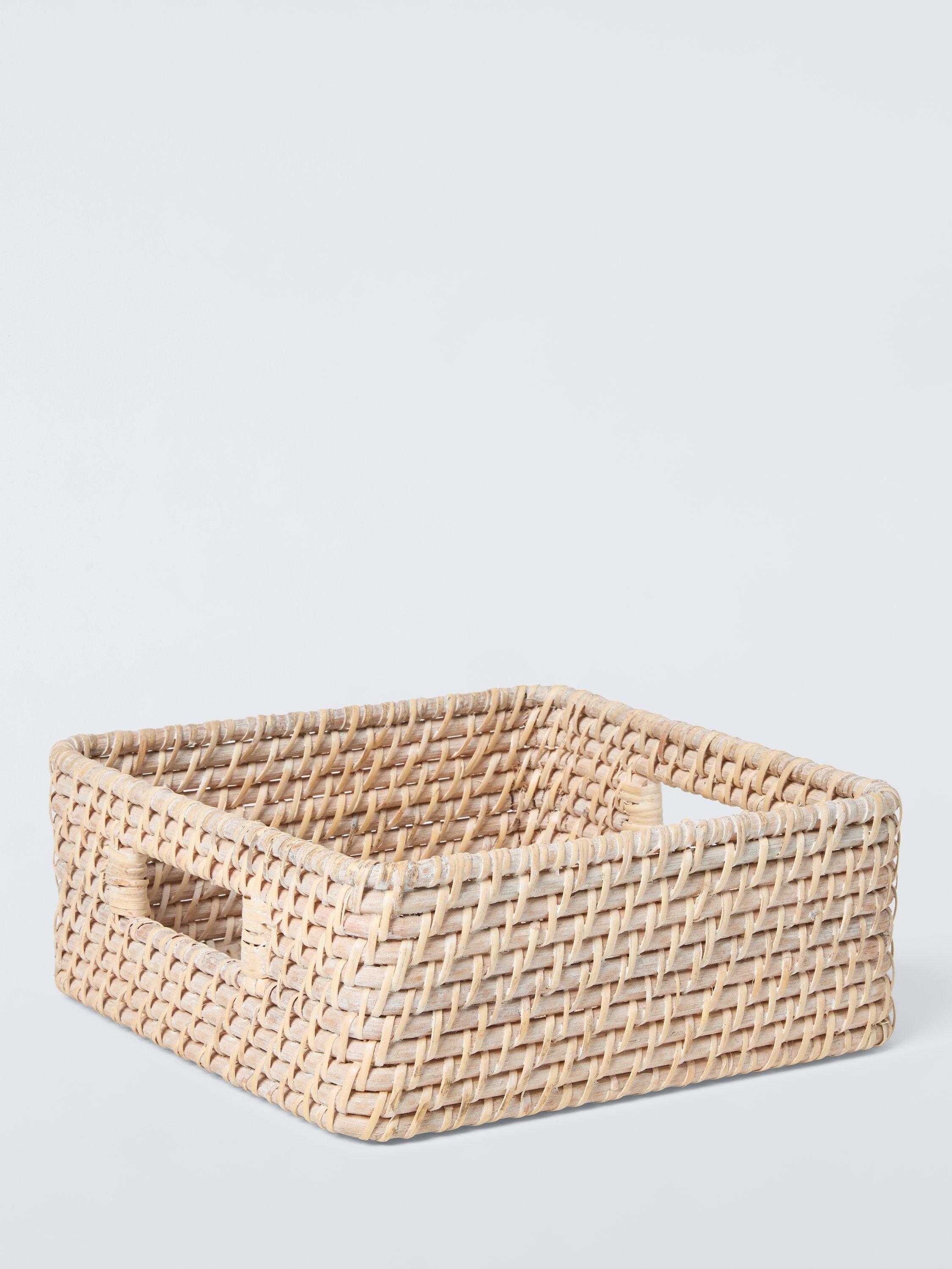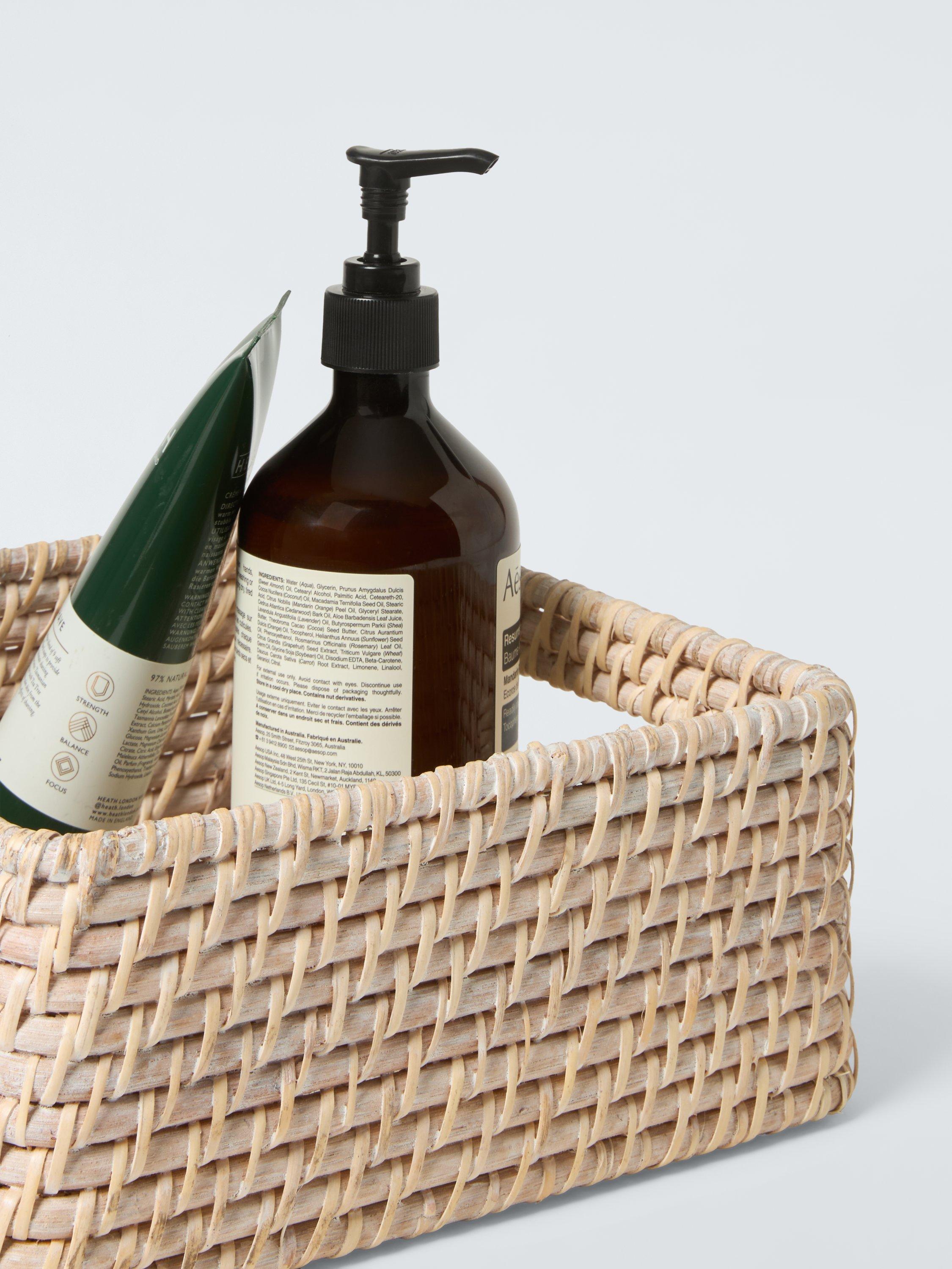 This rattan basket is perfect for neatly storing accessories in your bedroom or bathroom and comes with handles for convenience.