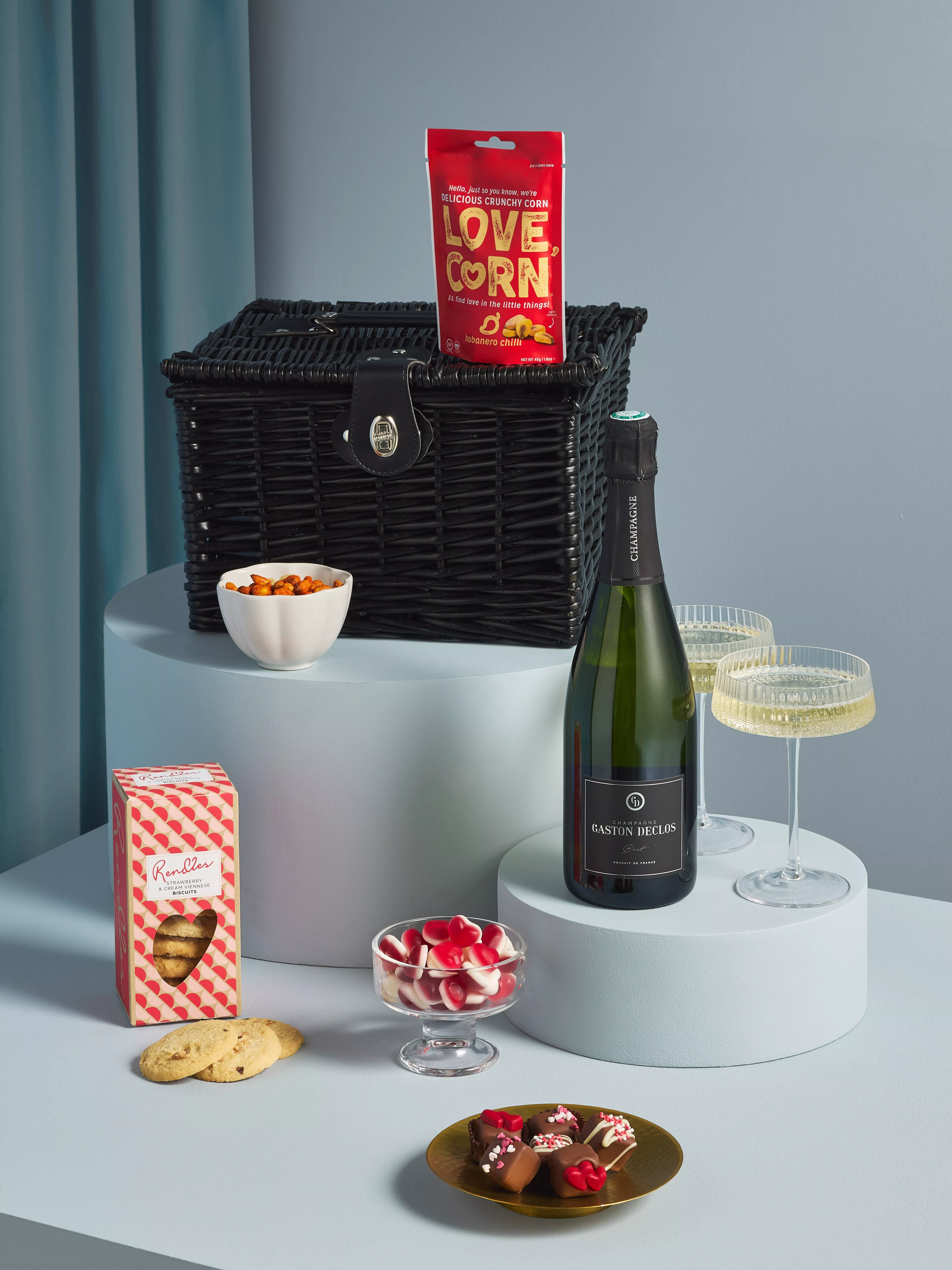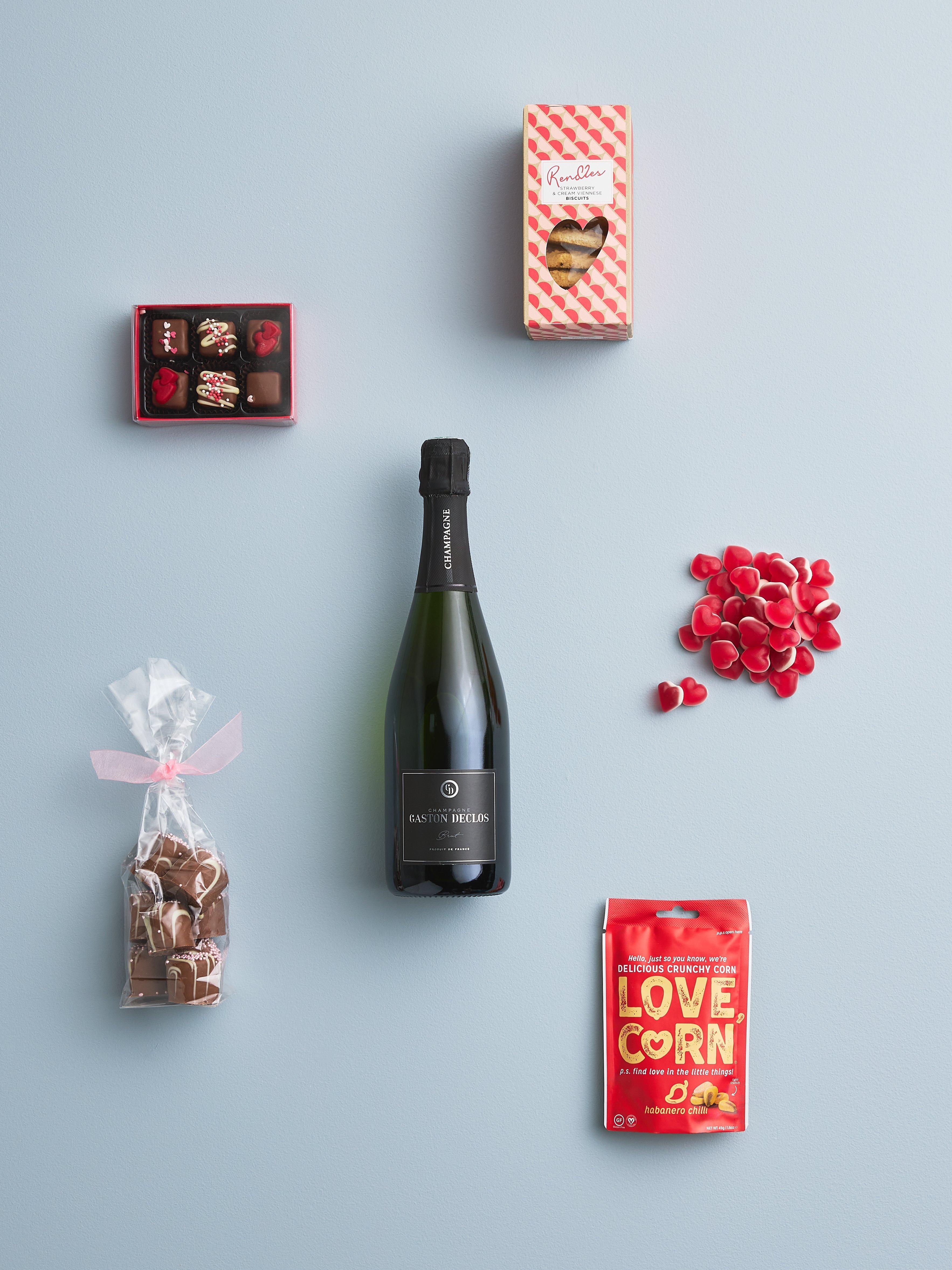 - Gaston Declos Champagne 75cl Rendles Strawberry & Cream Viennese Biscuits 150g Farrah's of Harrogate Hand Packed Gummy Hearts 150g Linden Lady 6 Chocolates with Red Hearts, Sprinkles & Mini Hearts 75g Love Corn Habanero Chilli Crunchy Corn 45g