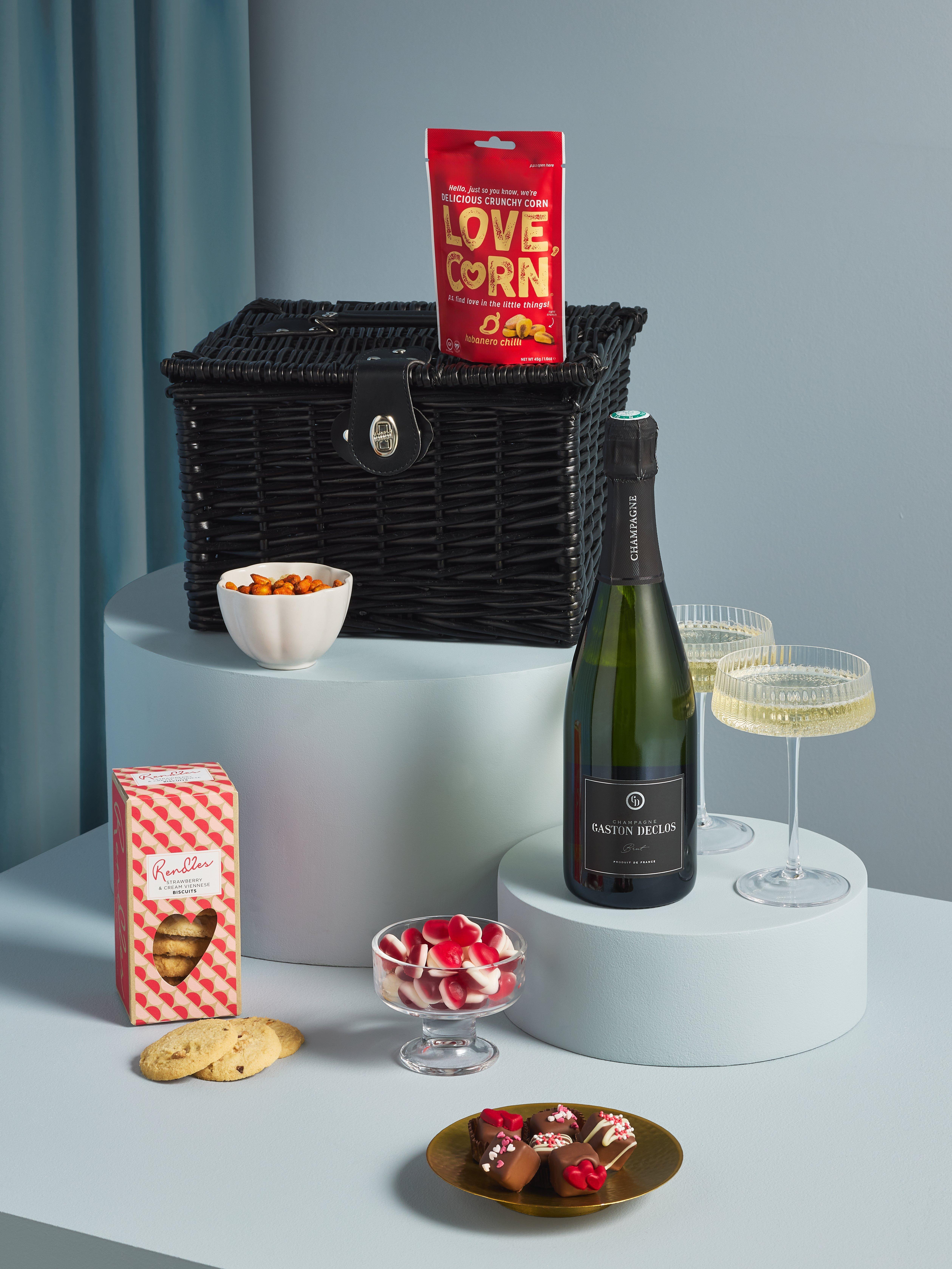 Share the love with our classic wicker hamper, filled with delicious love inspired treats and a bottle of Gaston Declos Champagne, 75cl.