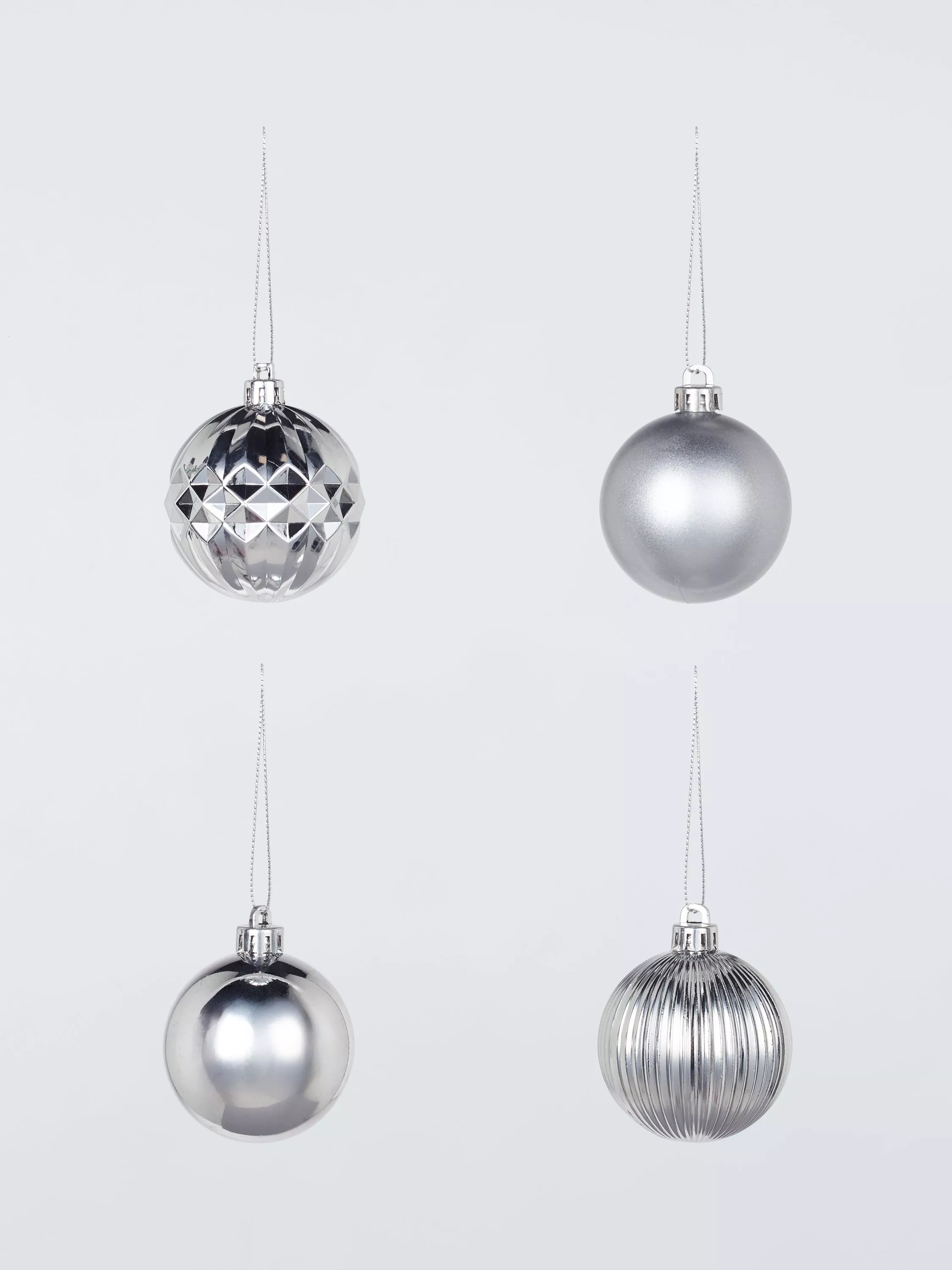 30 shatterproof Christmas baubles in shiny and matte silver.