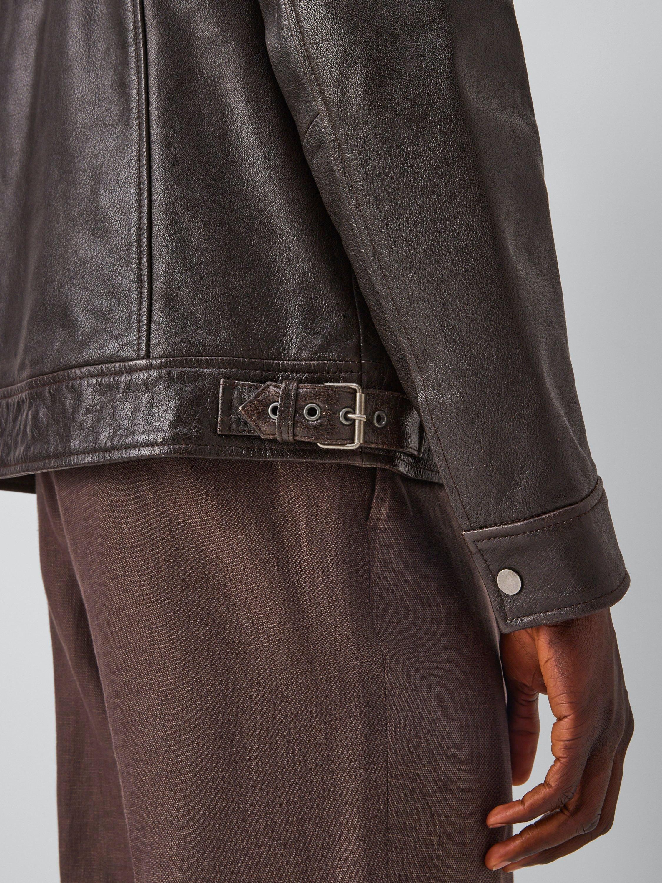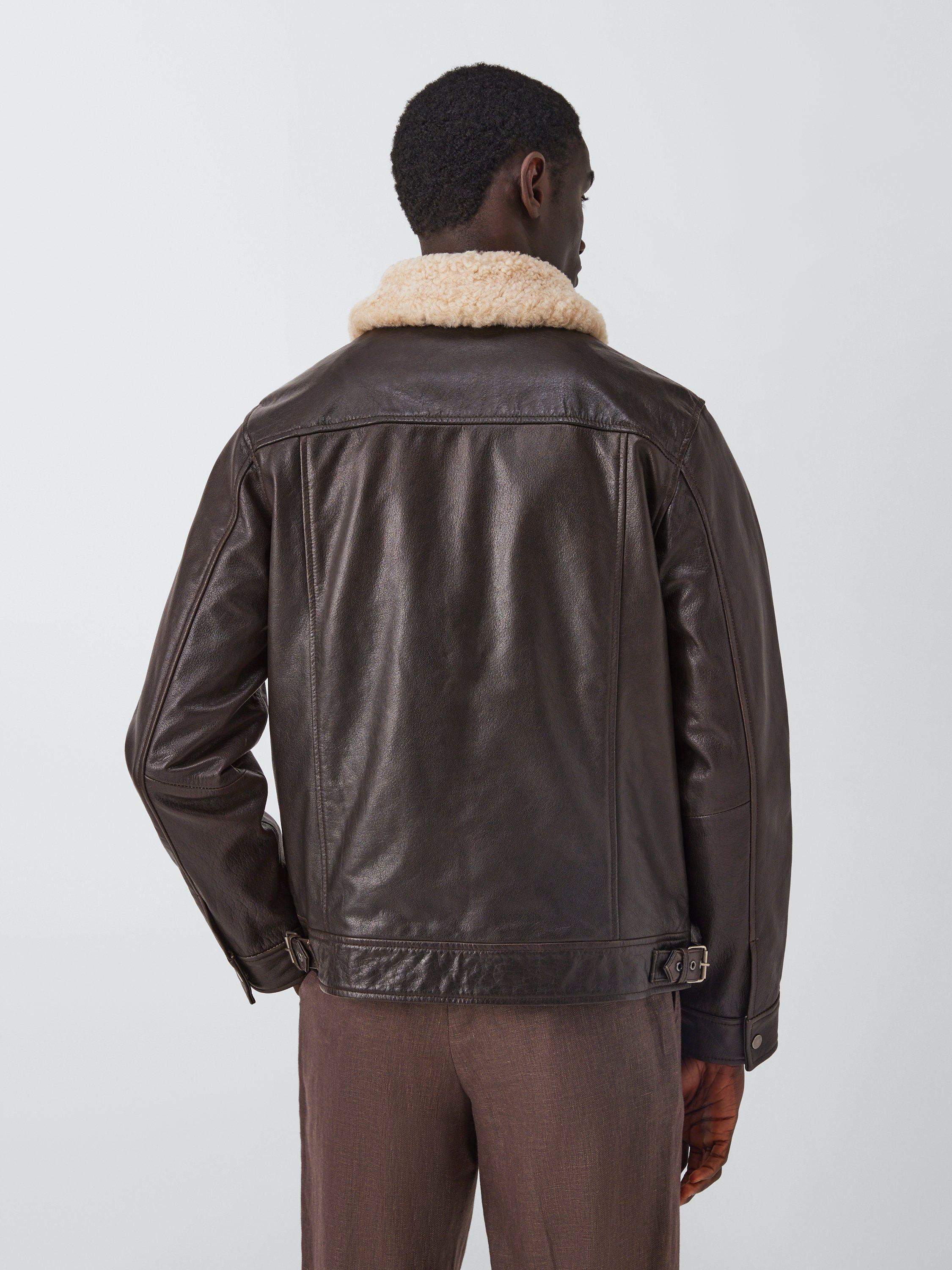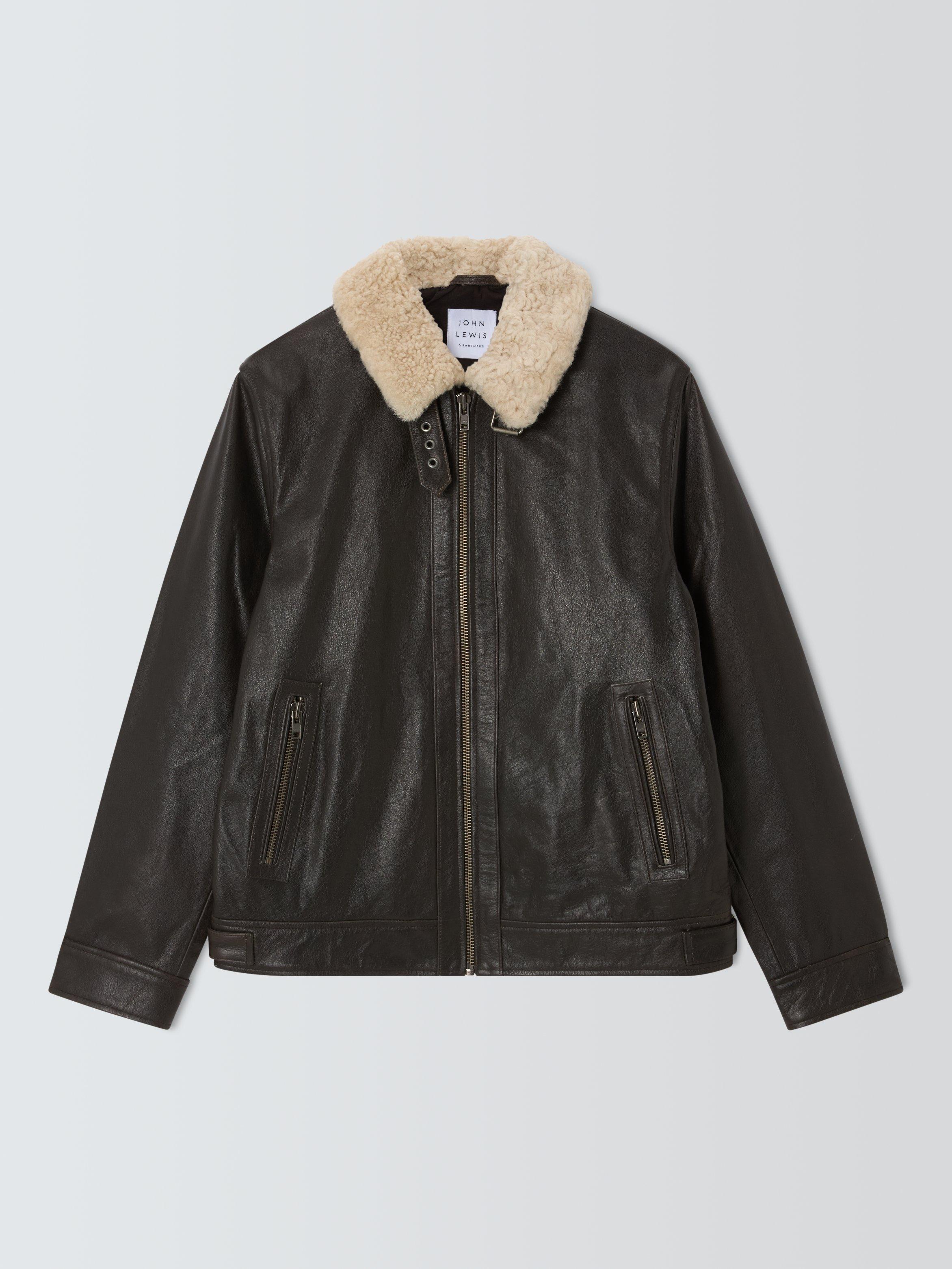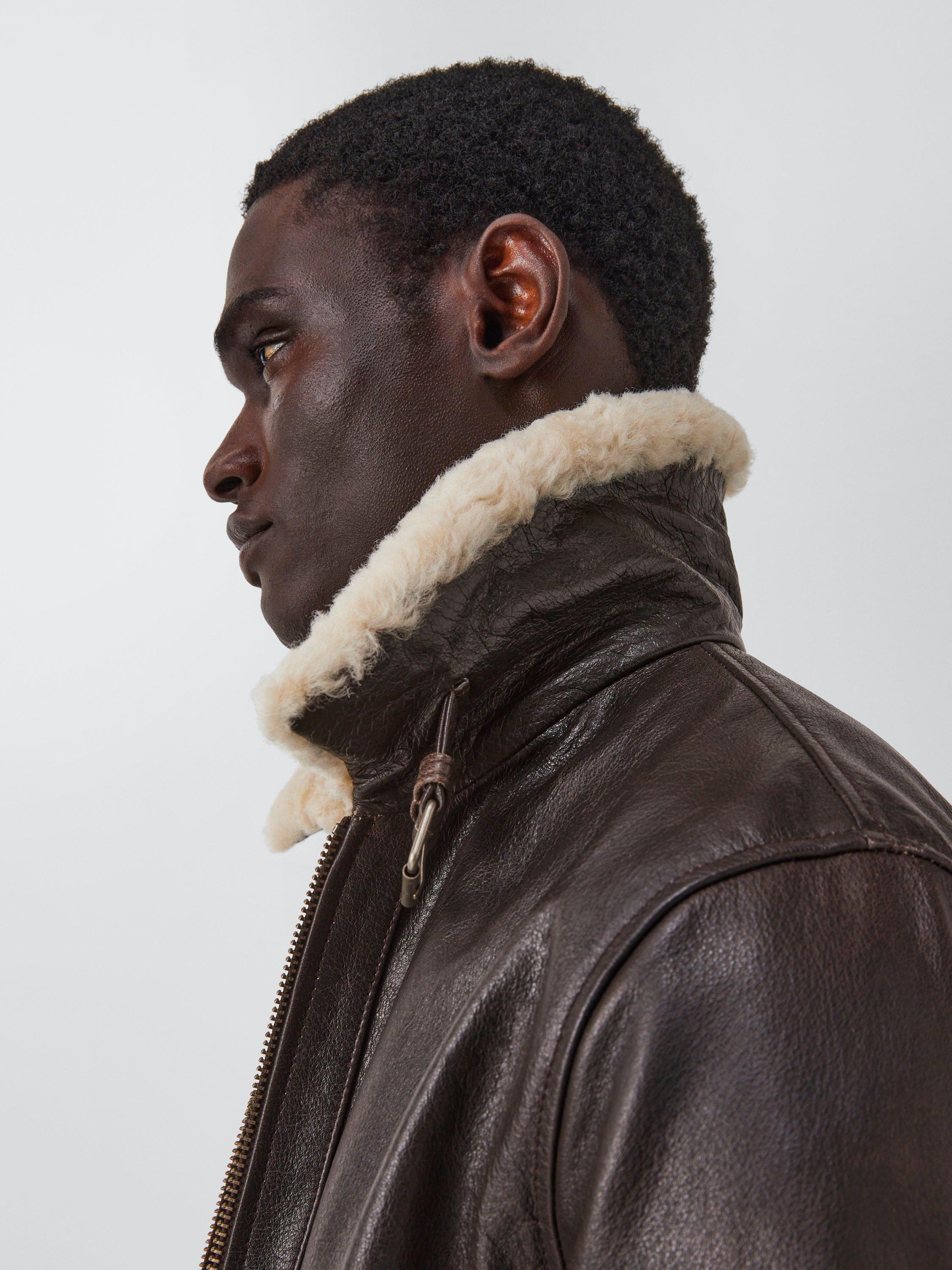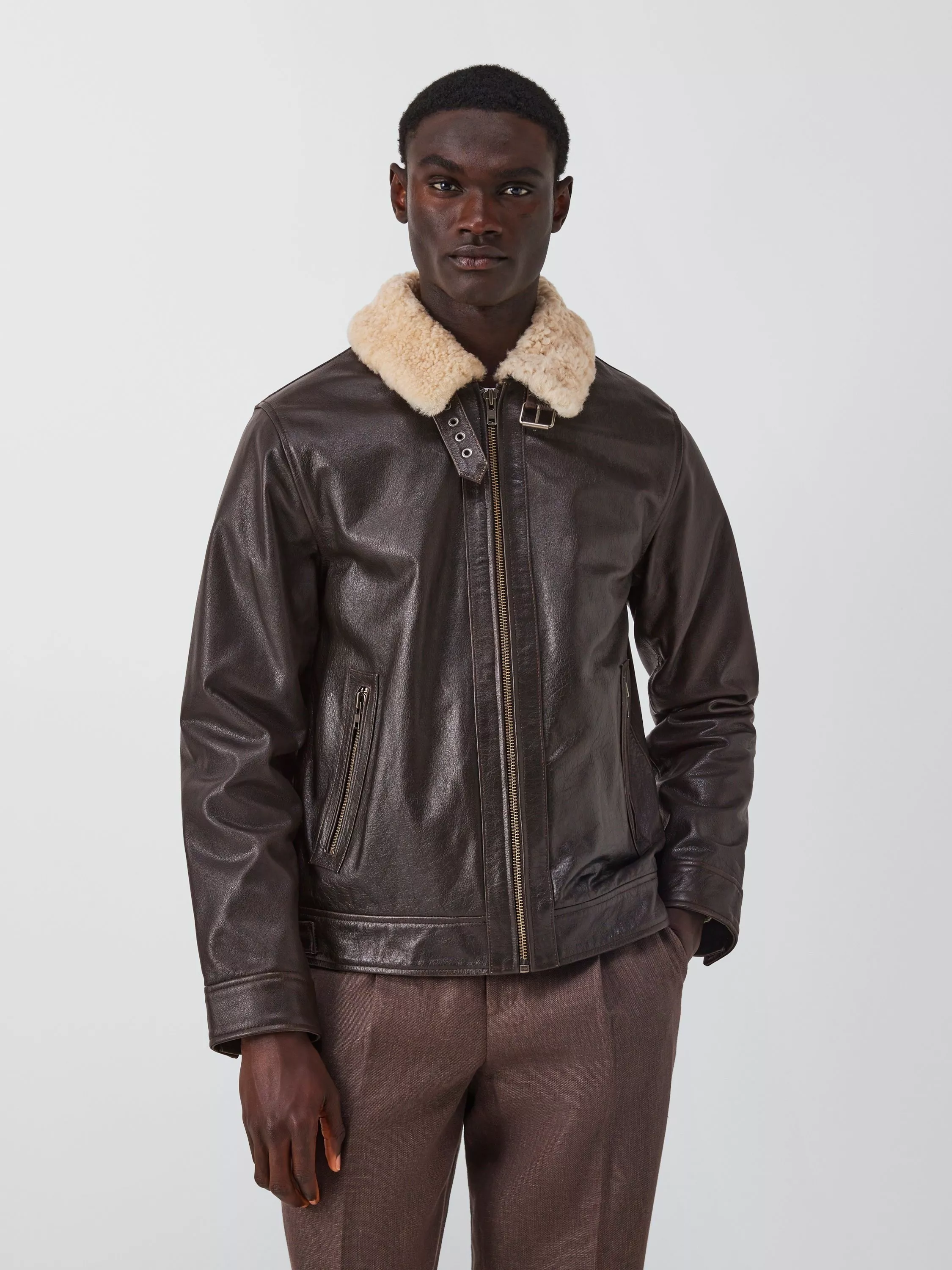 Aviator-inspired leather jacket with a shearling collar. Styled with a metal centre front zipper, two zipped side pockets, self buckle adjuster tabs at the front collar and buckle adjusters at the hem.
