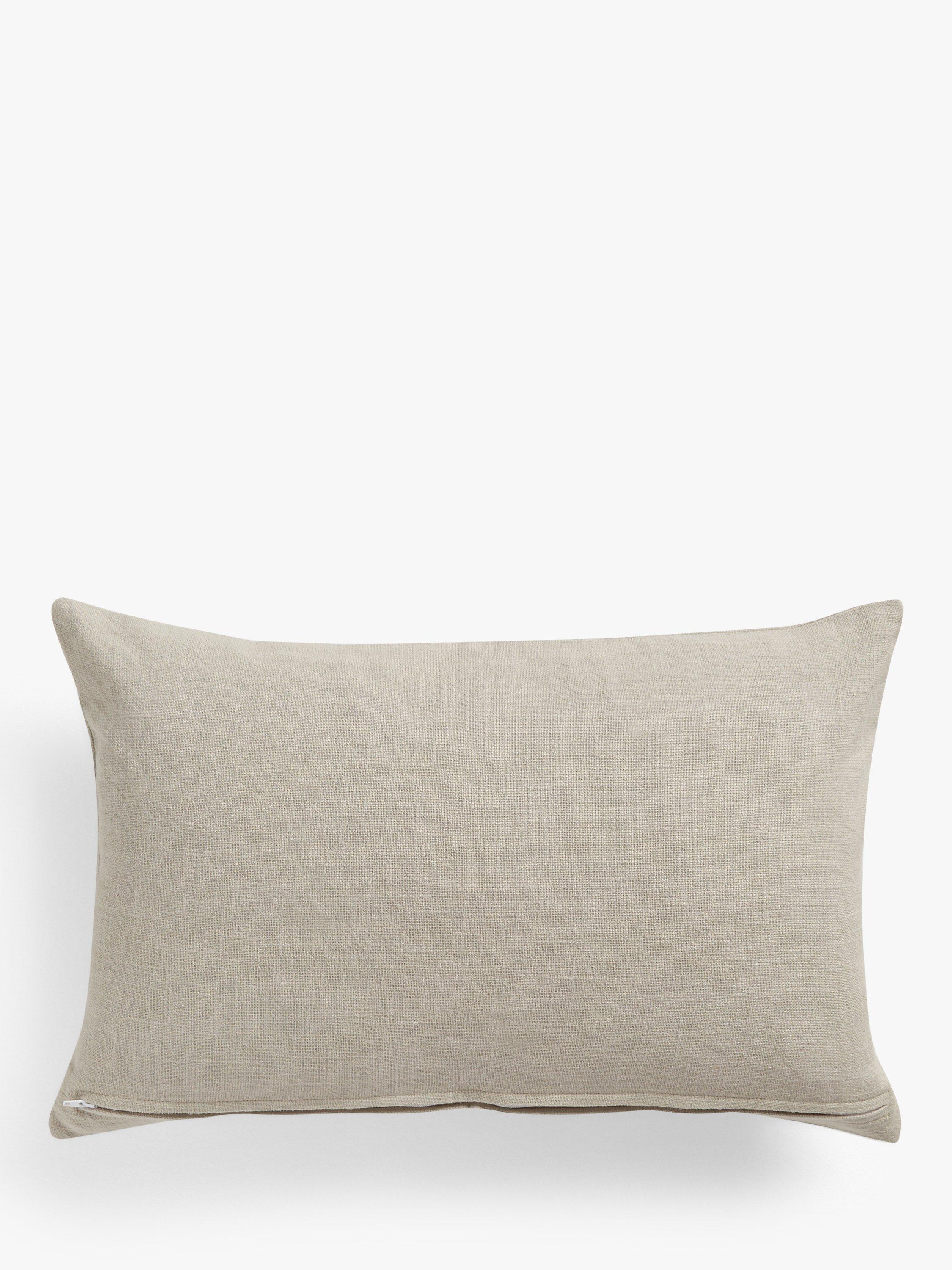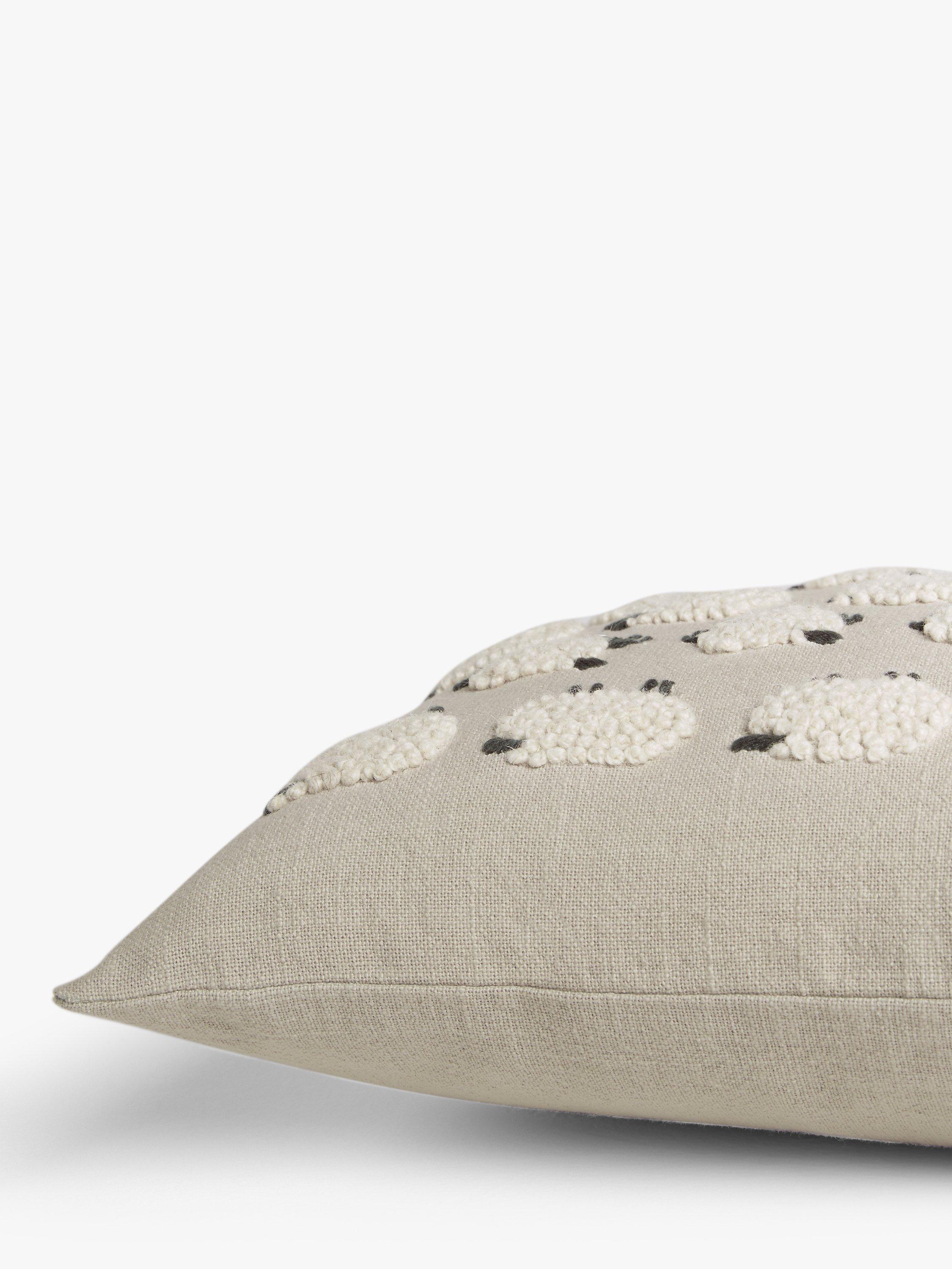 A flock of embroidered bouclé sheep skip over the natural background of this cute cushion.