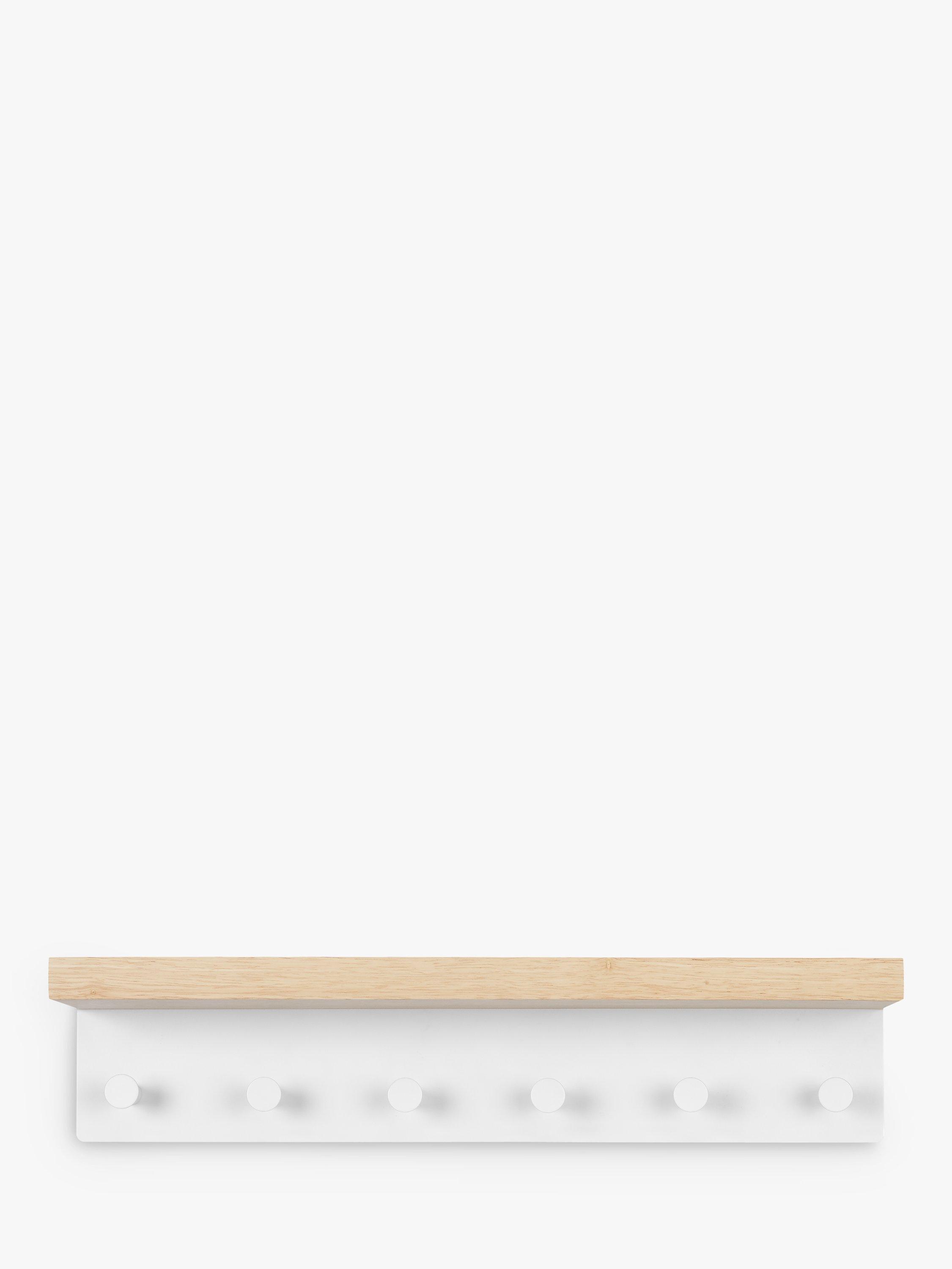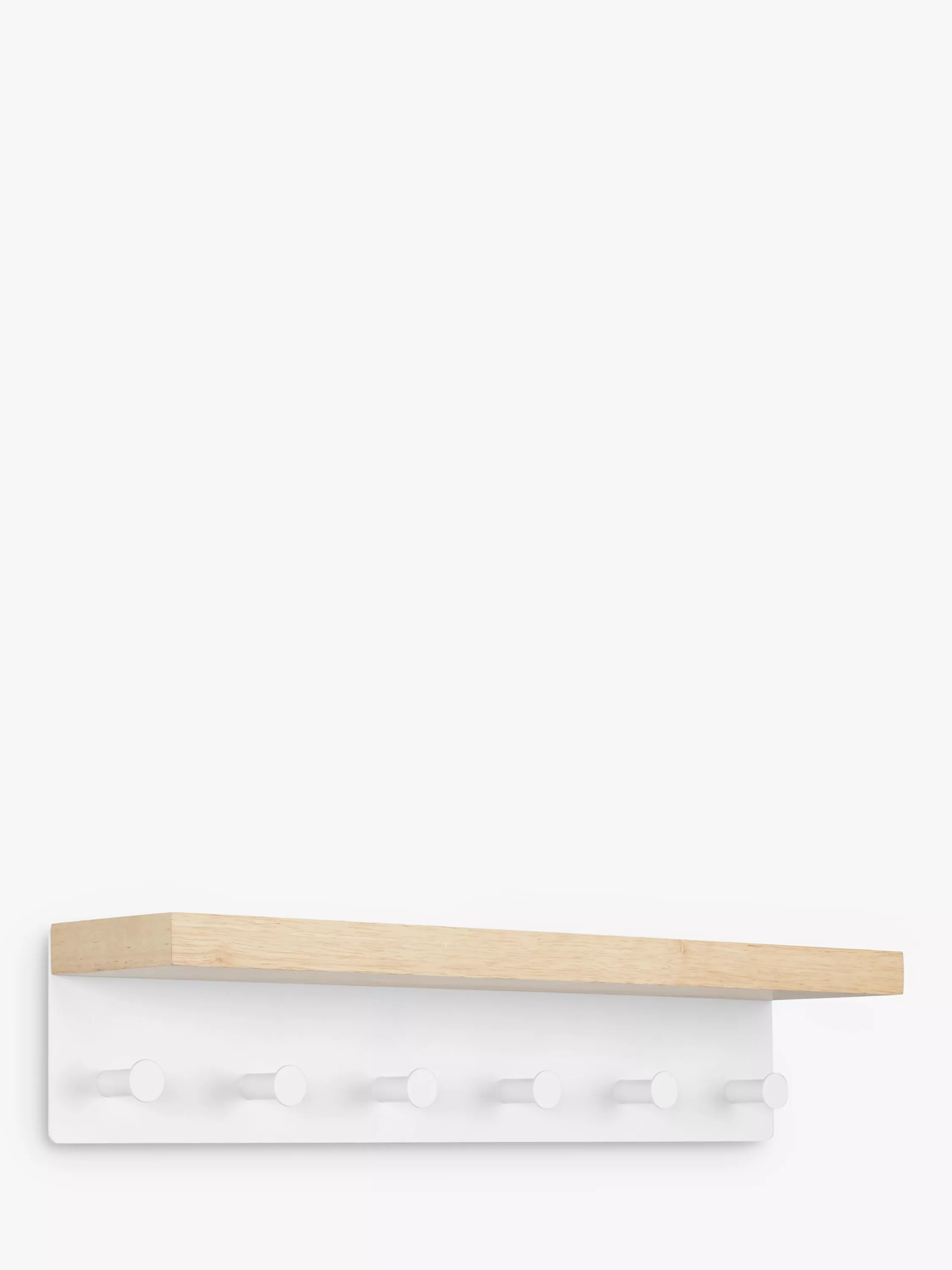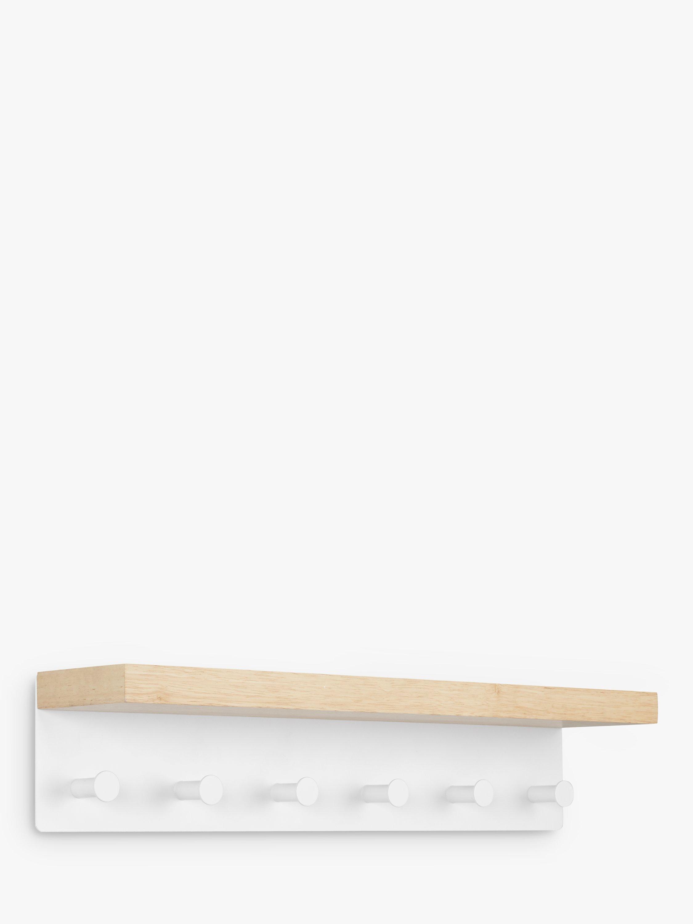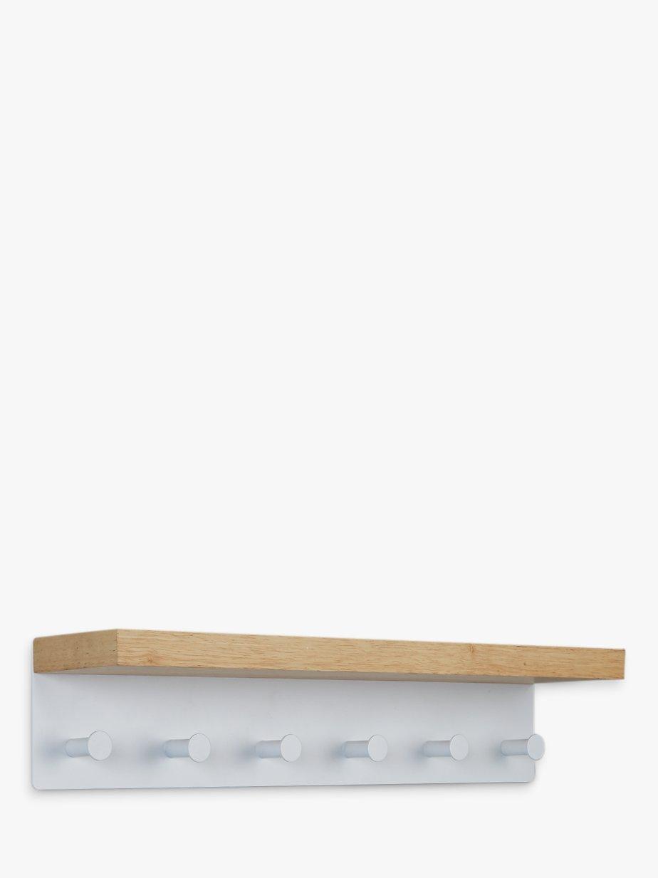 An all-in-one hallway storage solution which combines a rubberwood shelf and metal frame fitted with 6 hanging racks.