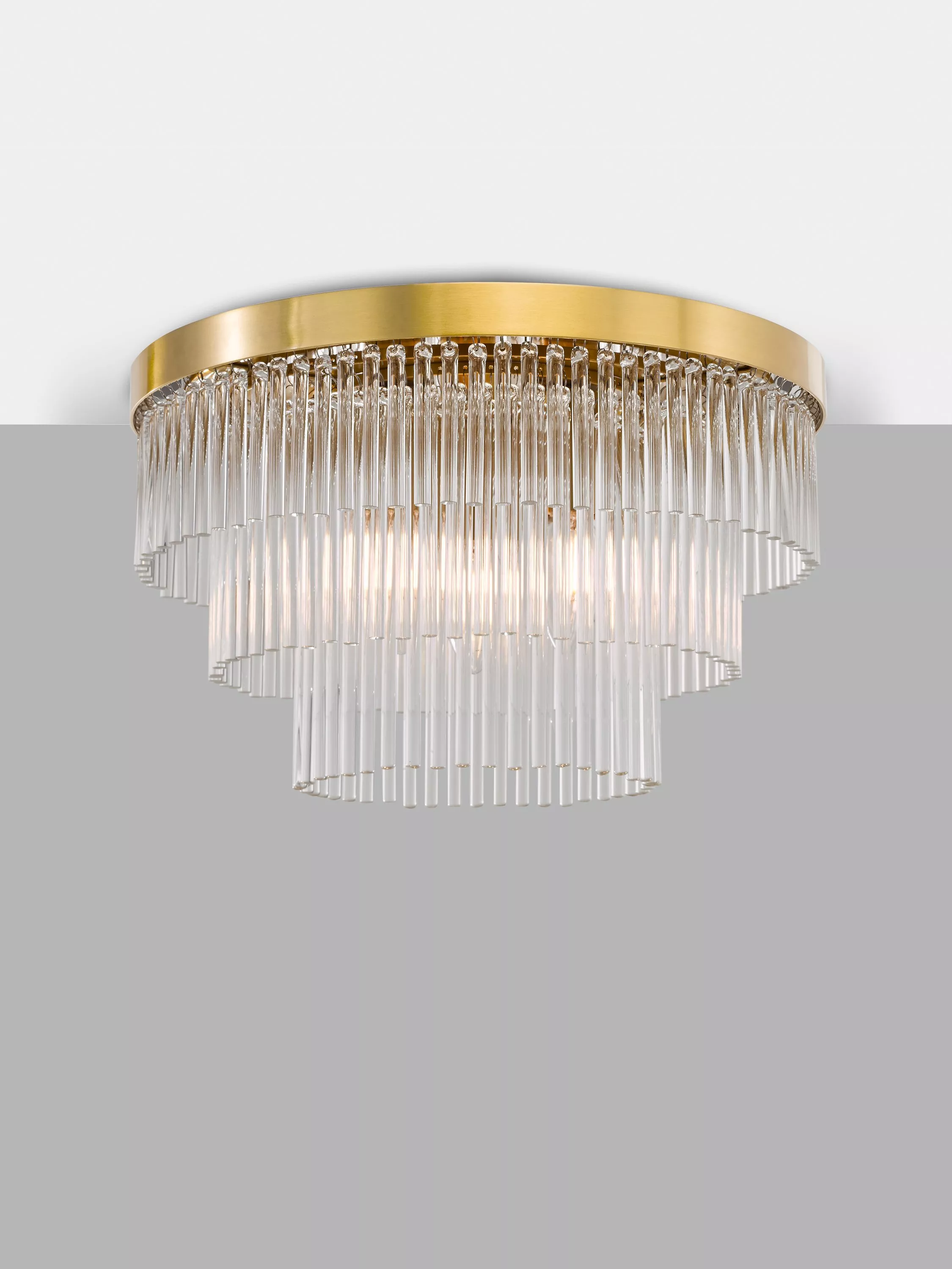 Make a statement with the stunning Shiminista chandelier-style flush ceiling light. Finished in a warm matte brass with layers of clear crystal rods, this ceiling light is a real focal point for a room, bringing sophistication and elegance to your home.
