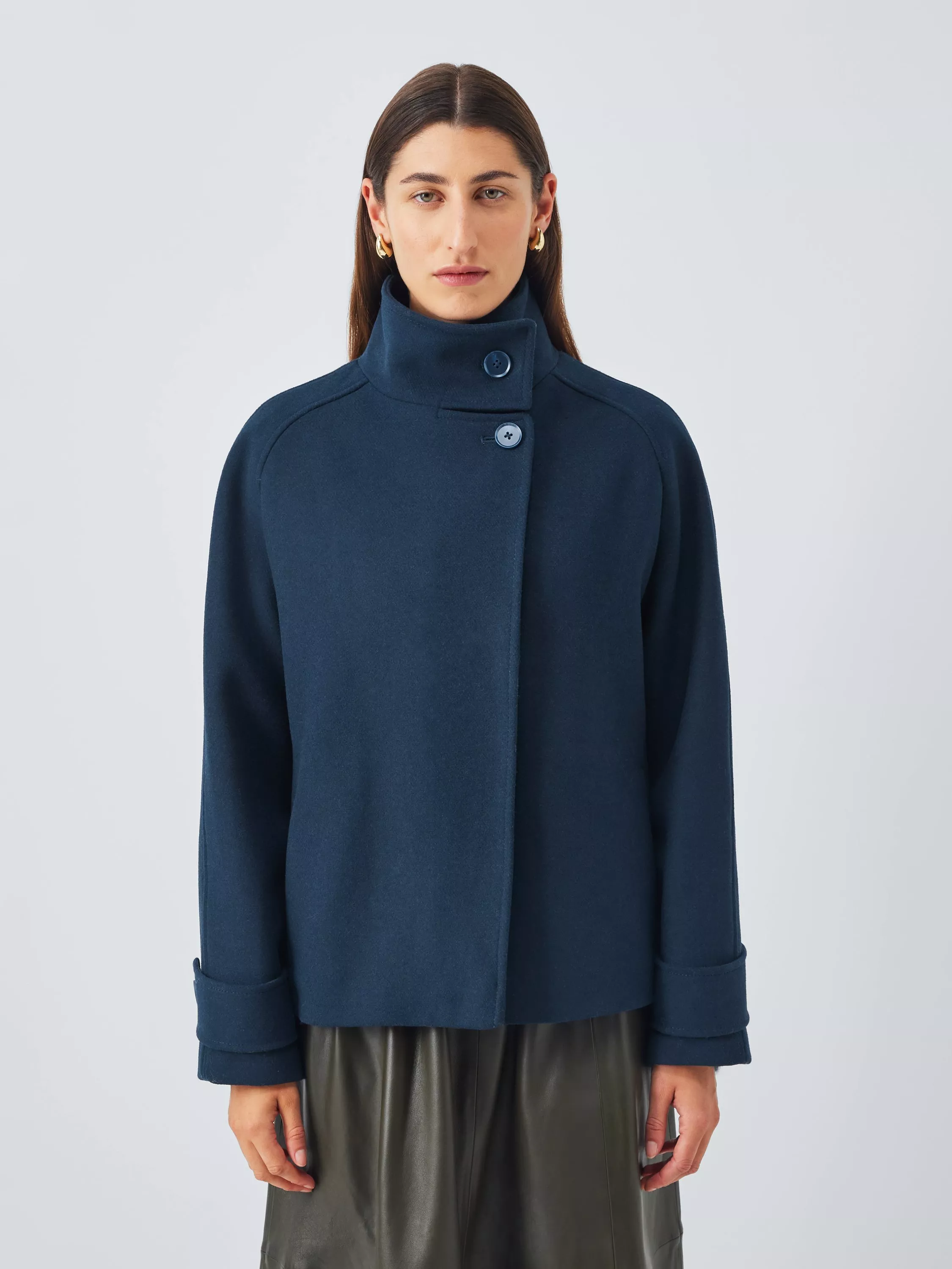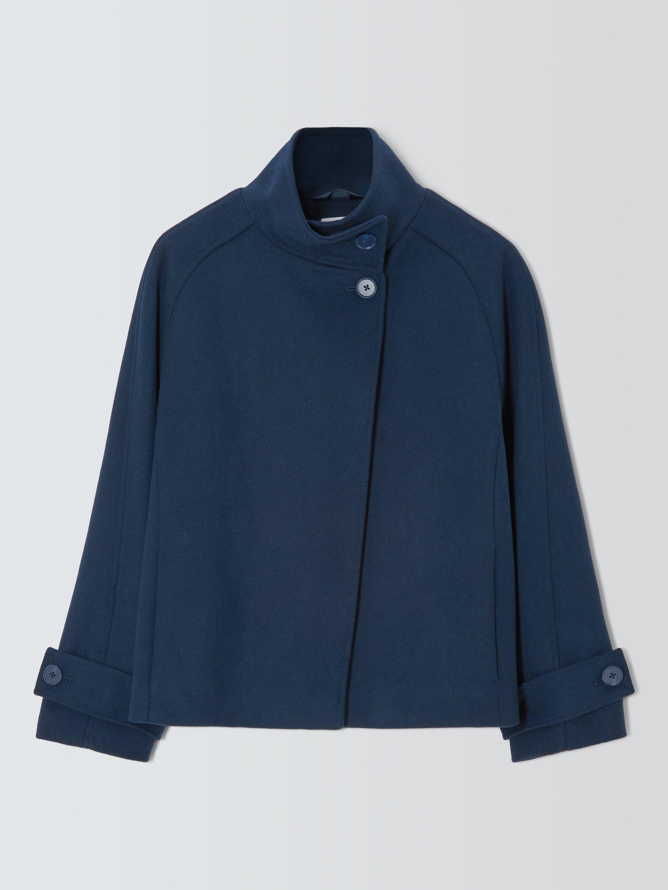 Soft, warm wool-blend jacket with a funnel neck. The asymmetrical short wrap front seals in warmth with button details at the neck echoed on the cuffs.