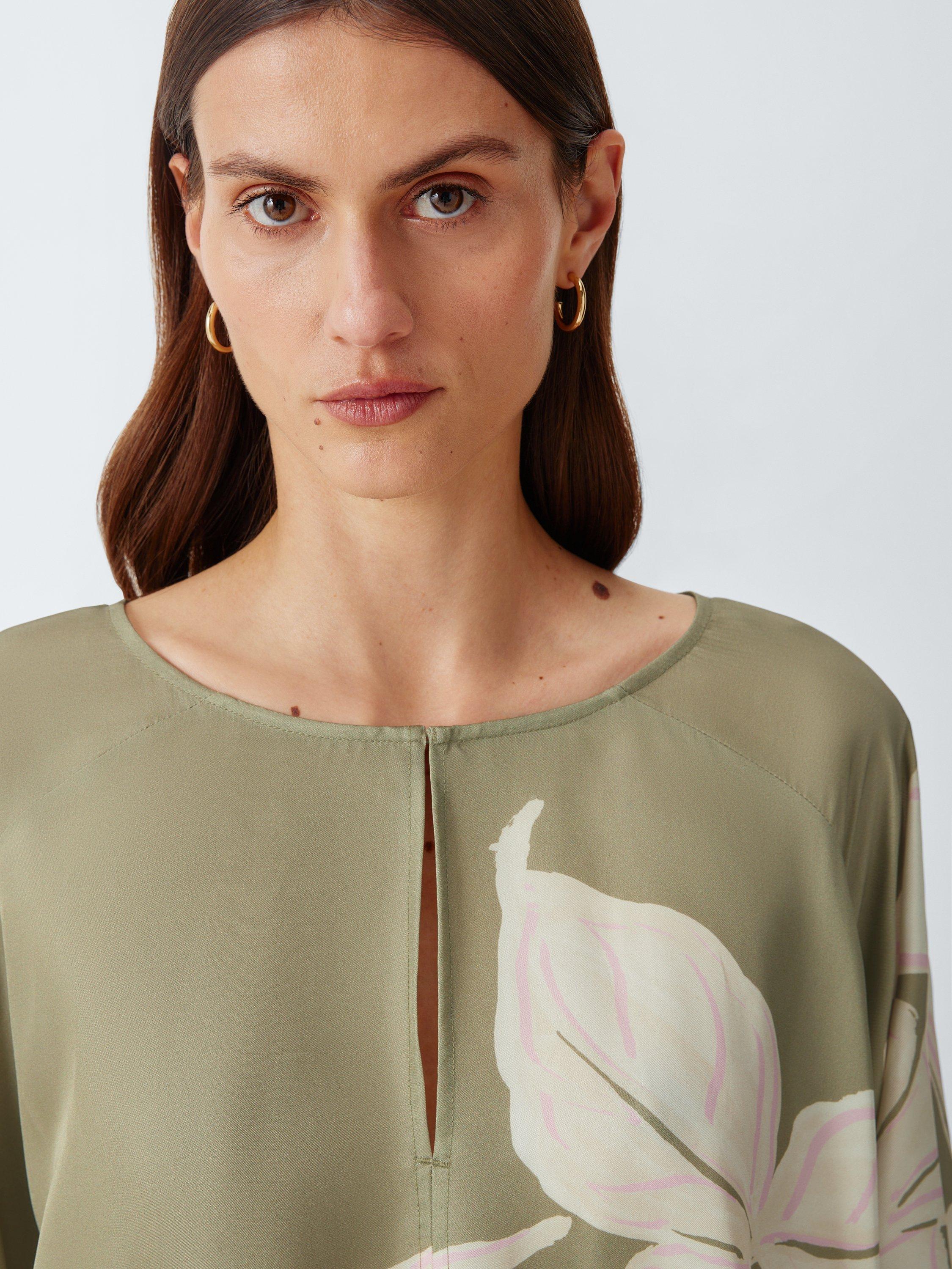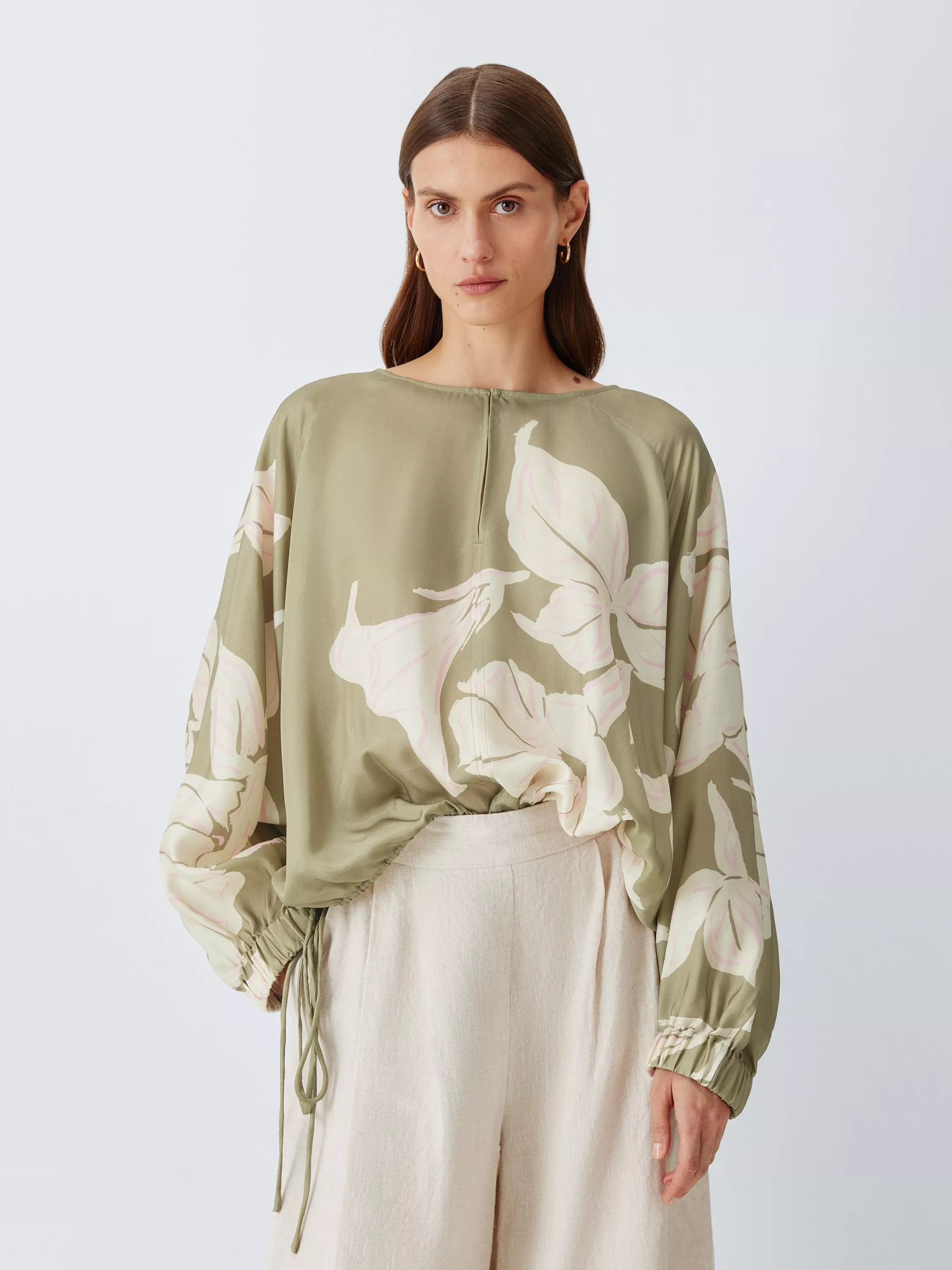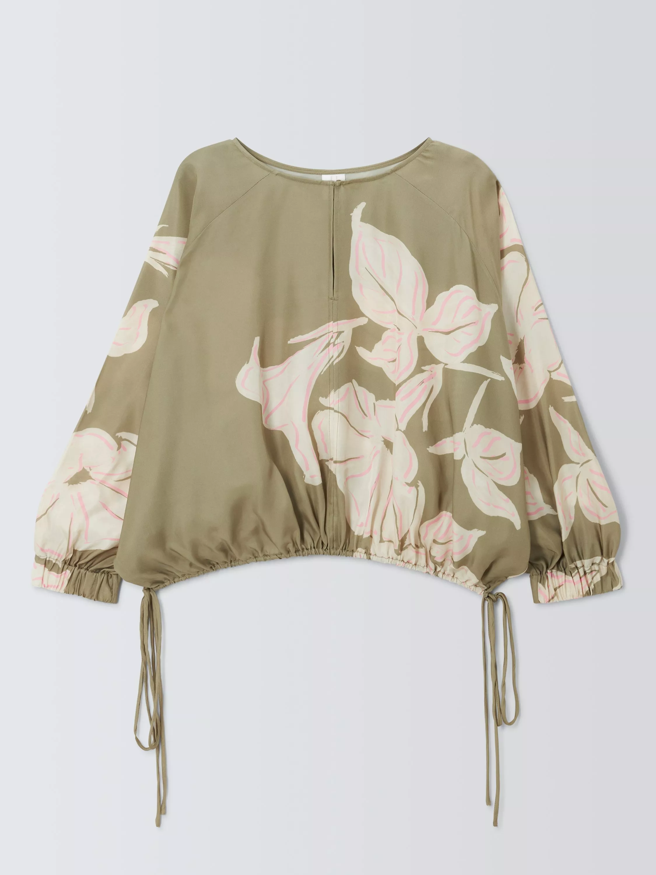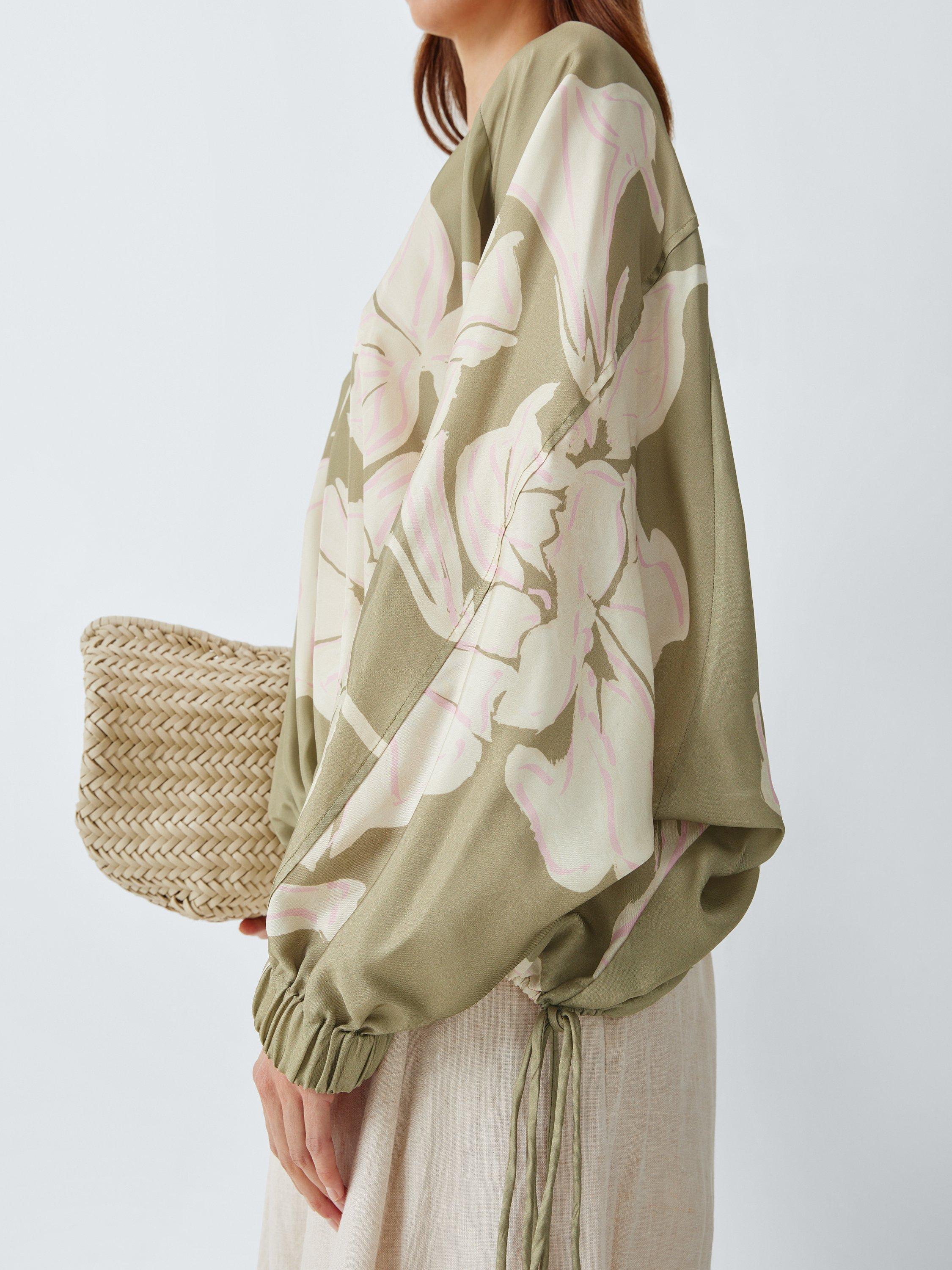 The silhouette is thoughtfully detailed with relaxed raglan sleeves and functional side ties, allowing you to customise the volume for a bespoke blouson effect. Set against a muted sage base, the soft pink botanicals offer a sophisticated heritage palette that feels both fresh and timeless. A confident, feminine piece that brings a sense of modern character to high-waisted tailoring.