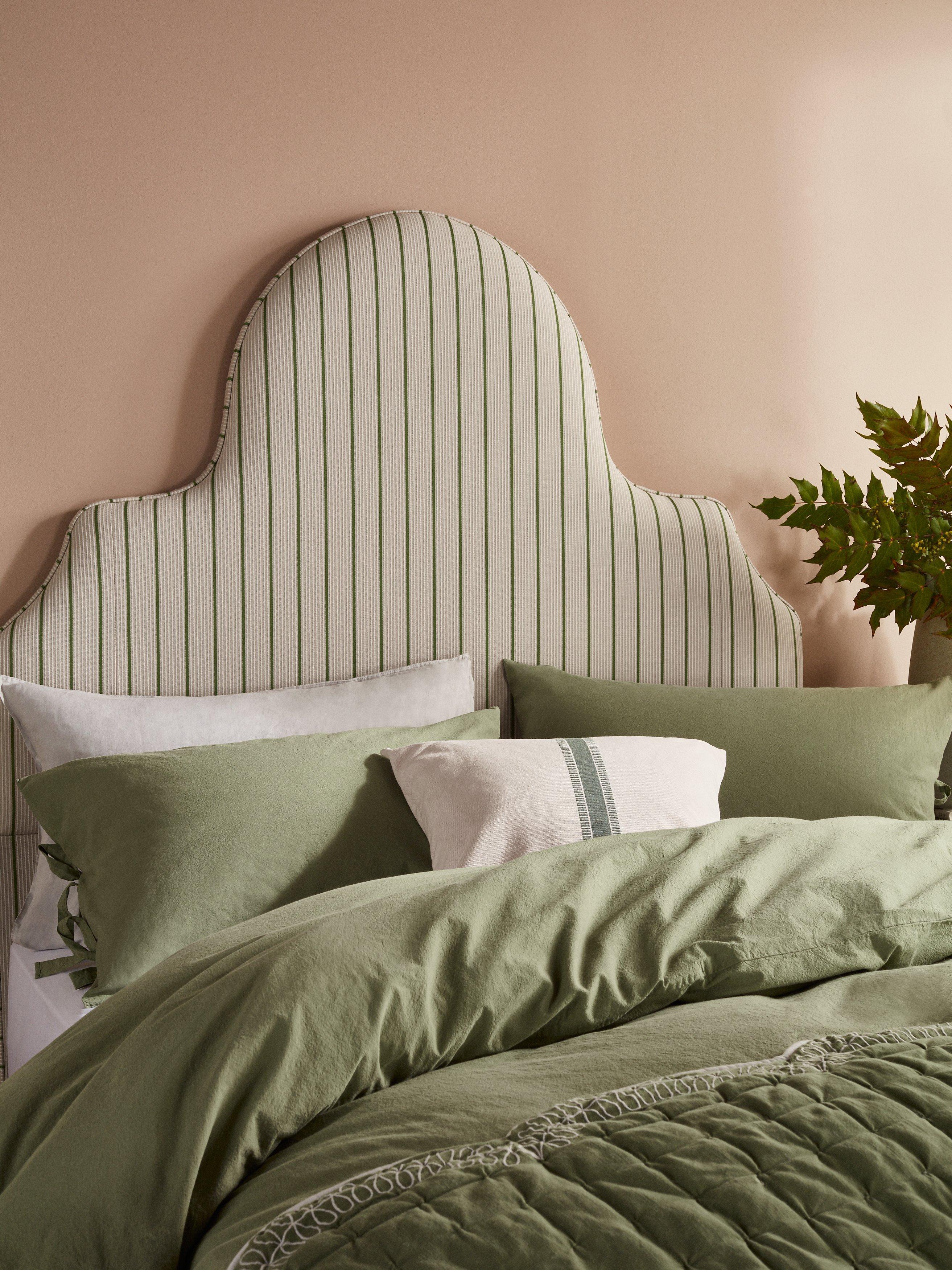 Made in the UK, our Silhouette headboard is upholstered in our classic ticking stripe fabric, made from recycled fibres. The headboard is tall and Art Deco in design with feature piping around the edge, creating a stunning focal point in any bedroom. A full-depth headboard that's padded for comfort, with easy assembly using the headboard bolts that are included with your divan base.