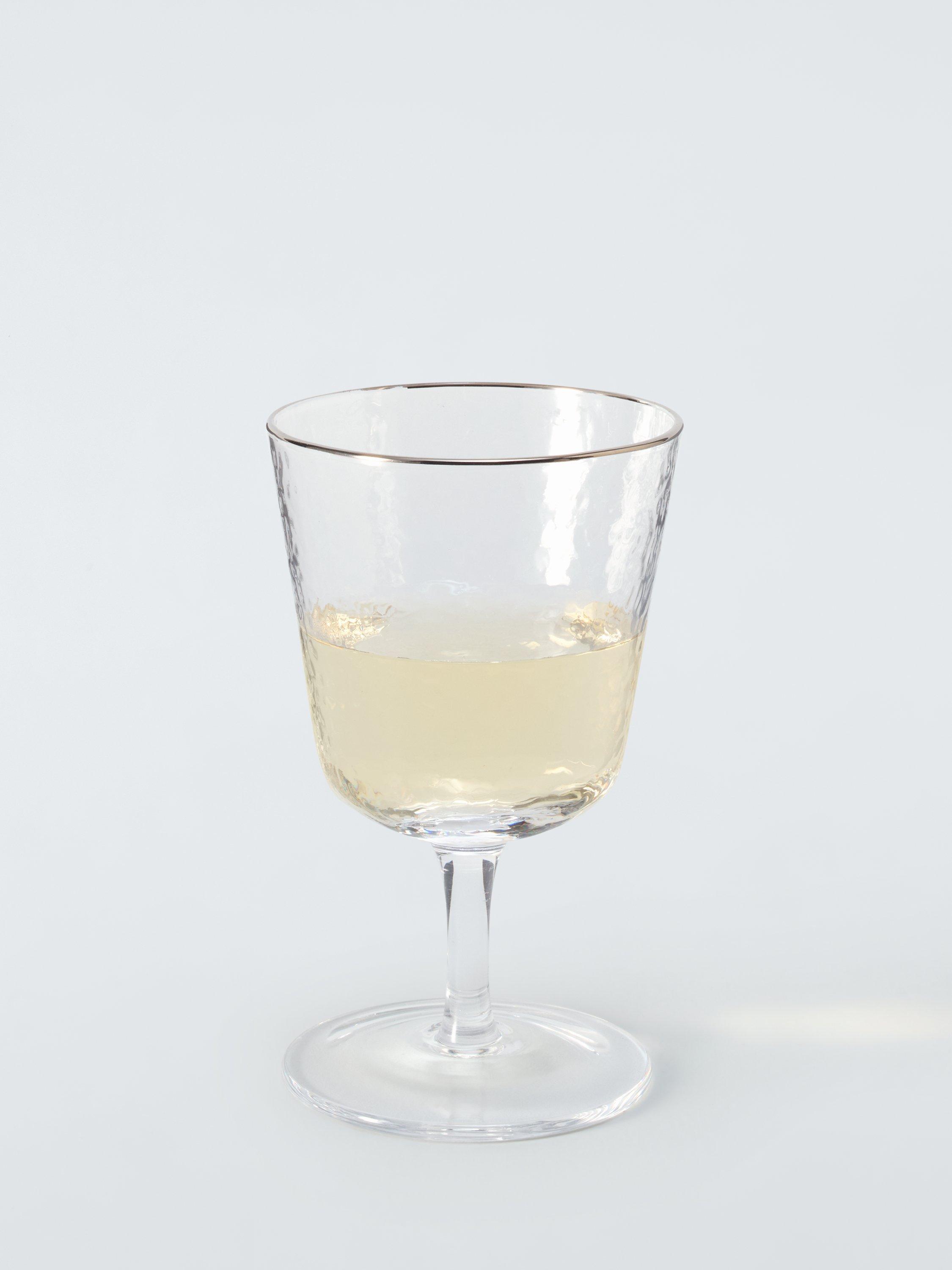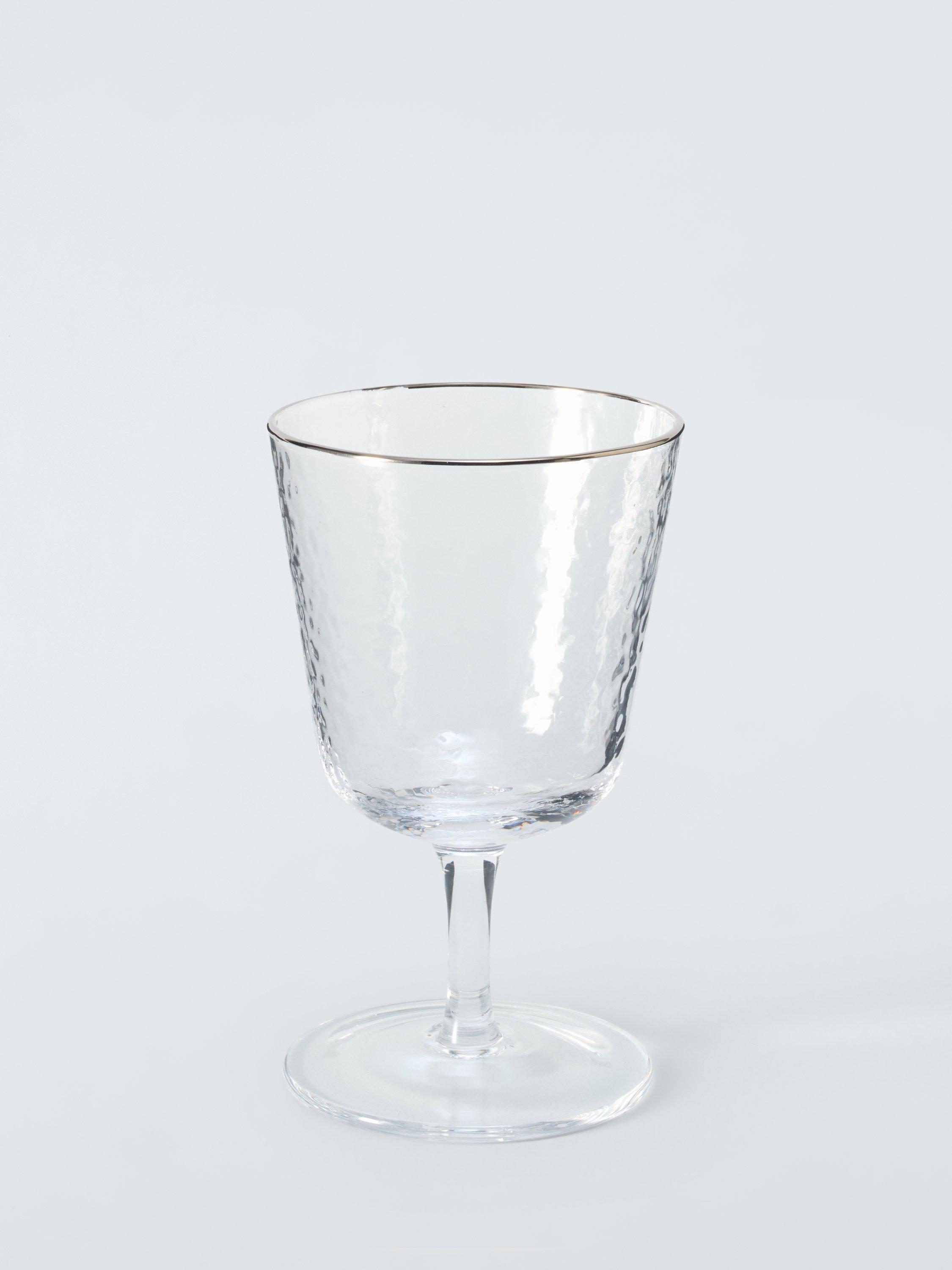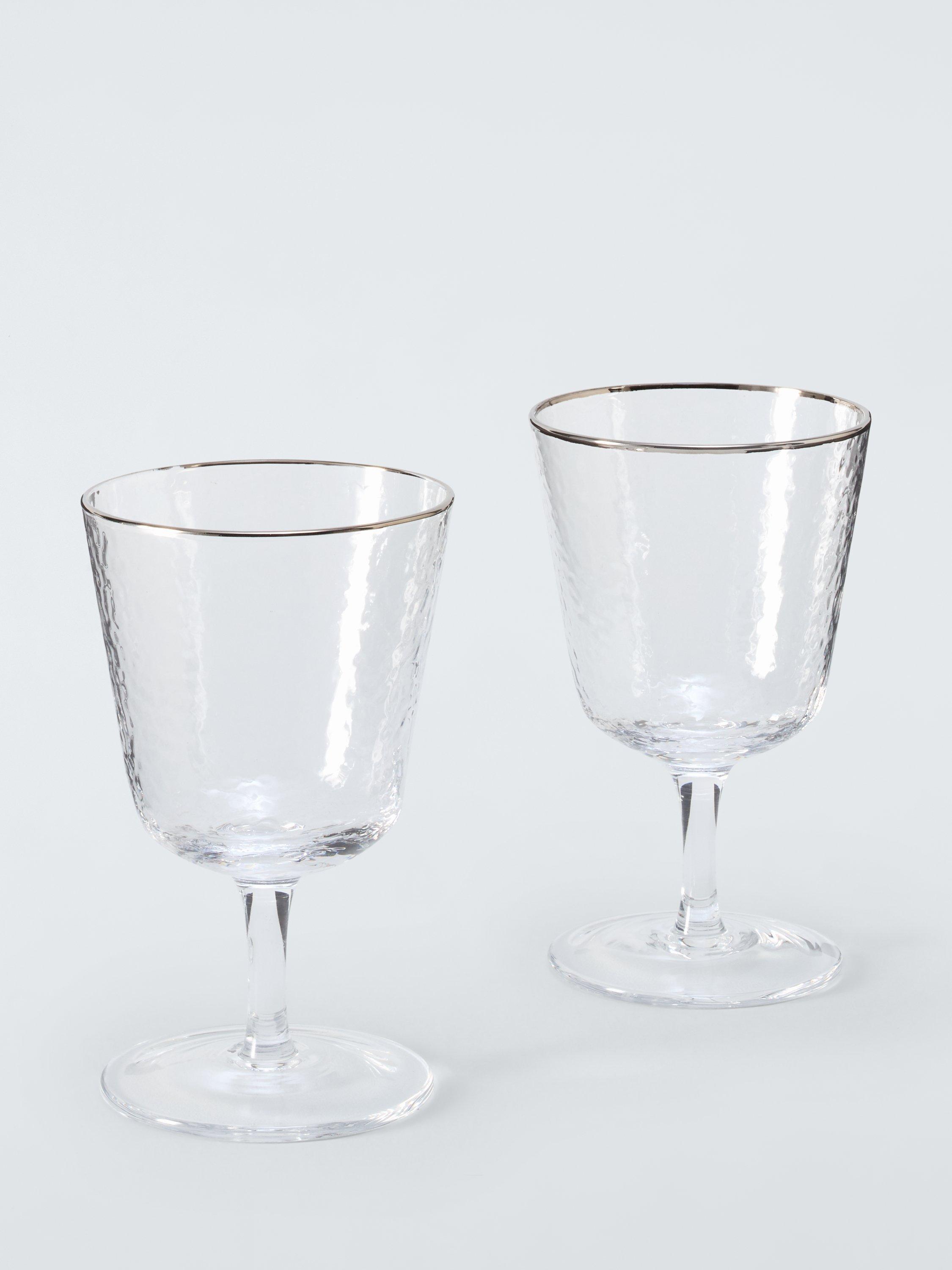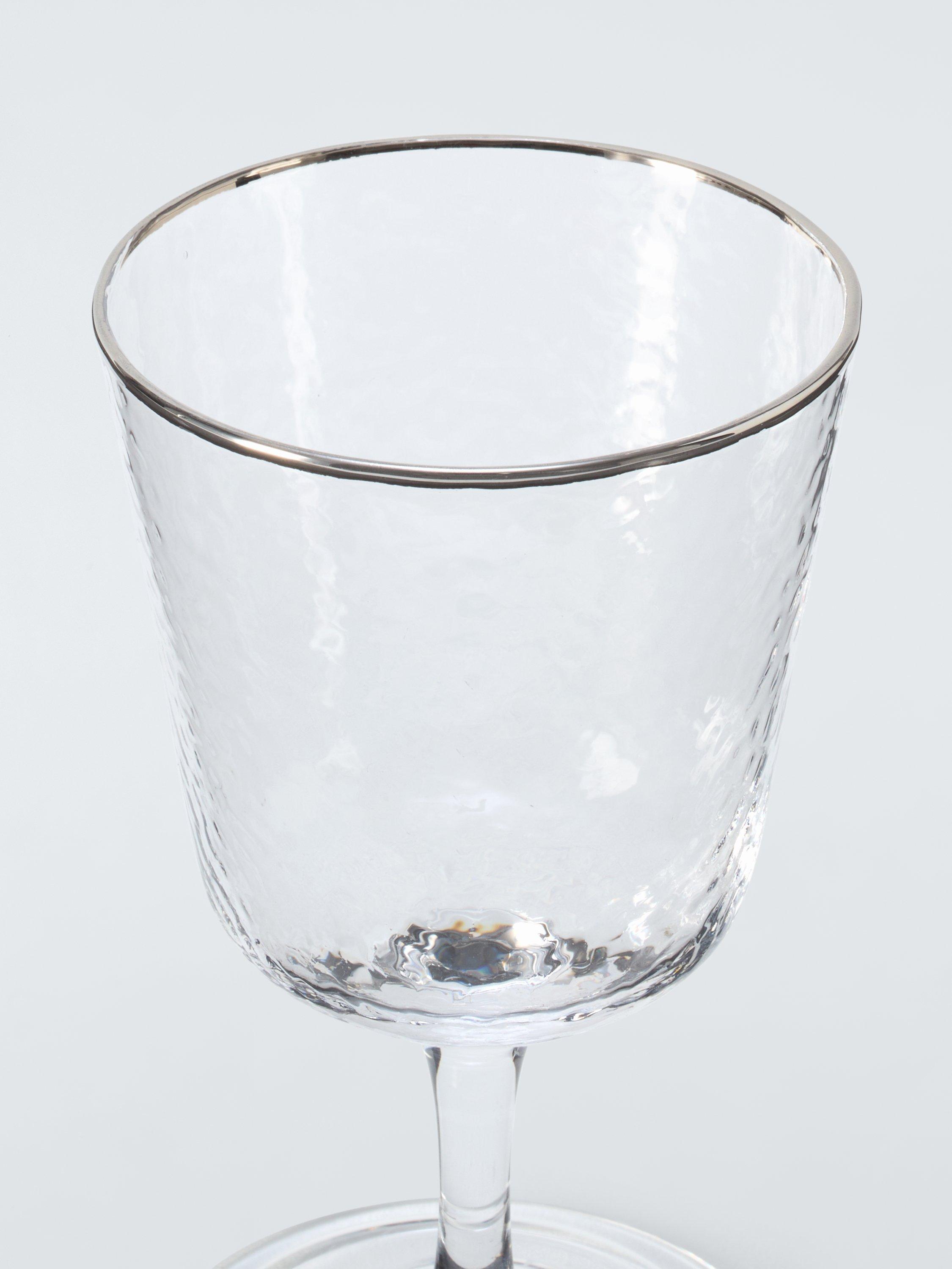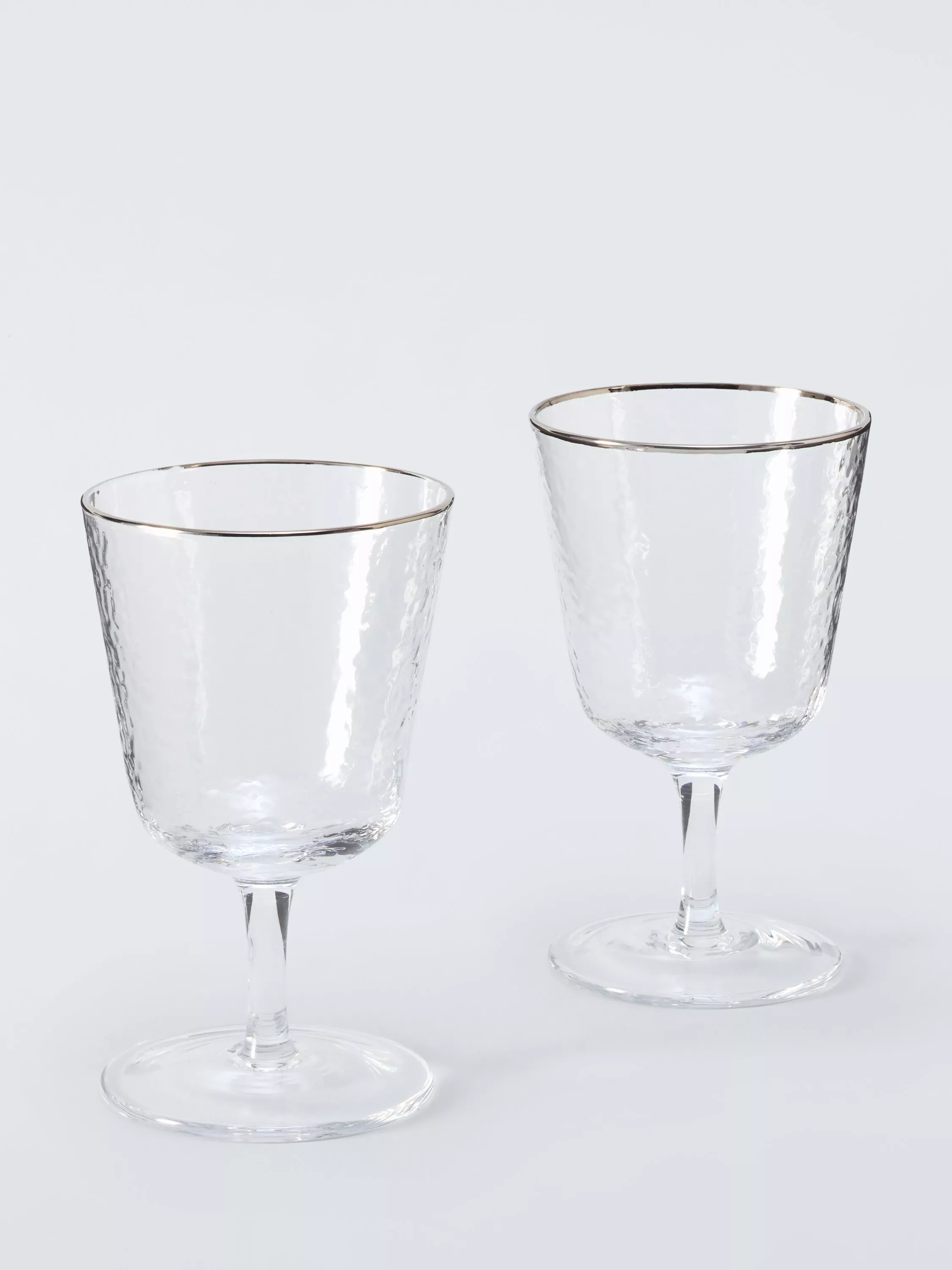 Pair of hammered-texture wine glasses with short stems and glinting silver rims.
